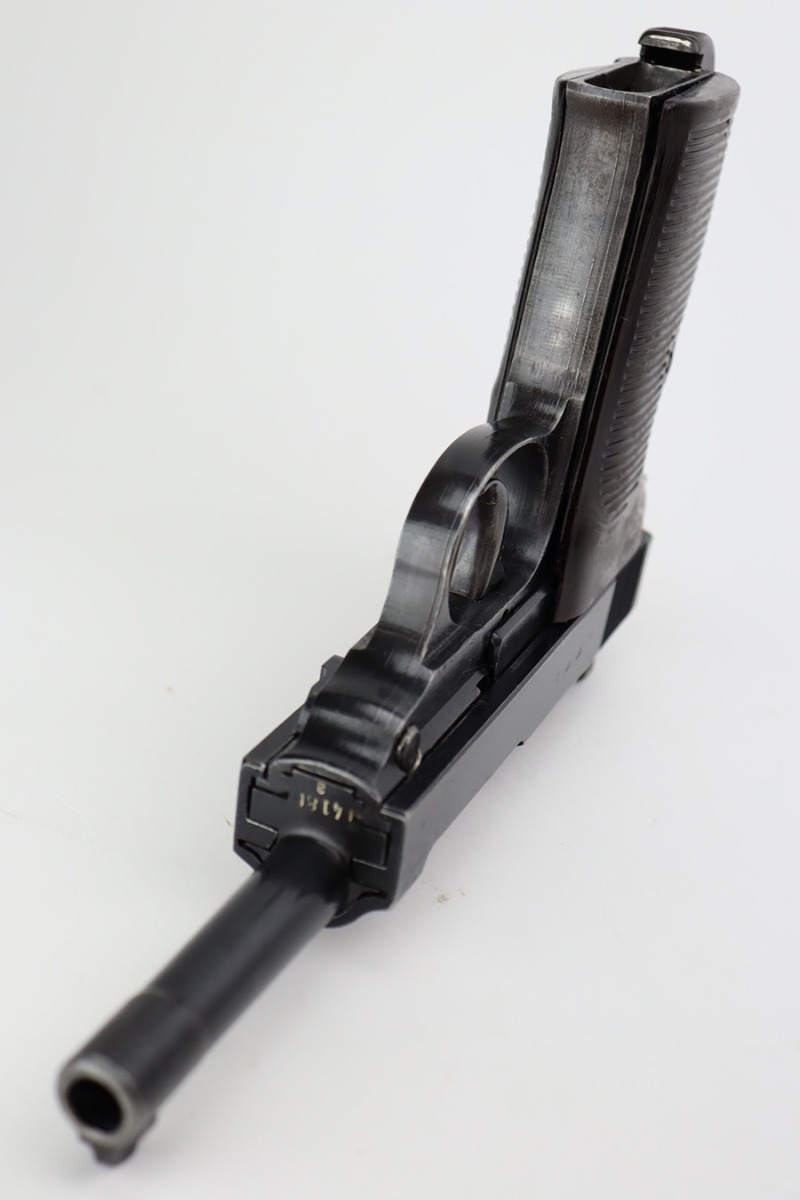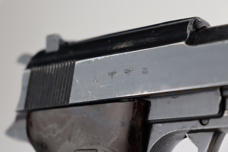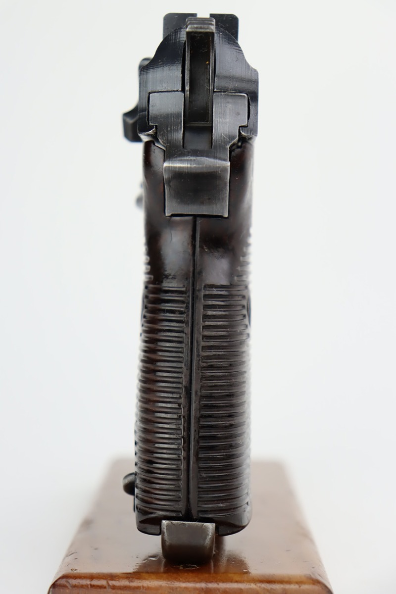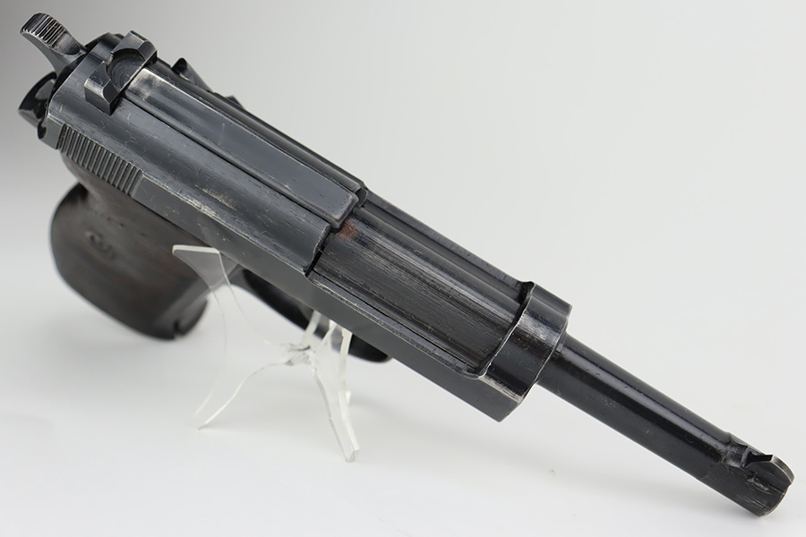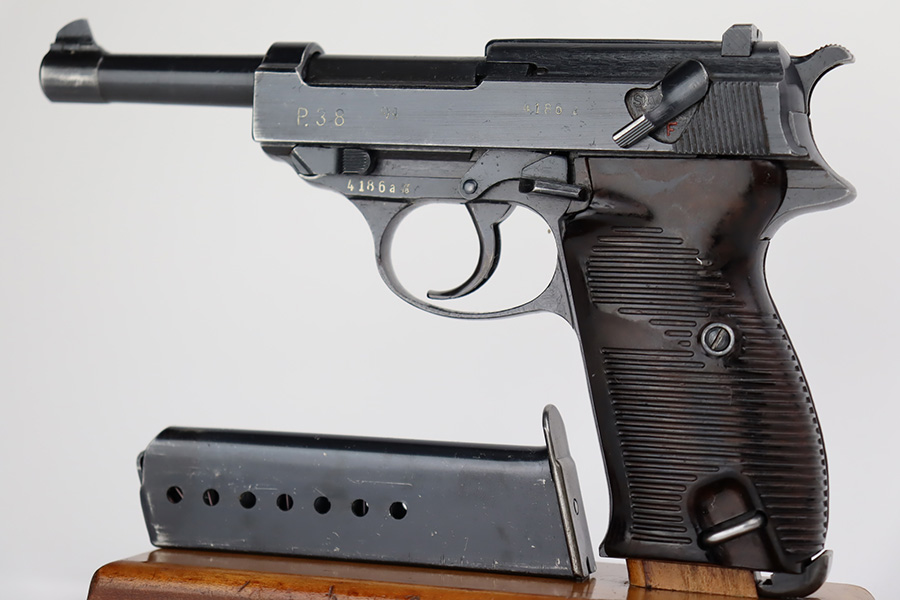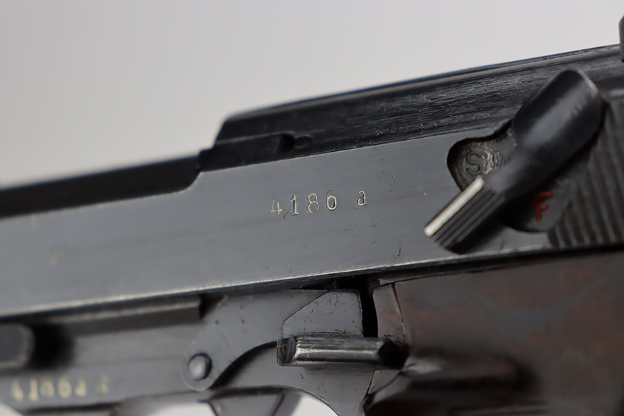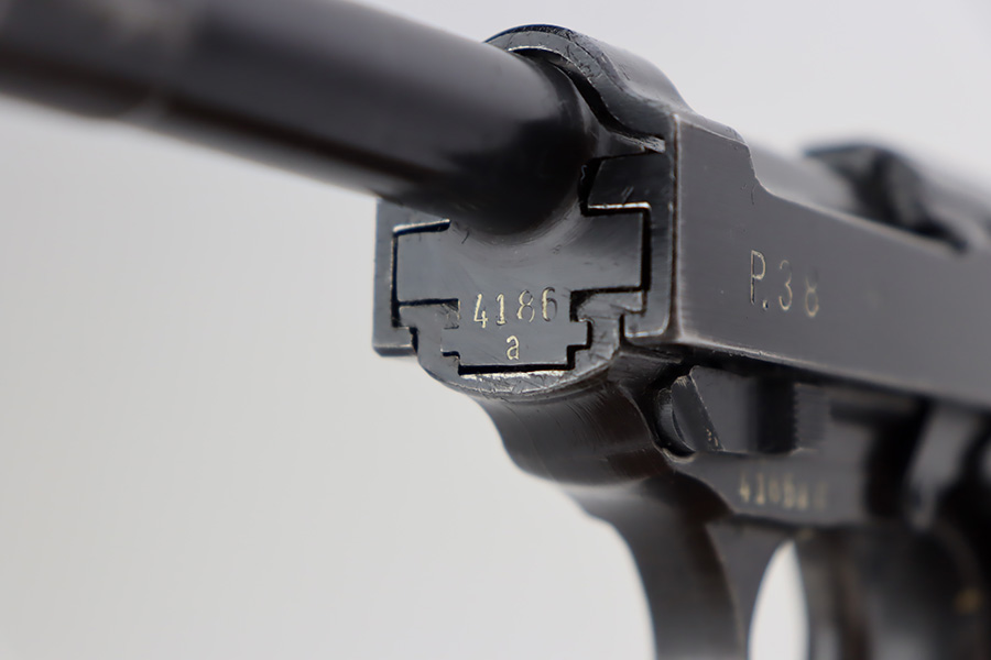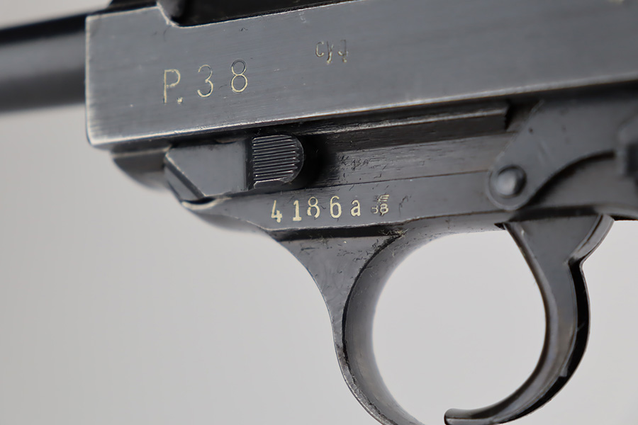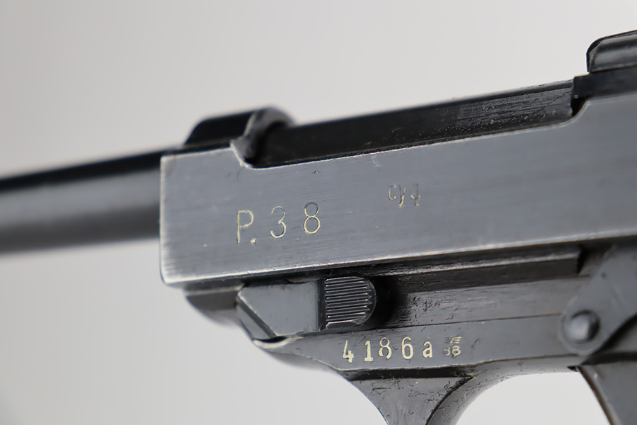 10/10/23 – This is a nice Spreewerk P.38 issued to the Nazi military in March of 1943. All matching the with proper “Eagle 88” military proofs throughout. This is a scarce example with four stamps on the right side of the slide, and the earliest documented example. The bluing rates roughly 85%. The majority of the finish loss is on the front strap, but there is also very minor wear around the muzzle and on the high edges of the slide. Some tiny scratches on both sides of the slide. Fitted with period-correct blackish-brown bakelite grips and comes with an un-marked magazine. Mint bore. De-cocker is functional.