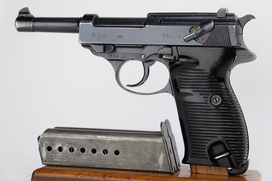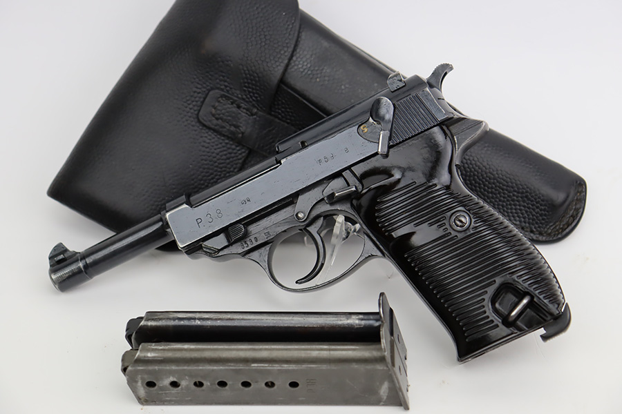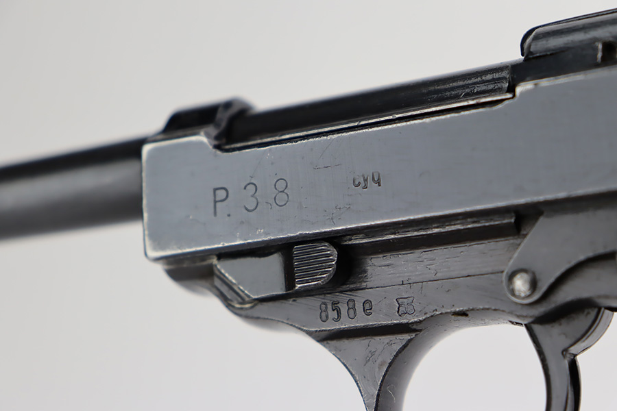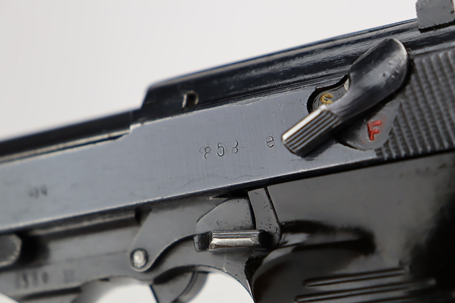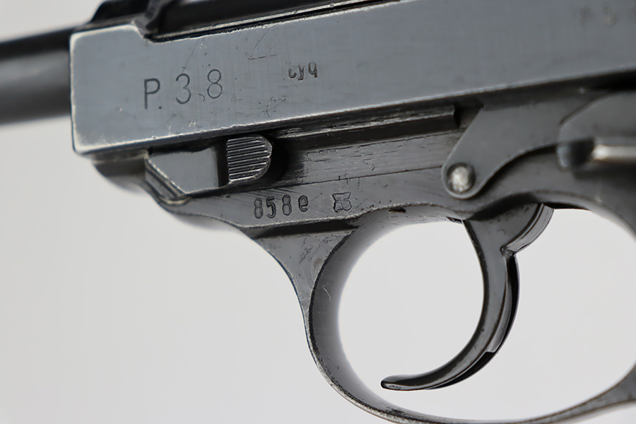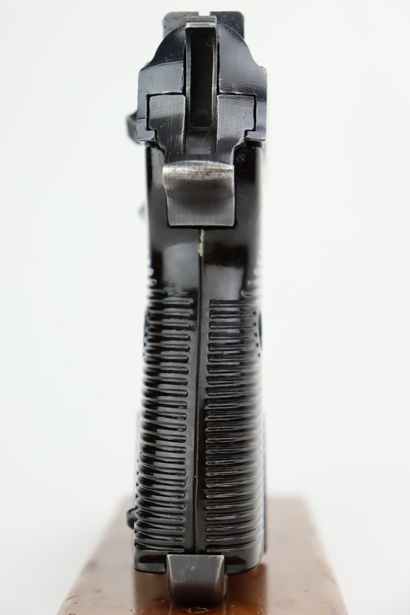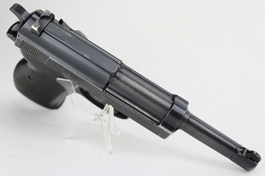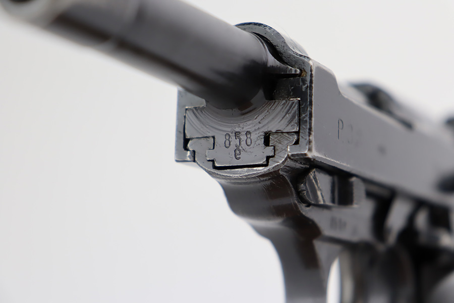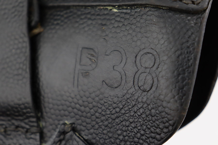 9/19/23 – This is a very nice example of a Spreewerk P.38 issued to the Nazi military in July of 1943. It is all matching with the proper “Eagle 88” proofs throughout. It comes as a rig with a nice 1944-dated pebble grain holster, one jvd magazine, and one rare, late-war, phosphate, “U” marked magazine. The gun itself has retained about 93-94% of its original wartime finish. There is very minor thinning on the front strap and minor wear around the muzzle and on the high edges of the slide. While there isn’t much actual finish loss, there are noticeable casting flaws along the right side of the slide. Fitted with excellent period-correct black bakelite grips. The bore has great rifling, but there is minor freckling throughout. De-cocker is functional.