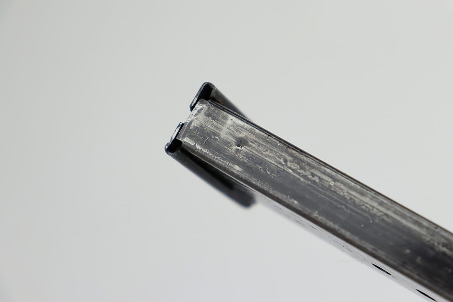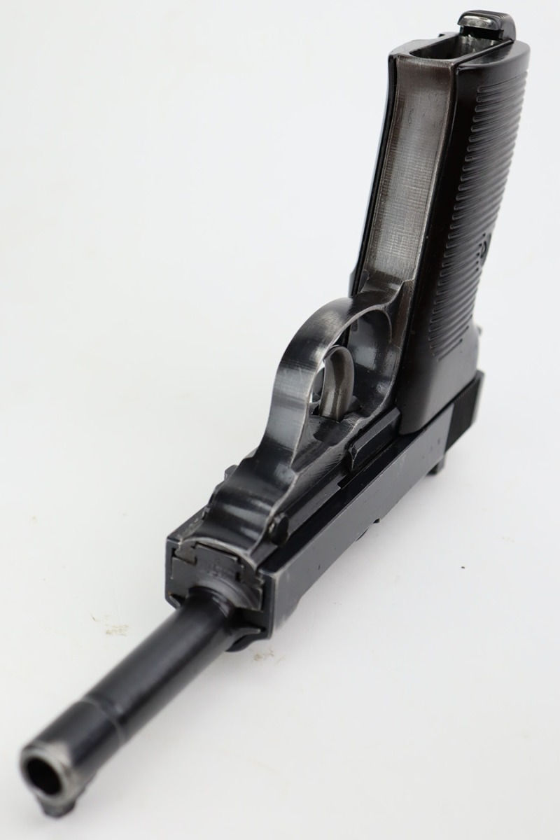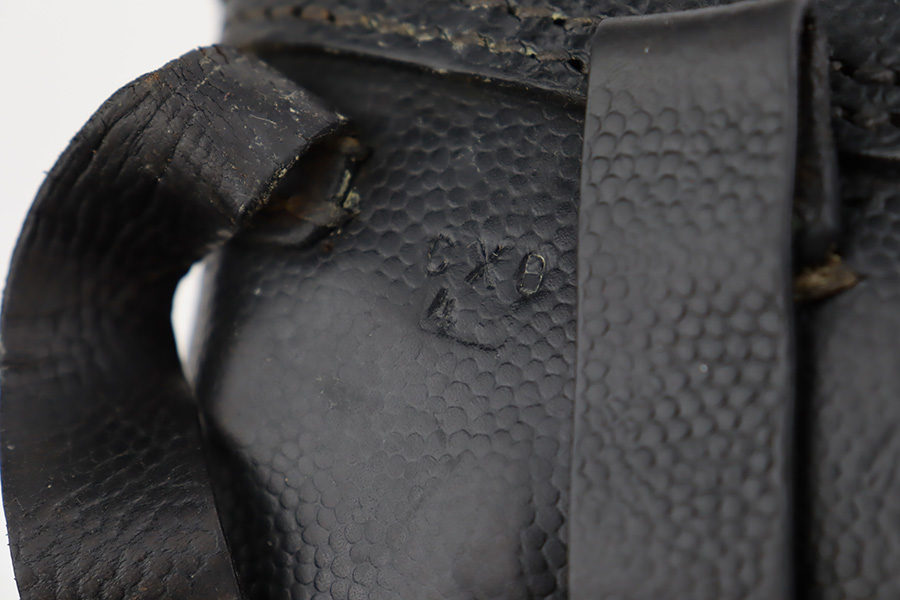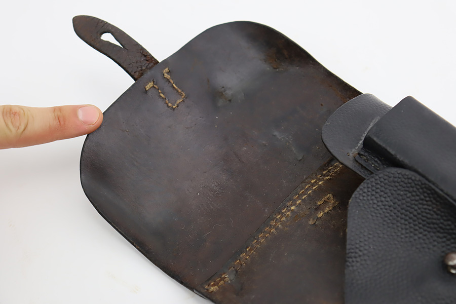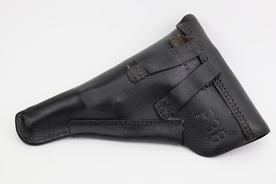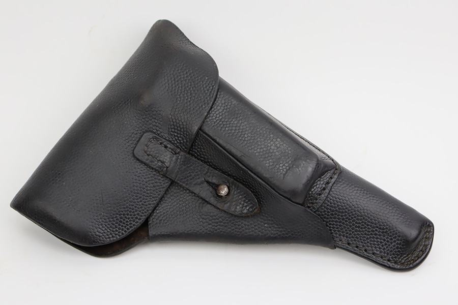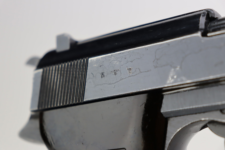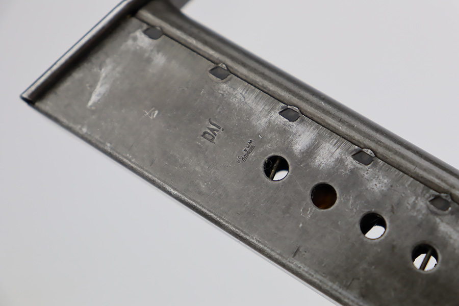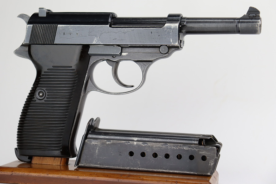 9/19/23 – This is a very nice example of a Spreewerk P.38 issued to the Nazi military in July of 1943. It is all matching with the proper “Eagle 88” proofs throughout. It comes as a rig with a nice 1944-dated pebble grain holster, one jvd magazine, and one rare, late-war, phosphate, “U” marked magazine. The gun itself has retained about 93-94% of its original wartime finish. There is very minor thinning on the front strap and minor wear around the muzzle and on the high edges of the slide. While there isn’t much actual finish loss, there are noticeable casting flaws along the right side of the slide. Fitted with excellent period-correct black bakelite grips. The bore has great rifling, but there is minor freckling throughout. De-cocker is functional.