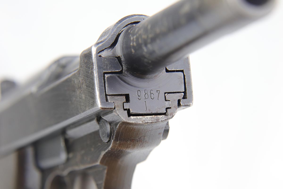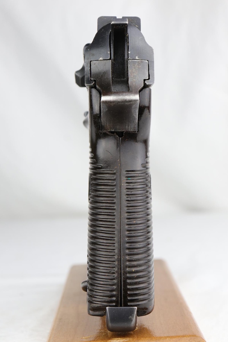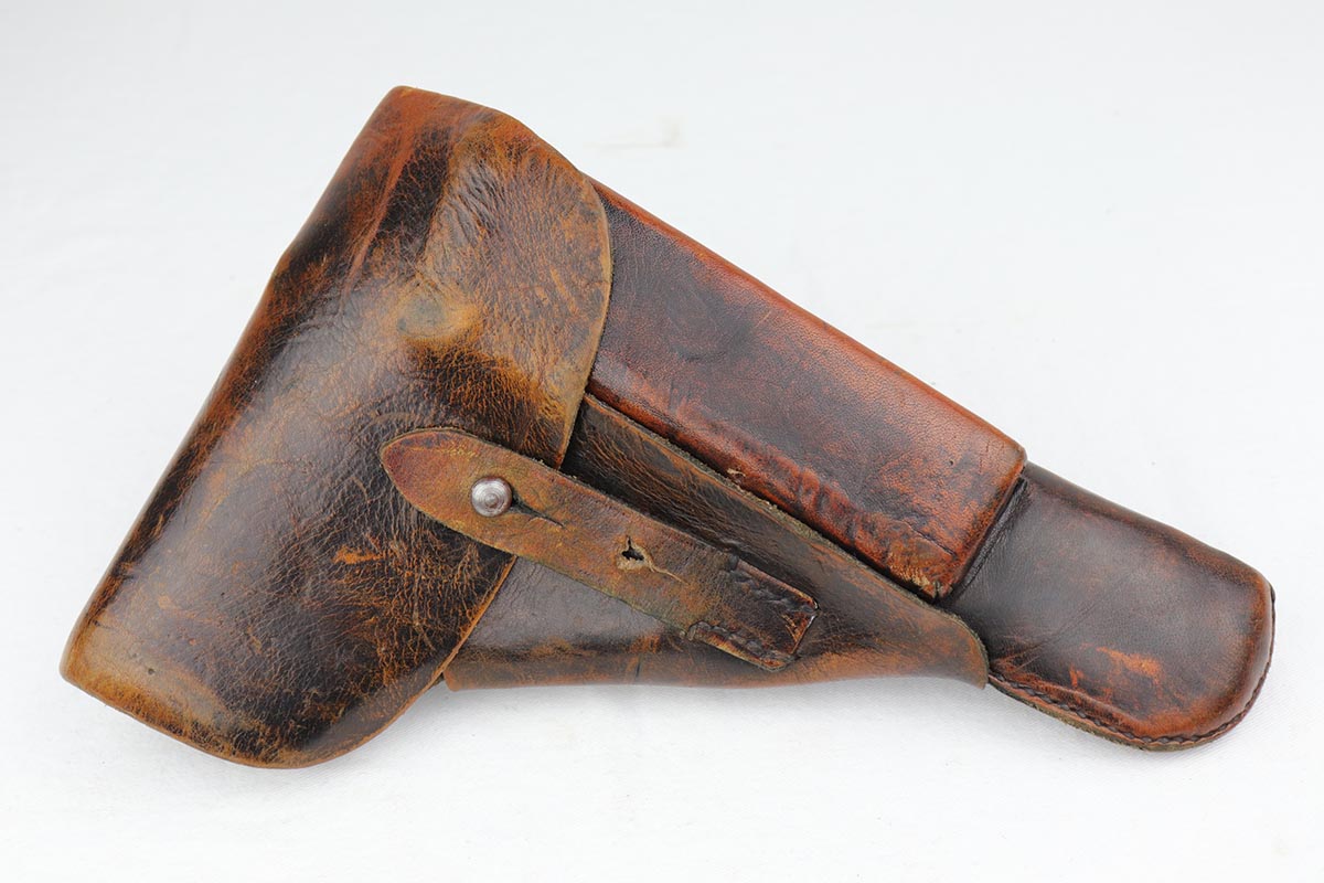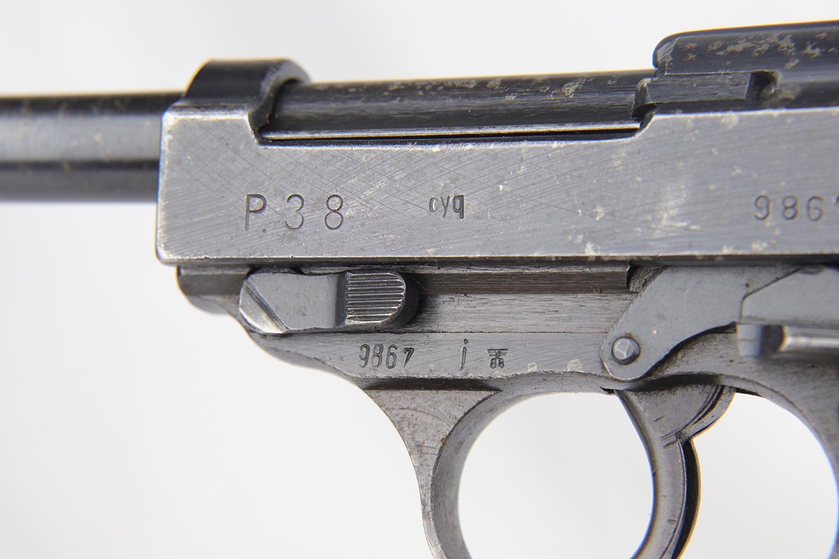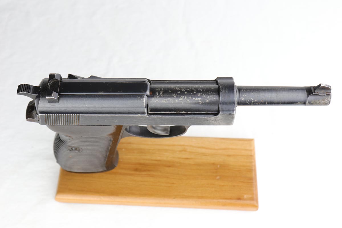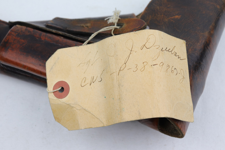 1/18/19 – This is a great example of an original wartime (1943) Spreewerke P.38 Rig. The rig is made complete with the original G.I. tag, serialized to the gun. All parts matching. The overall condition of the gun is about 80-85% with some oxidation mostly along the left side of the slide and top of the gun. This condition is a result you might expect after exposure to salt water. Slight thinning on the front strap. The characteristic Spreewerke machine marks are visible. Walther magazine. The bore is excellent and shiny. The holster is in good condition with waffen mark, date and maker mark. This rig comes to us from the nephew of the vet and accompanies the CZ 27 rig that was listed today.