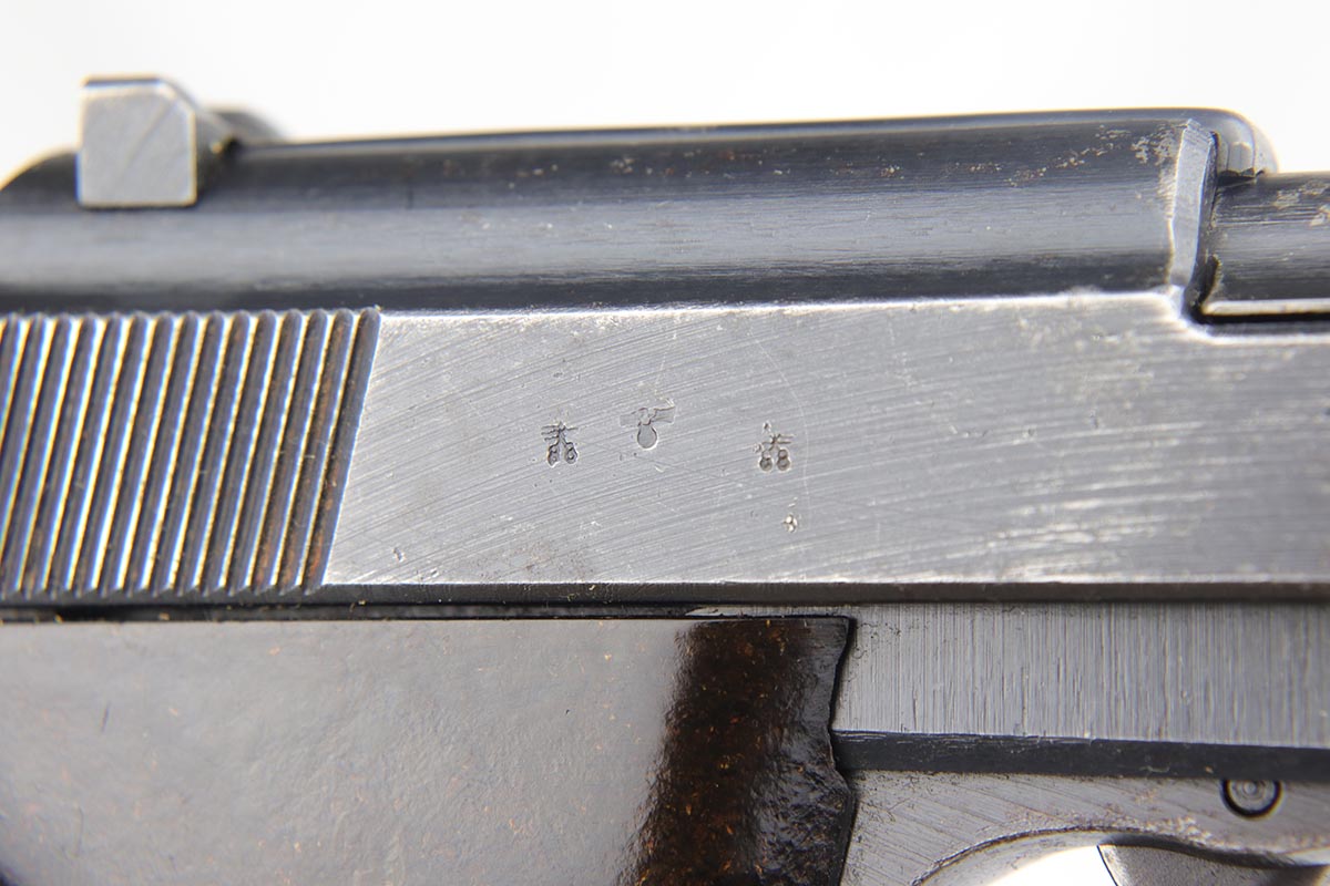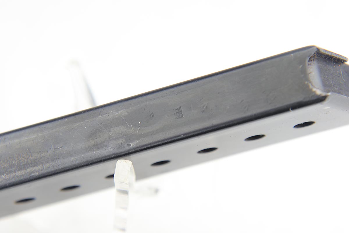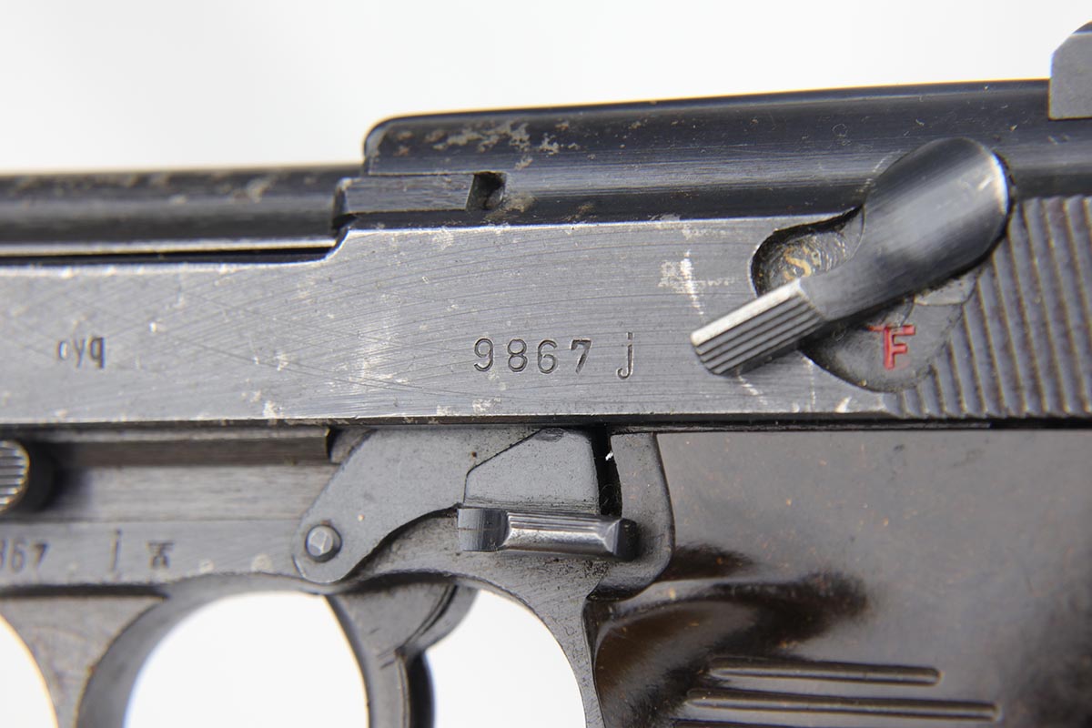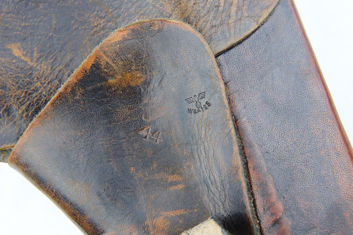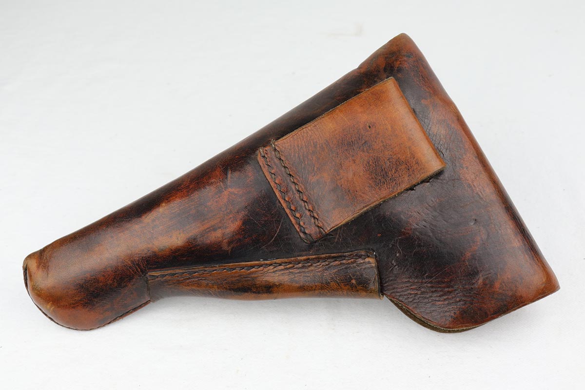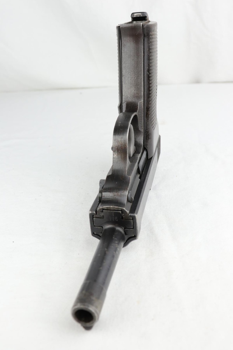 1/18/19 – This is a great example of an original wartime (1943) Spreewerke P.38 Rig. The rig is made complete with the original G.I. tag, serialized to the gun. All parts matching. The overall condition of the gun is about 80-85% with some oxidation mostly along the left side of the slide and top of the gun. This condition is a result you might expect after exposure to salt water. Slight thinning on the front strap. The characteristic Spreewerke machine marks are visible. Walther magazine. The bore is excellent and shiny. The holster is in good condition with waffen mark, date and maker mark. This rig comes to us from the nephew of the vet and accompanies the CZ 27 rig that was listed today.