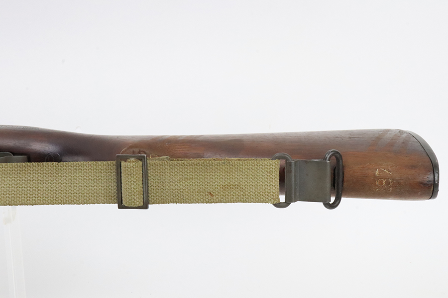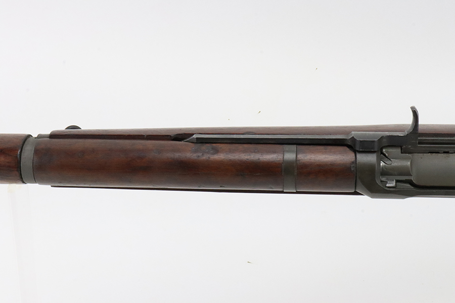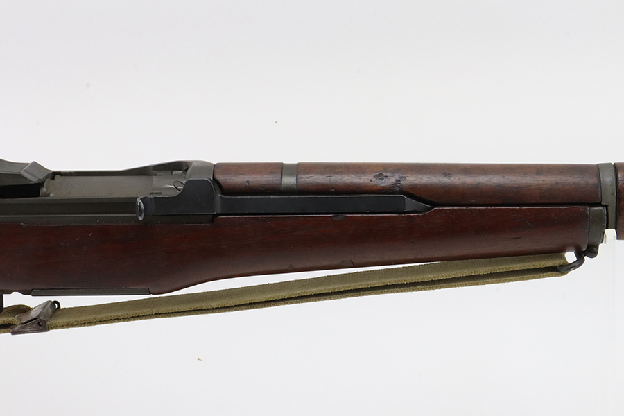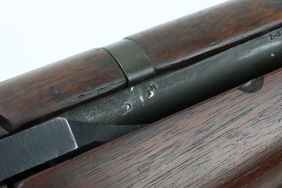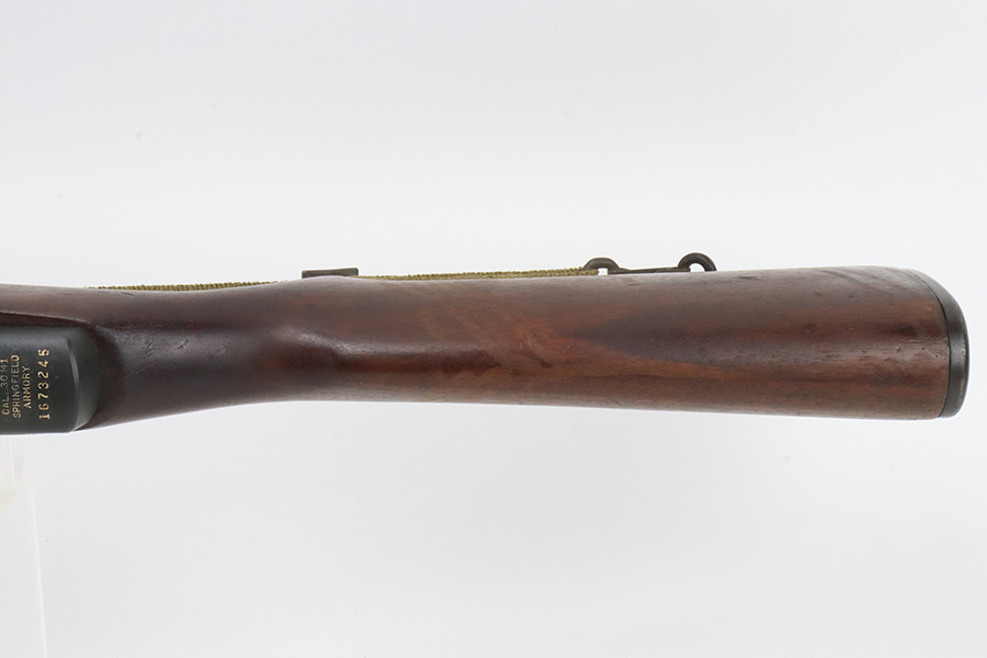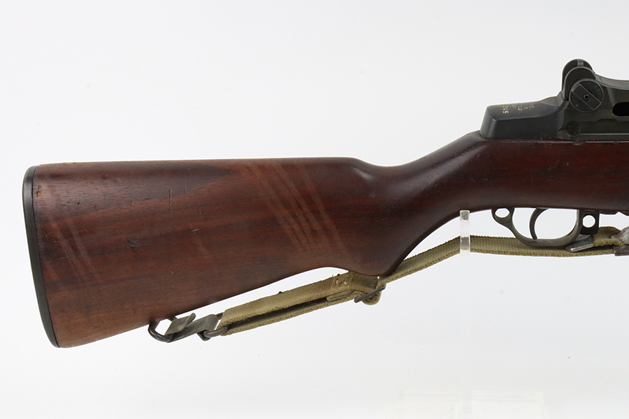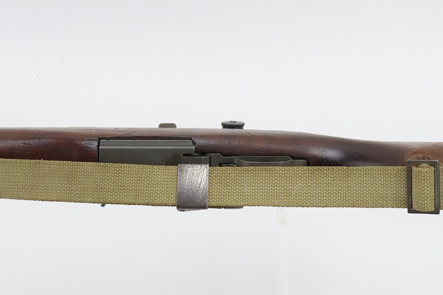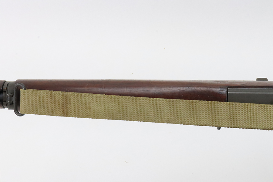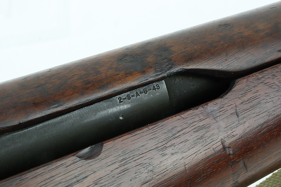 2/3/24 – This is a correct example of a Springfield M1 Garand from 1943. The serial number on the receiver dates to about May of 1943. The barrel is Springfield marked and dated 6-43. The left side of the stock has the proper military cartouches. There are added rack numbers to the bottom edge of the butt stock. The finish on the metal parts rates about 93-95% with just some minor wear on the gas tube. There are tiny scratches and bruises on the wood furniture, a couple of hairline cracks in the upper handguard, and what looks like some water staining on the butt stock. The forward handguard is a little loose. The bore has good rifling with minor pin-pricking throughout. Muzzle reading: 2.5. Throat reading: 2.5.