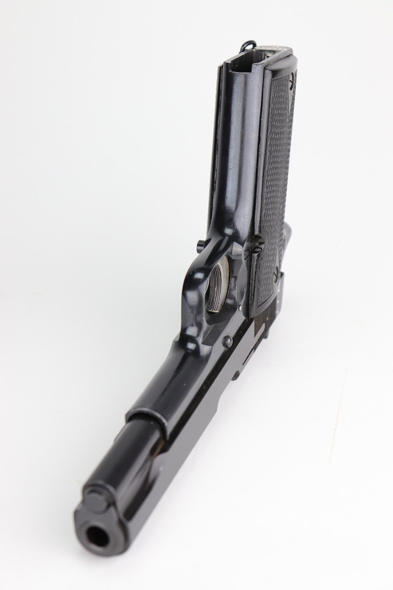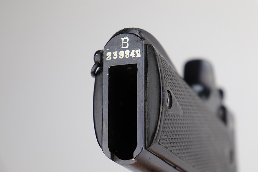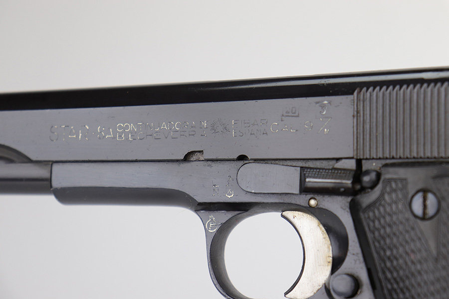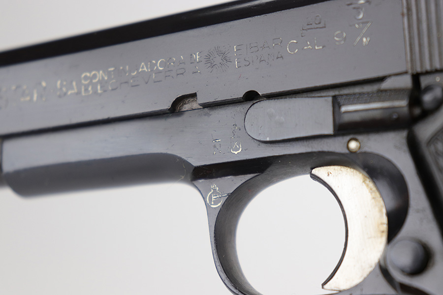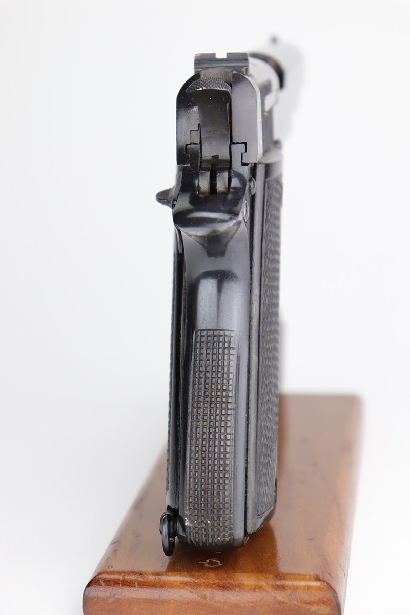 12/19/22 – This is a very nice example of a Spanish Star Model B manufactured in 1943. It is all matching and has a Nazi “Waffen 251” proof on the right side of the tang, but this marking is not original. Import mark on the back strap. The entire gun has been refurbished and refinished. There is virtually no actual bluing loss, but there is a series of tiny dings on the front strap. Fitted with a set of nice black plastic grips. Comes with one proper magazine. The bore is like-new.