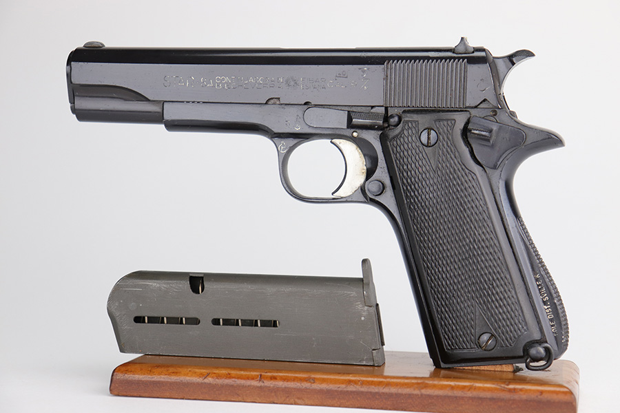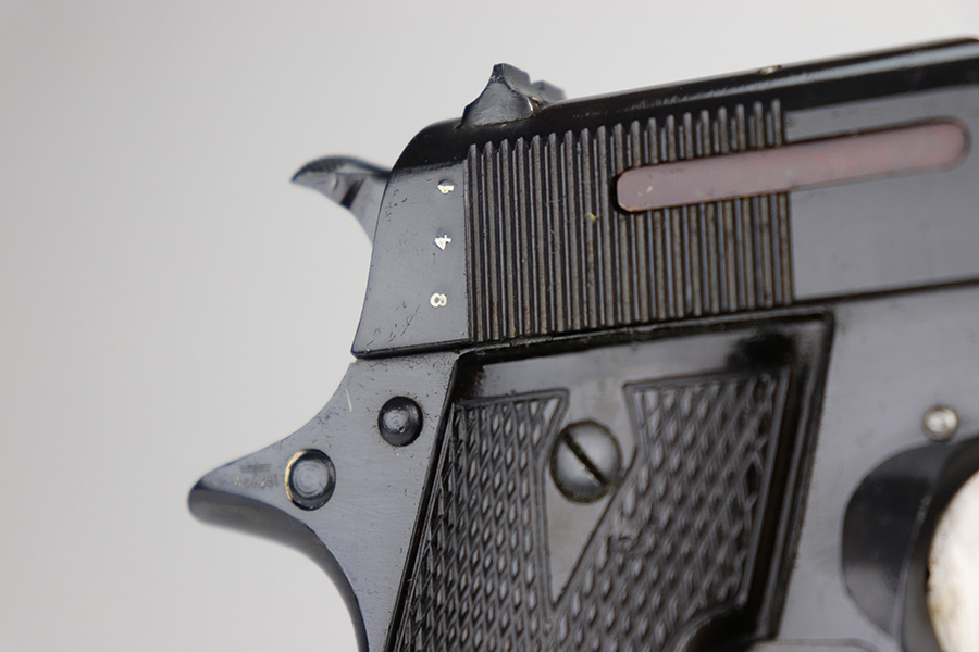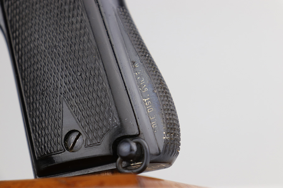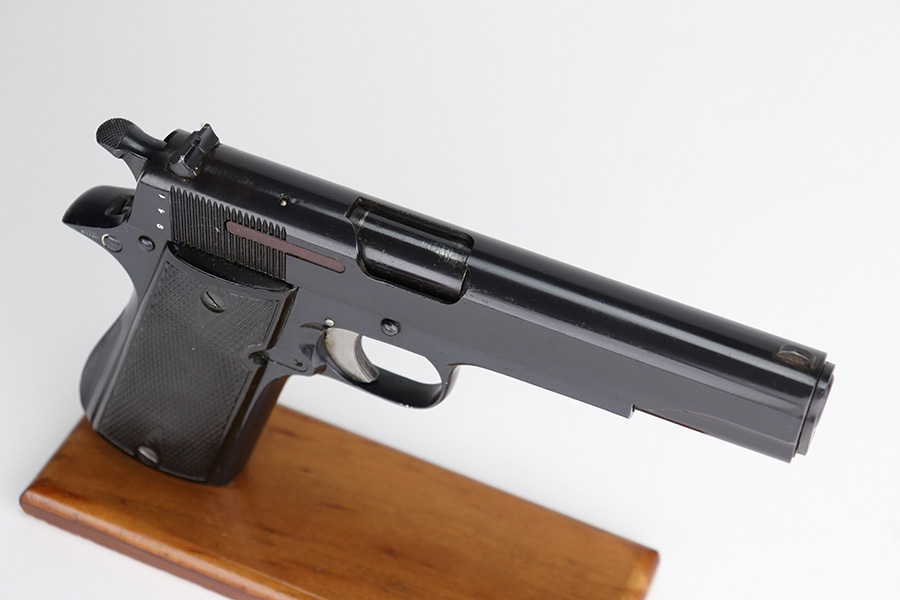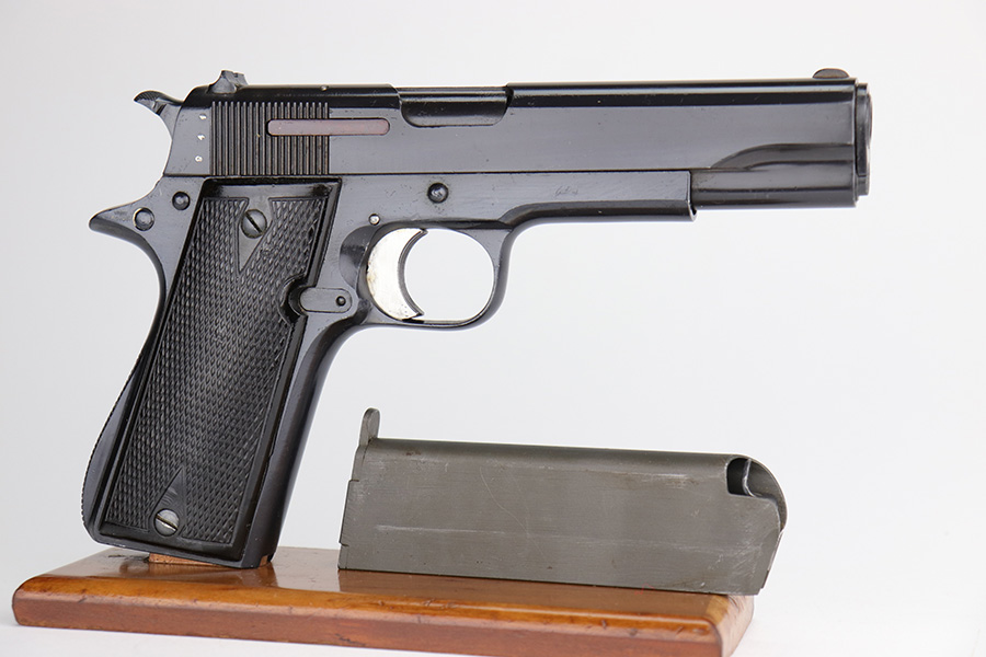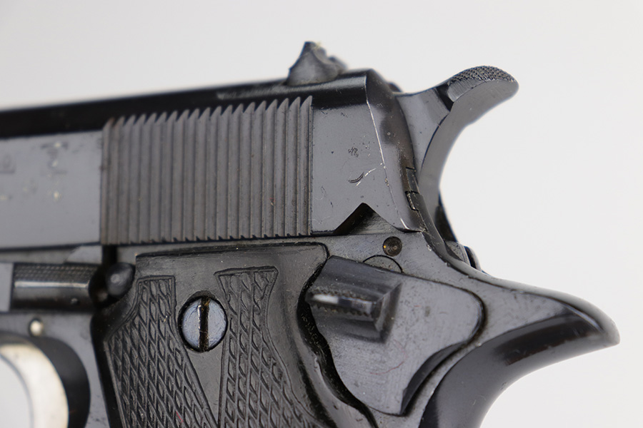 12/19/22 – This is a very nice example of a Spanish Star Model B manufactured in 1943. It is all matching and has a Nazi “Waffen 251” proof on the right side of the tang, but this marking is not original. Import mark on the back strap. The entire gun has been refurbished and refinished. There is virtually no actual bluing loss, but there is a series of tiny dings on the front strap. Fitted with a set of nice black plastic grips. Comes with one proper magazine. The bore is like-new.