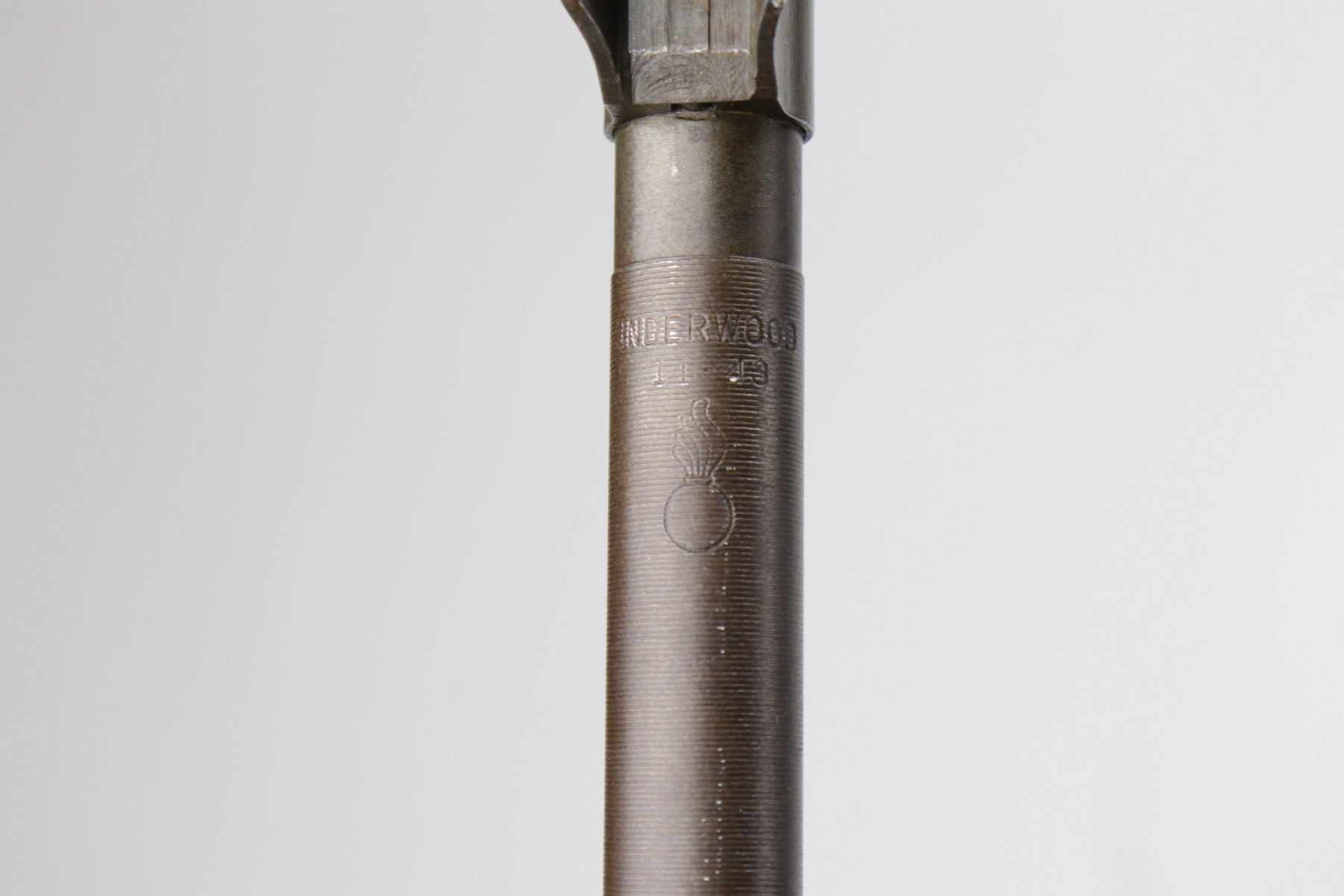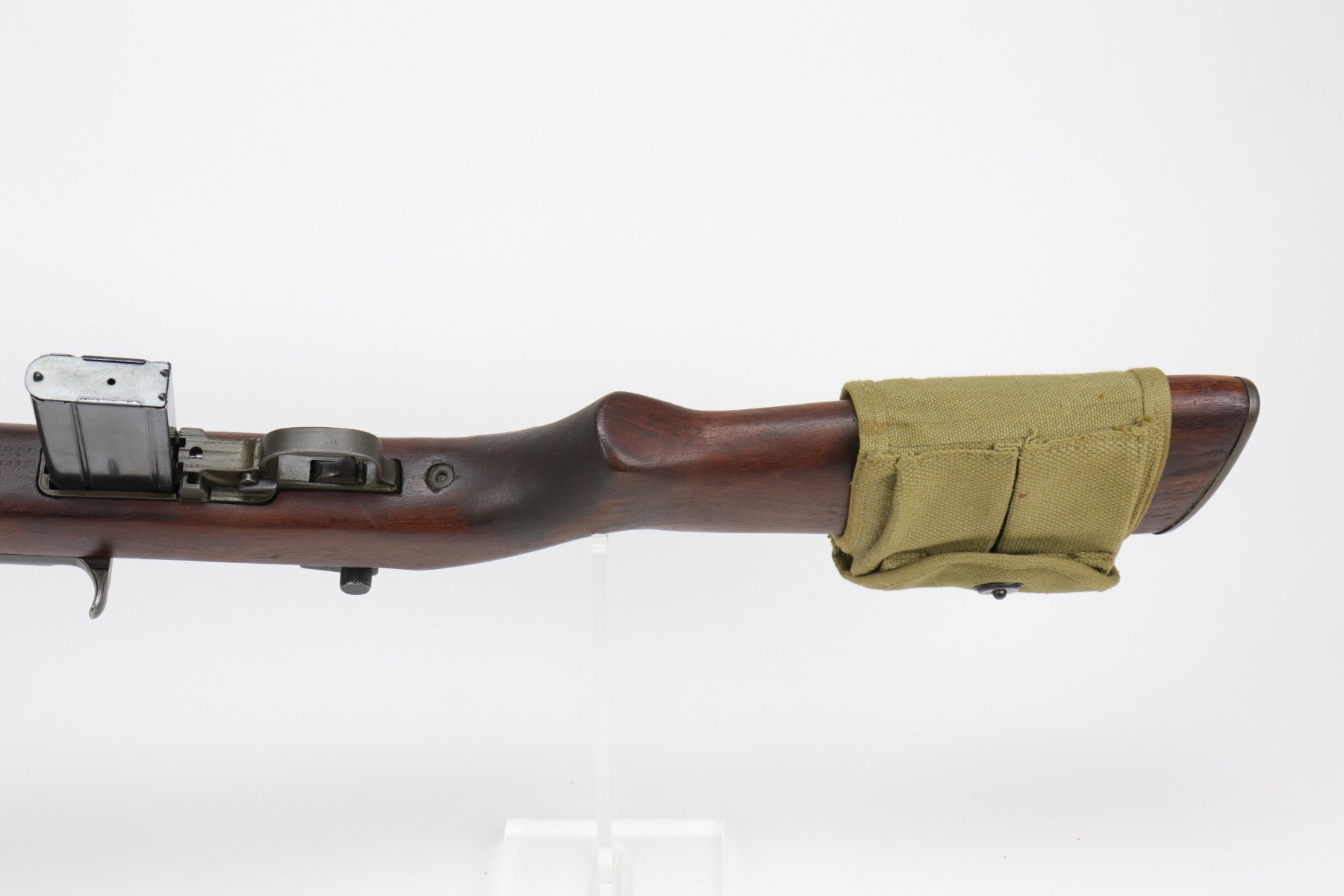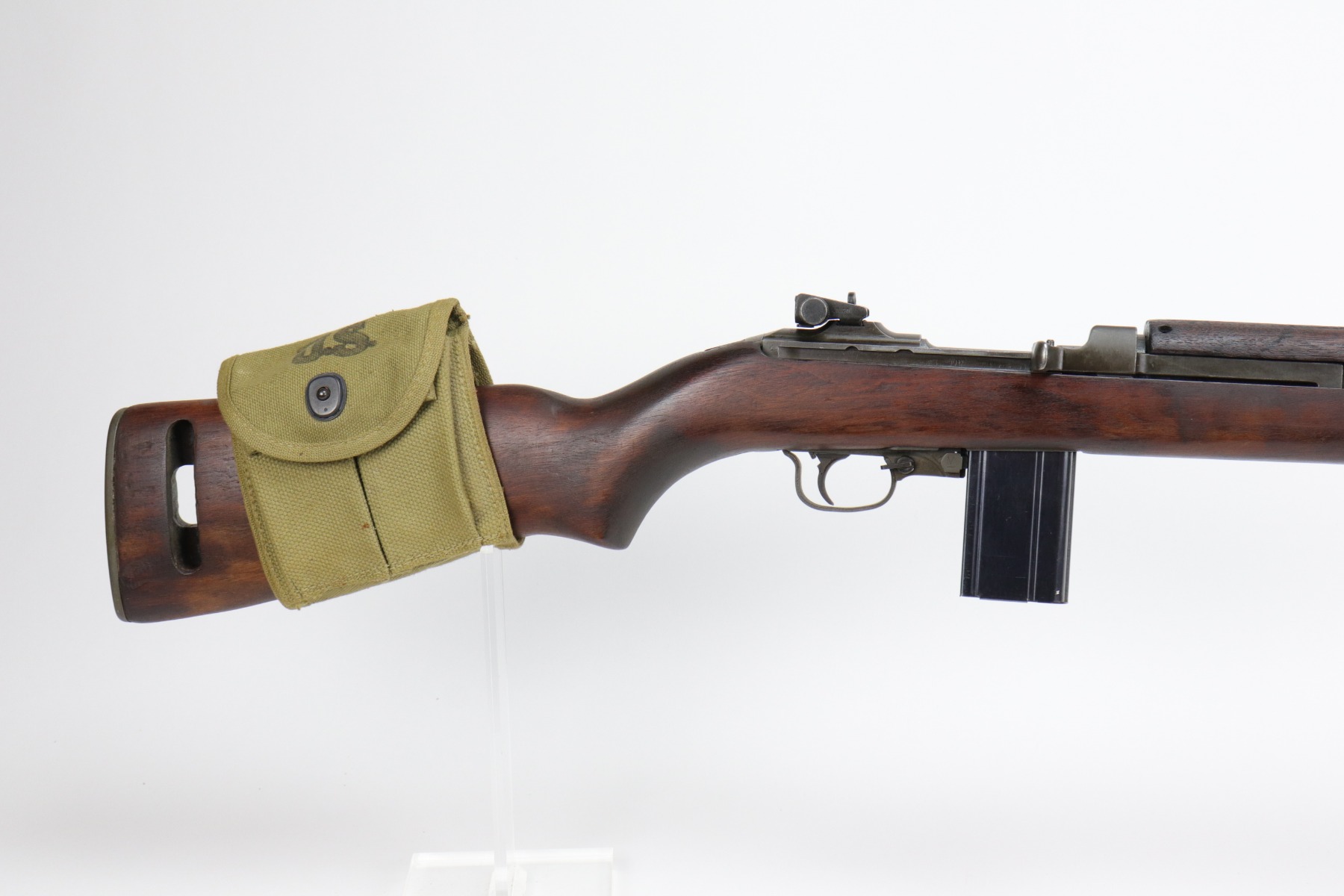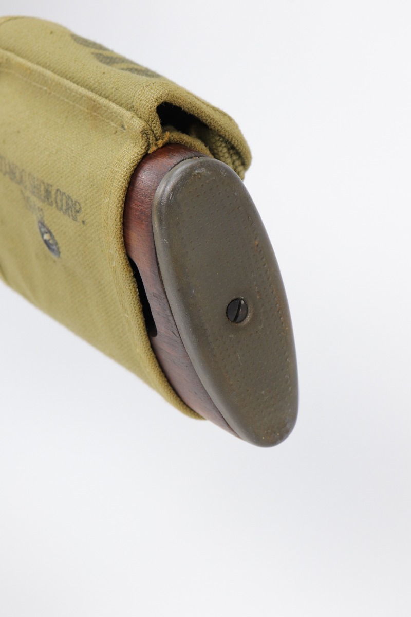 2/26/21 – This is an excellent example of an M1 Carbine issued to the US military in 1943. All parts are Underwood marked. The barrel is dated November 1943 and has a flaming bomb proof. It has an adjustable rear sight that was likely added for the Korean war. The stock is marked Underwood and has the proper cross-canon proof and inspection stamp. It has been sanded, though. Overall, the gun is in very nice condition. There is some minor thinning on the receiver and a few white marks on the barrel and on the stock. The gun comes with a WW2-era magazine and a 1943-dated magazine pouch. The bore is excellent – shiny with strong rifling.