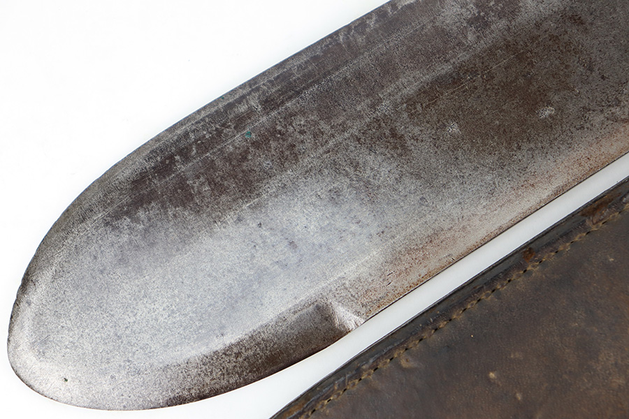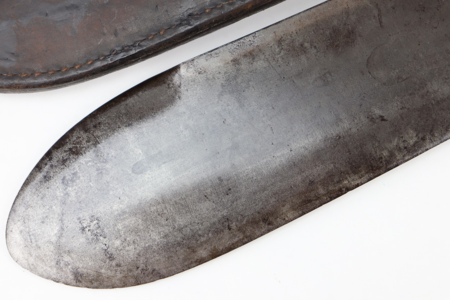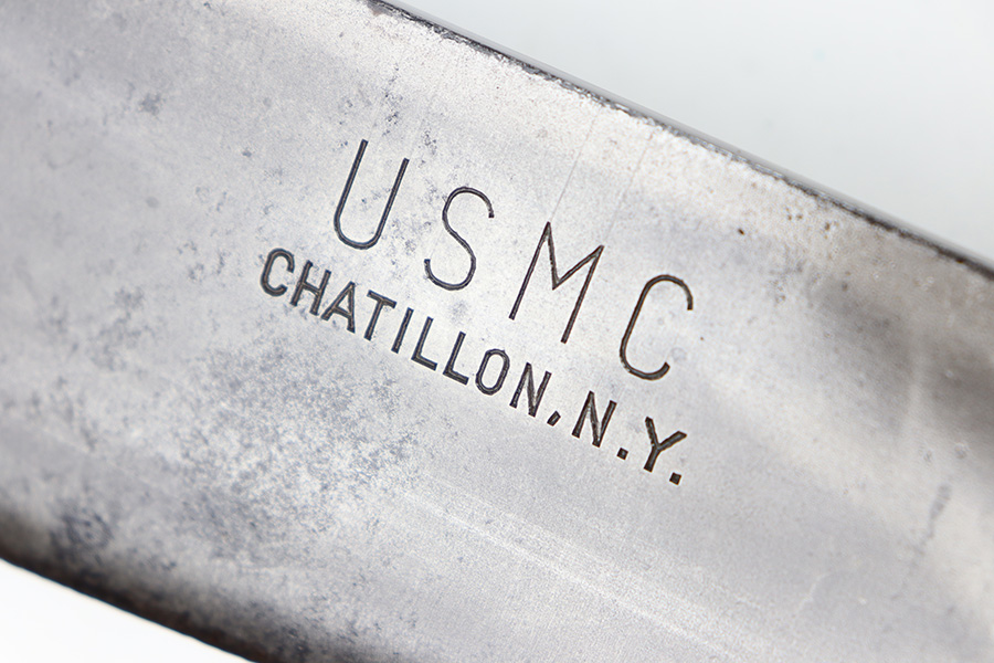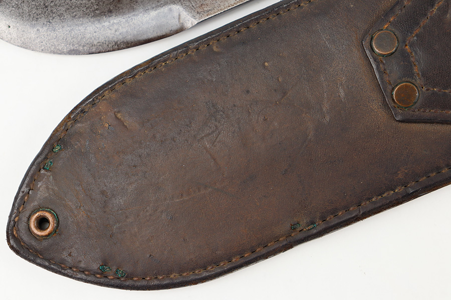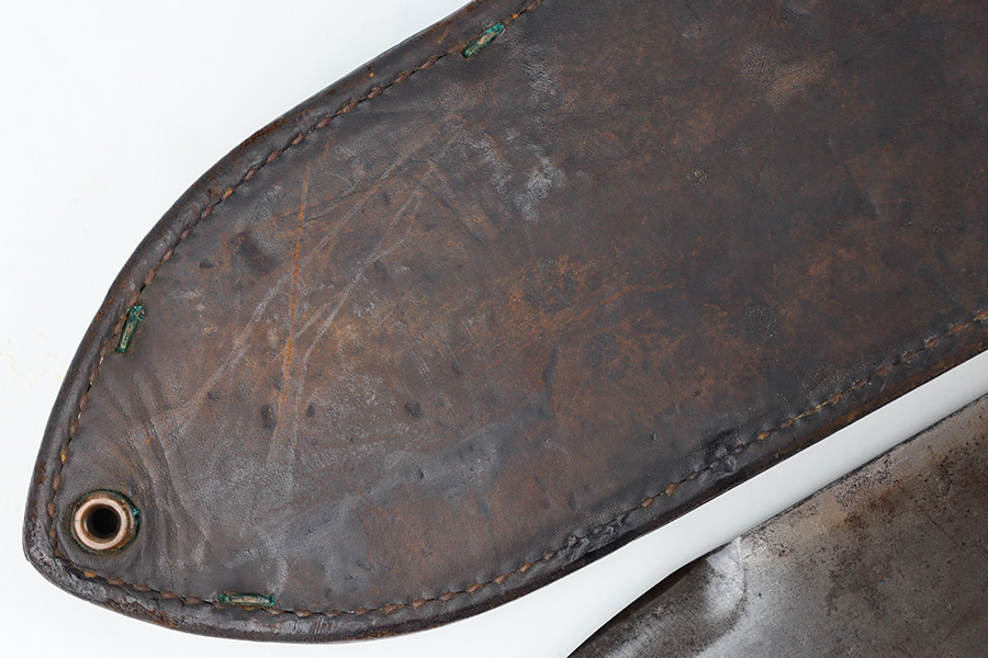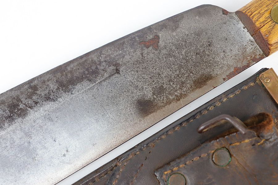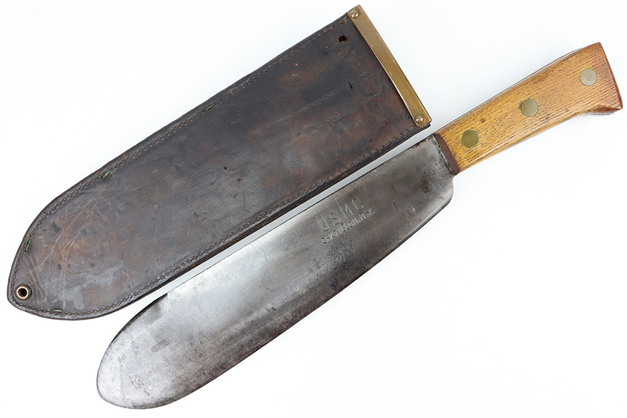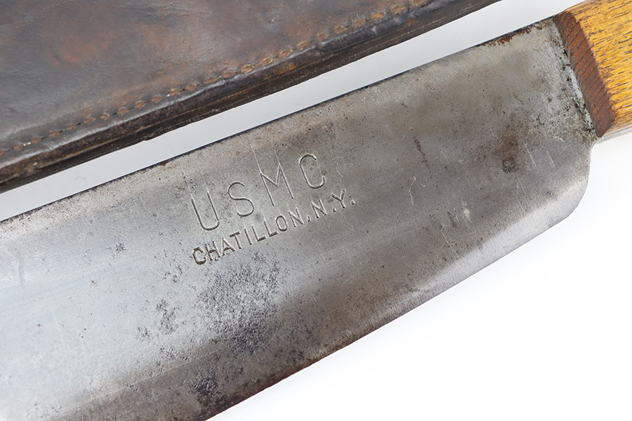 9/7/23 – This is an original WW2 production USMC issued Bolo Machete knife with an original leather scabbard. The blade is in good condition with some honest surface wear and discoloration throughout. Stamped “USMC Chatillon, N.Y.” on one side. The edge shows light signs of use but no evidence of sharpening. The wood handle is in good condition with small hairline cracks on one side. The leather scabbard is in great condition, and stamped on the back side, “USMC BOYT 43”.