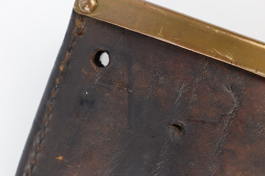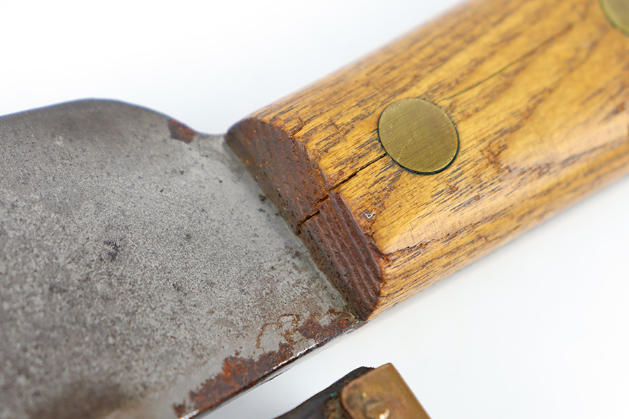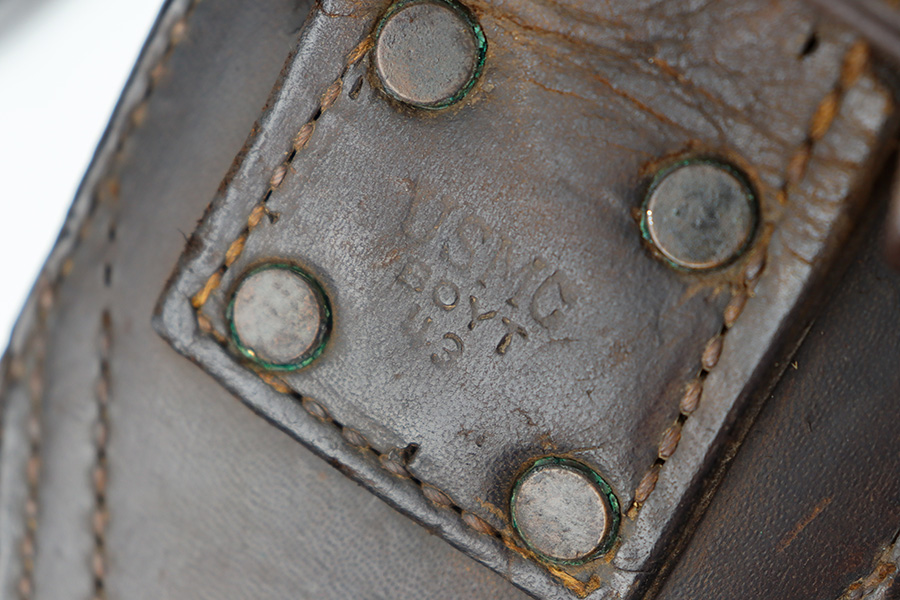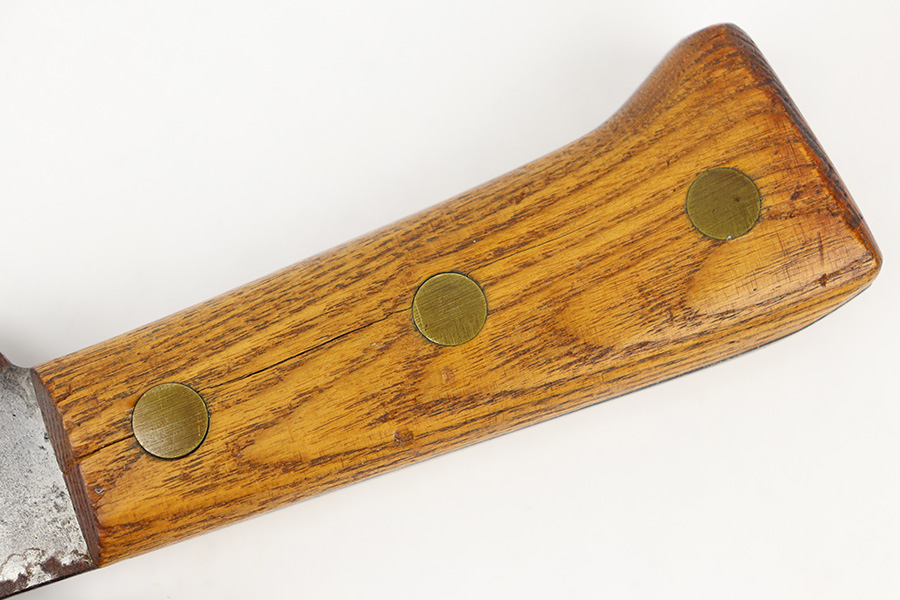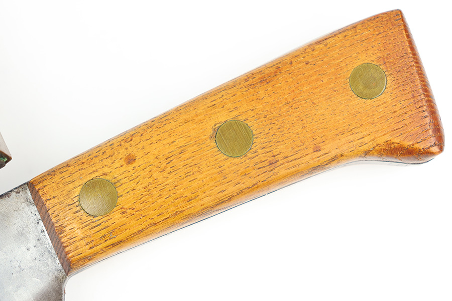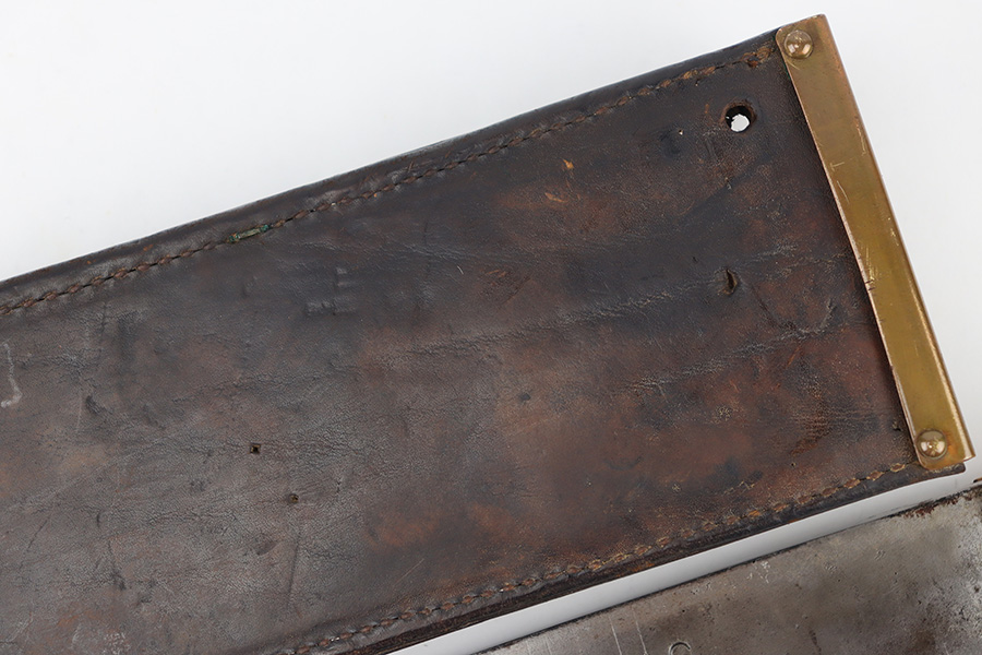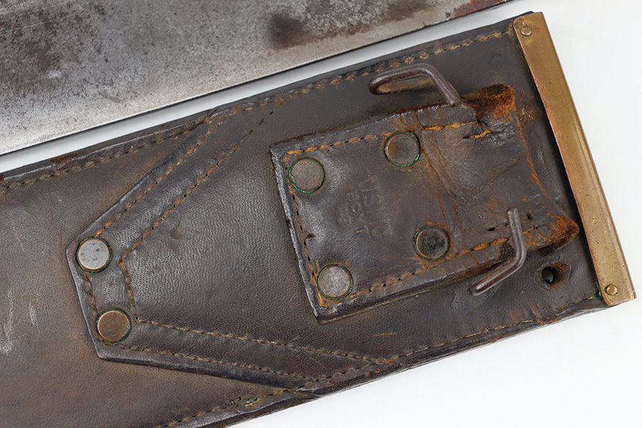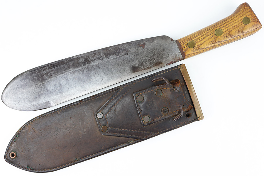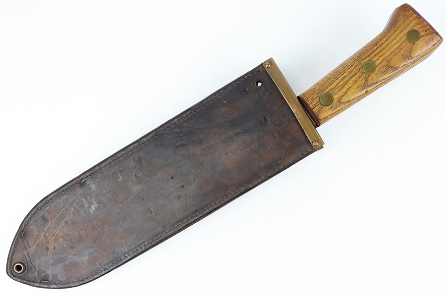 9/7/23 – This is an original WW2 production USMC issued Bolo Machete knife with an original leather scabbard. The blade is in good condition with some honest surface wear and discoloration throughout. Stamped “USMC Chatillon, N.Y.” on one side. The edge shows light signs of use but no evidence of sharpening. The wood handle is in good condition with small hairline cracks on one side. The leather scabbard is in great condition, and stamped on the back side, “USMC BOYT 43”.