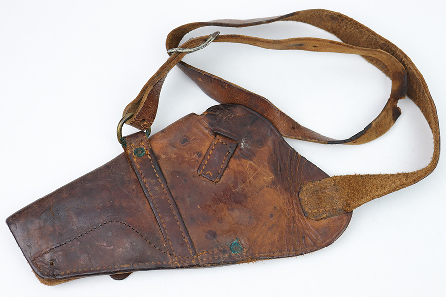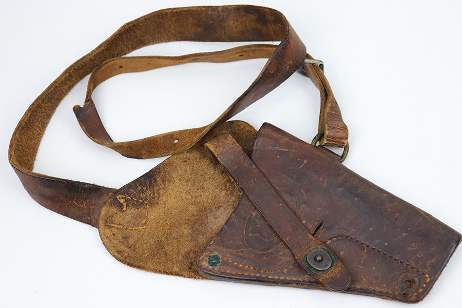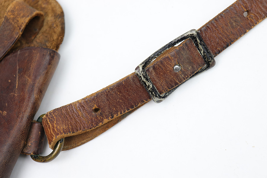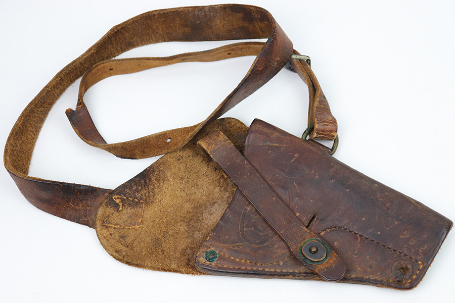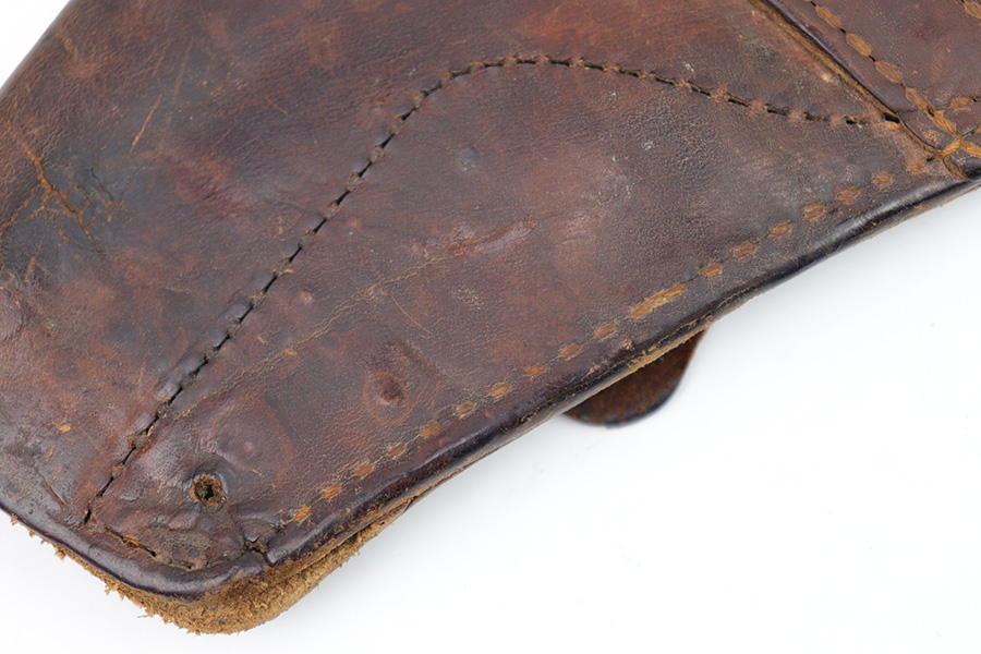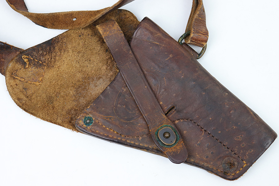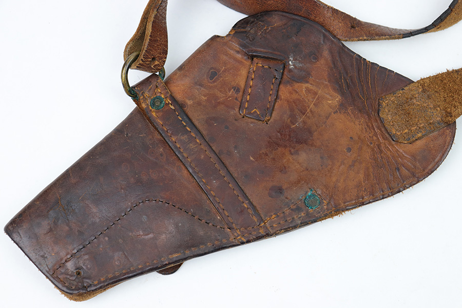 1/23/23 – This is an original 1943 dated USN issued shoulder holster. The holster is maker stamped on the back leather, USN BOYT 43. The front leather is US stamped, and there are no other markings. The holster shows surface wrinkling throughout the exterior as well as some spotty discoloration. The rivet in the bottom corner of the holster is missing. The interior line of stitching near the toe of this holster is also missing, which gives the holster a wider opening towards the bottom, which allows a variety of models to fit this holster. The leather shoulder strap has some surface cracking, wrinkling, and a small rip in the leather near the adjustment holes at the end of the strap. This doesn’t affect functionality however, and the strap is still completely intact.