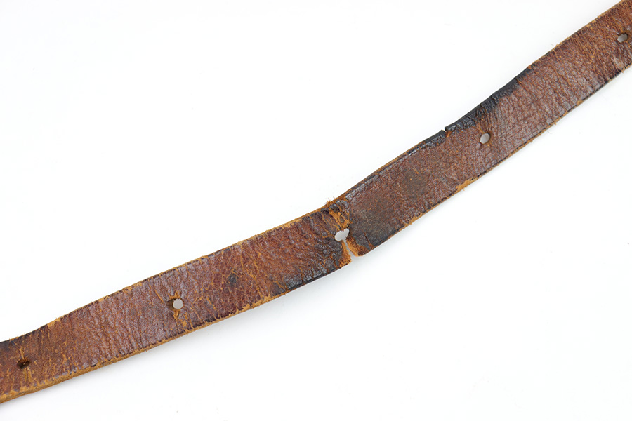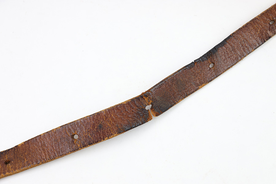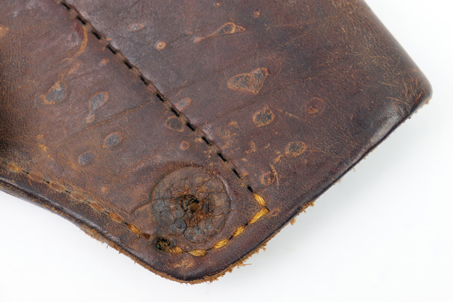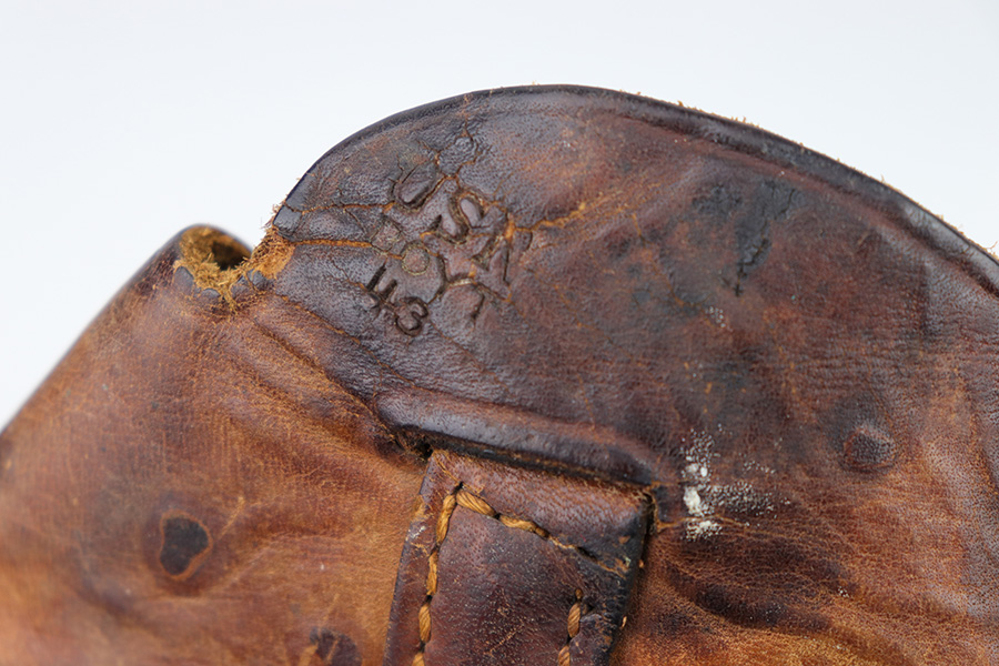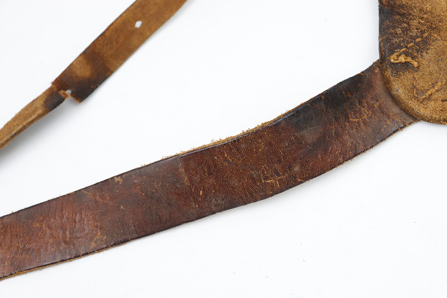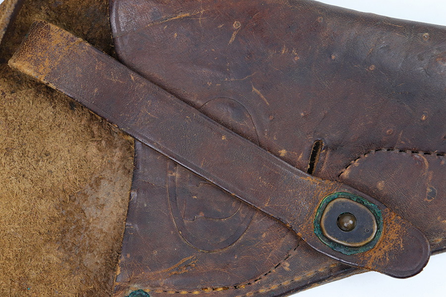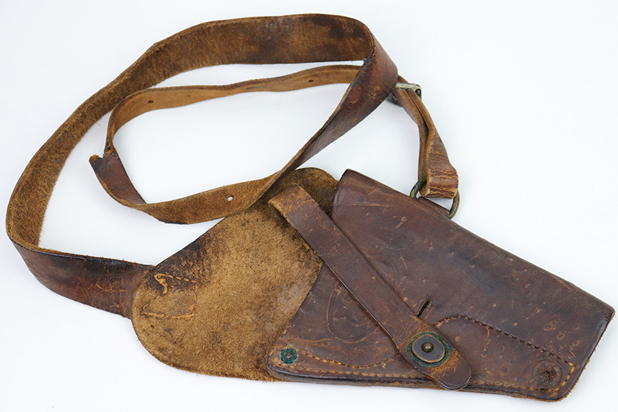 1/23/23 – This is an original 1943 dated USN issued shoulder holster. The holster is maker stamped on the back leather, USN BOYT 43. The front leather is US stamped, and there are no other markings. The holster shows surface wrinkling throughout the exterior as well as some spotty discoloration. The rivet in the bottom corner of the holster is missing. The interior line of stitching near the toe of this holster is also missing, which gives the holster a wider opening towards the bottom, which allows a variety of models to fit this holster. The leather shoulder strap has some surface cracking, wrinkling, and a small rip in the leather near the adjustment holes at the end of the strap. This doesn’t affect functionality however, and the strap is still completely intact.