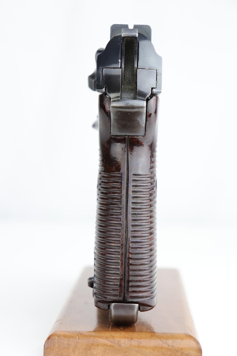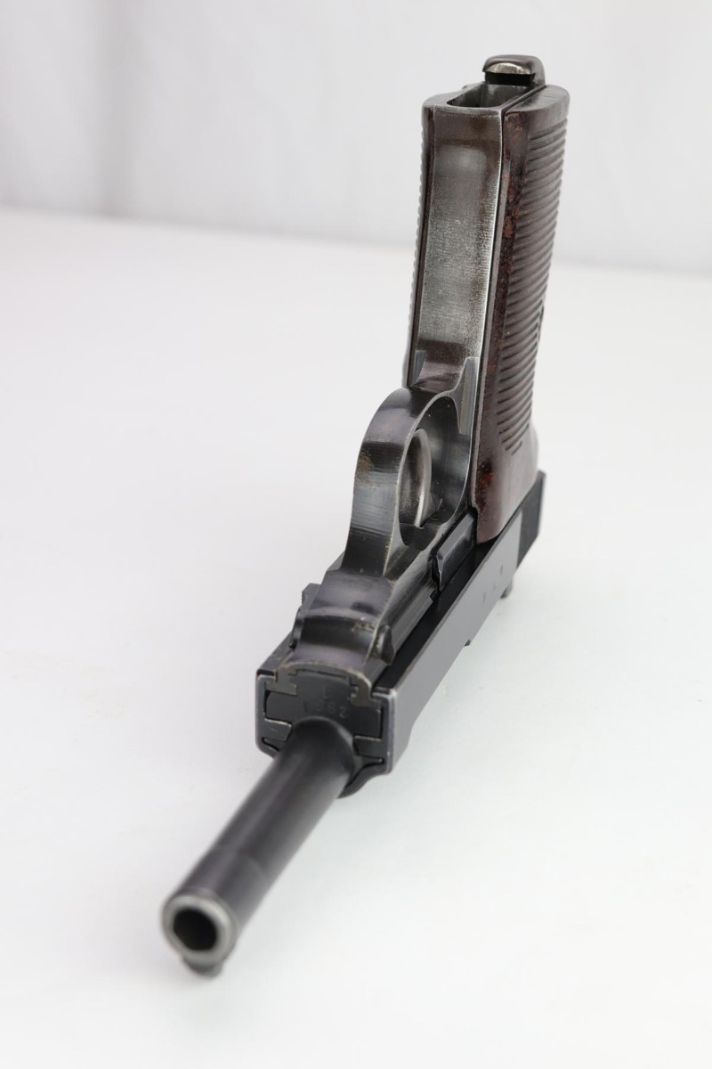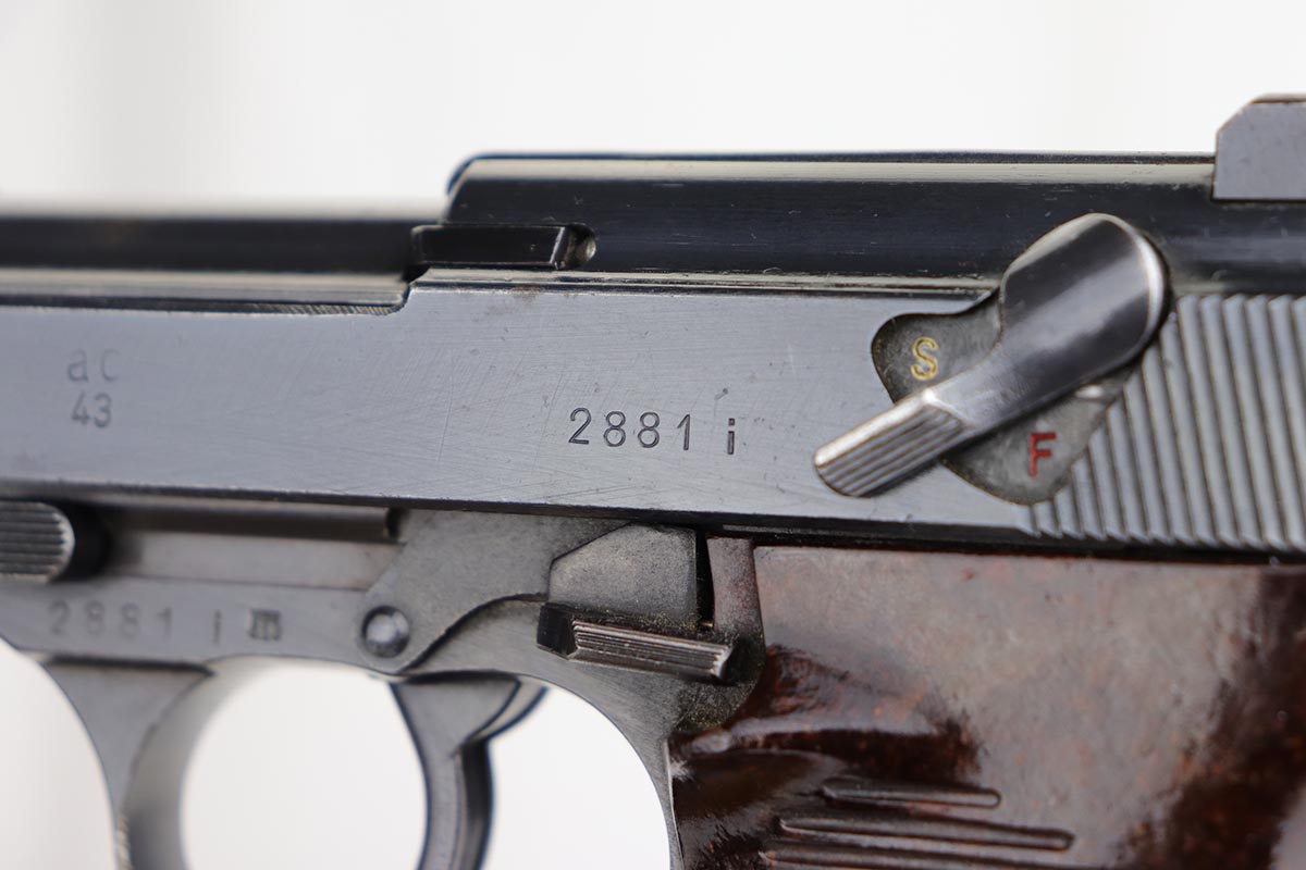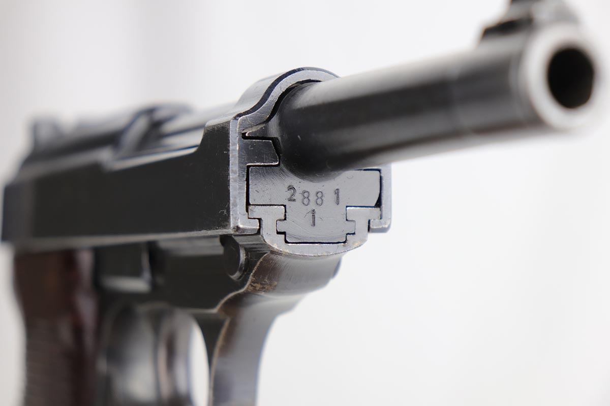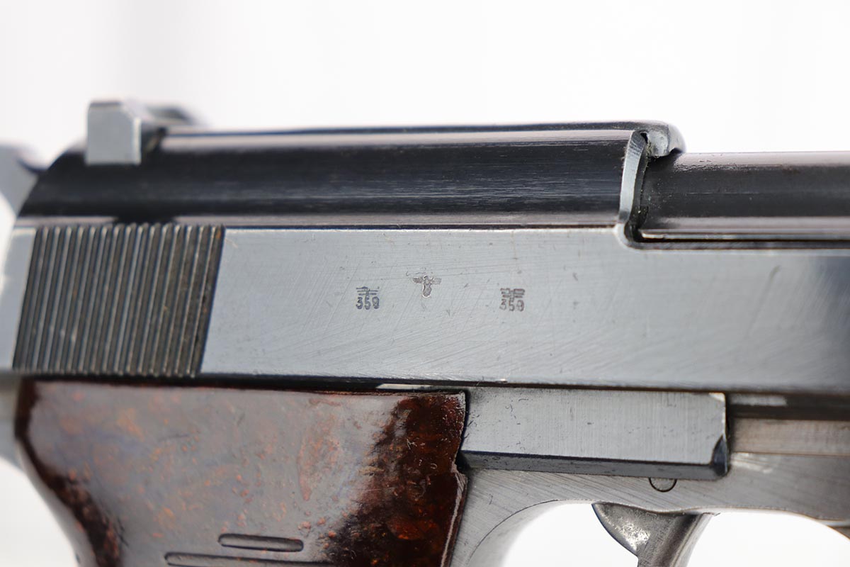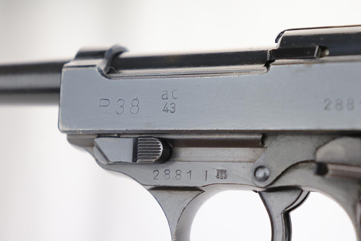 2/4/20 – This is an all matching and original Walther P.38 from August of 1943. The pistol has an excellent profile view with only minor thinning on the muzzle and side of barrel, but there is notable thinning/patina on the front strap. Excellent Walther grips. Strong, shiny bore. Good mechanics, including de-cocker.