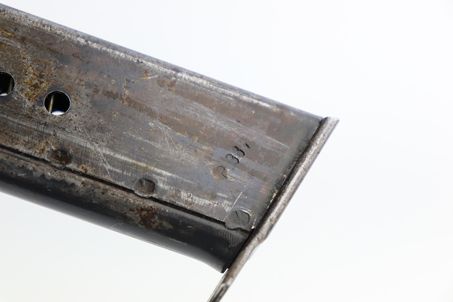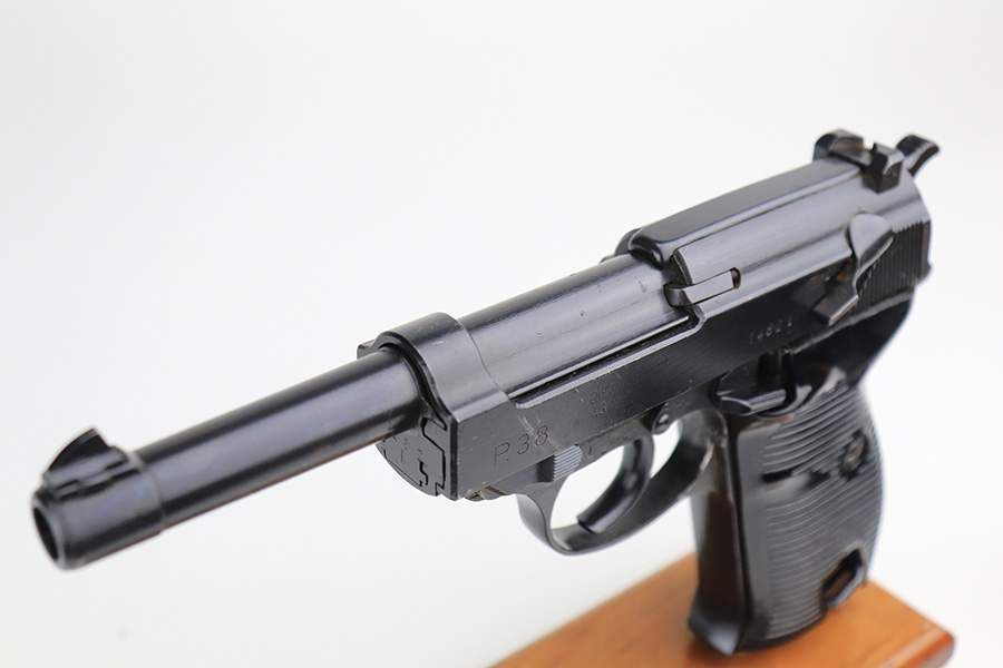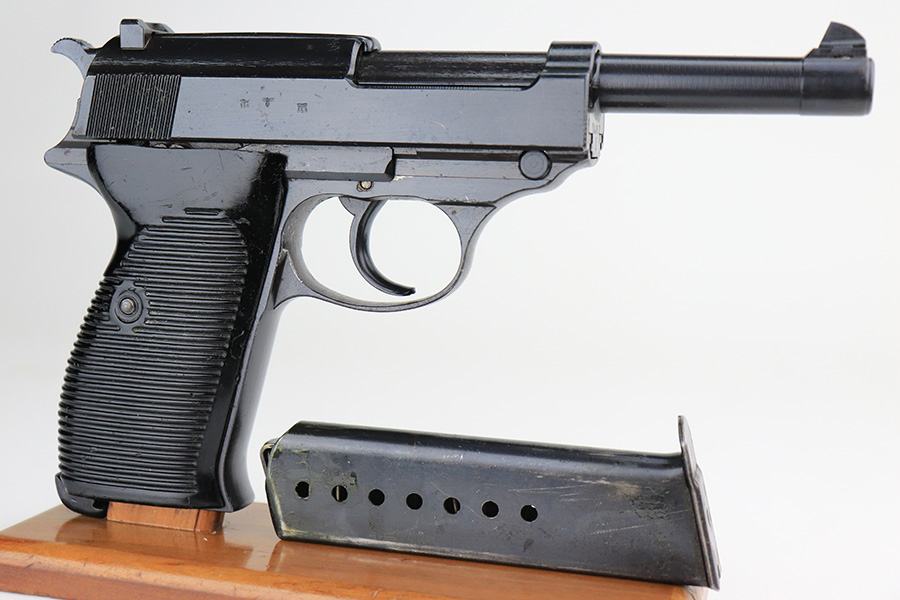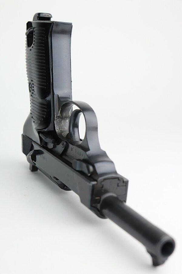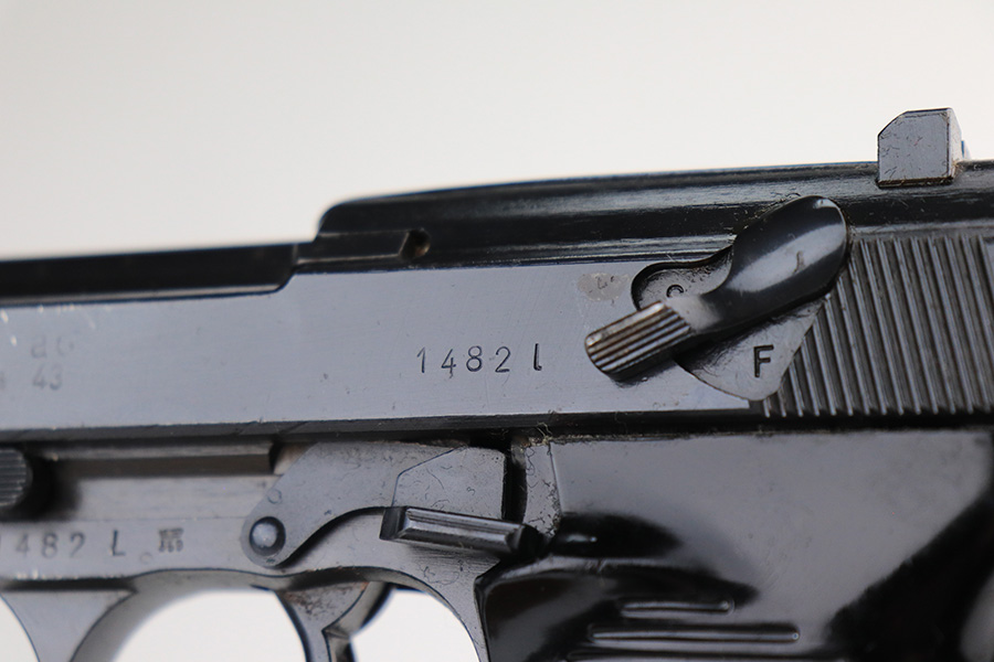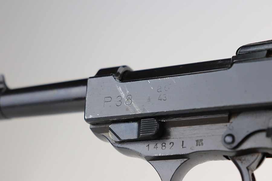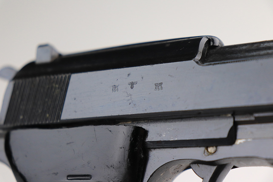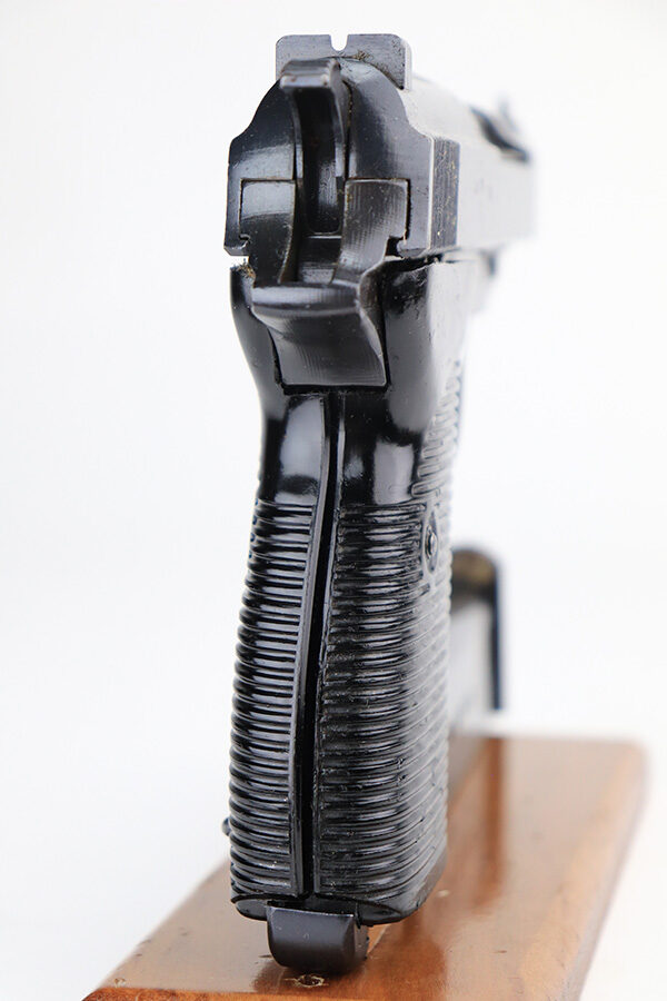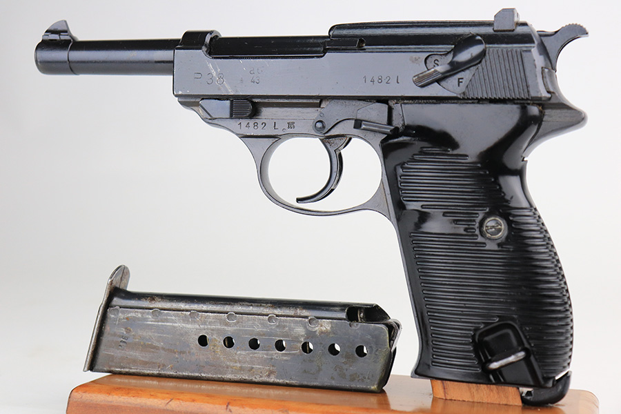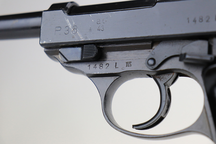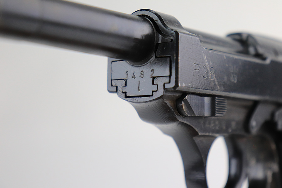 1/6/22 – This is an excellent example of a Walther P.38 issued to the Nazi military in 1943. It is all matching and has the proper “Eagle 359” Nazi military acceptance proofs throughout. The finish is dark, so we believe it has been “Russian dipped”. There are, however, no “Russian X’s”. In any case, it has retained more than 98% of its finish with a small area of scratchy wear on the left side of the slide. Comes with nice black grips and a period-correct magazine. Both grips have some light scratching, and they’ve been cut at the top. The bore has good rifling with pin-pricking in the grooves. De-cocker is functional.