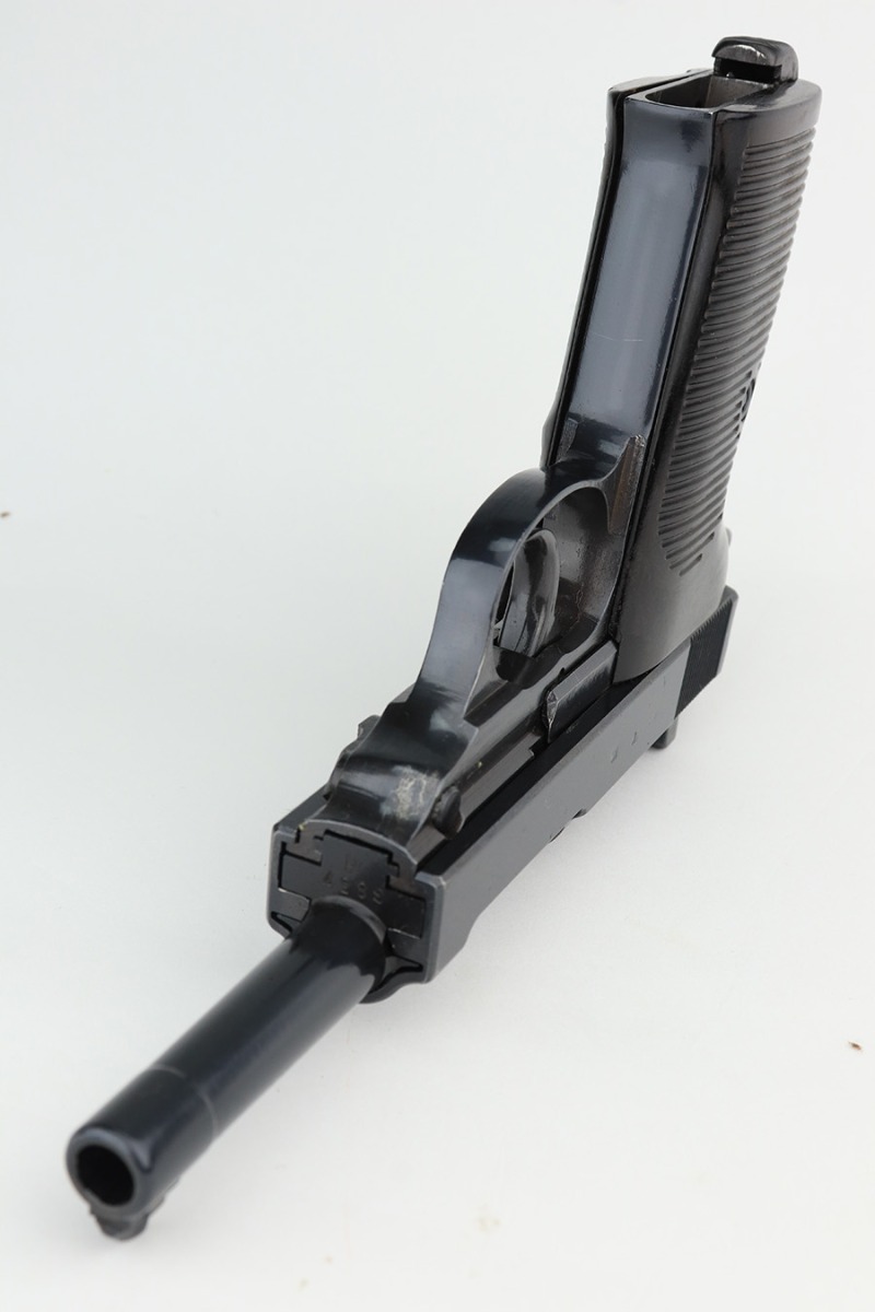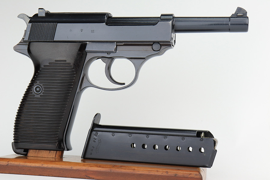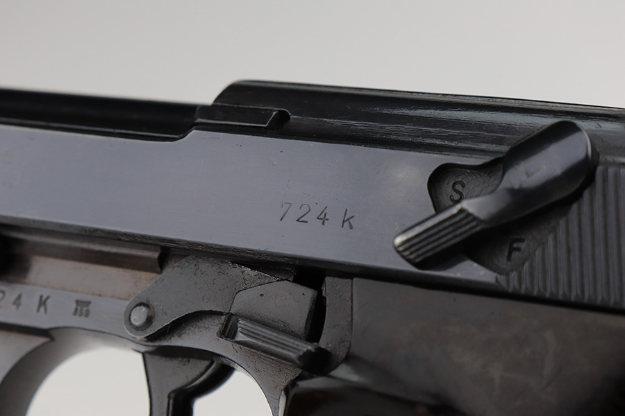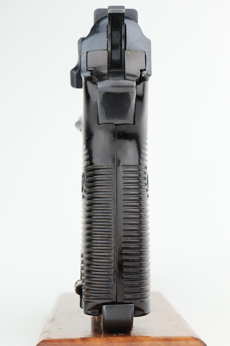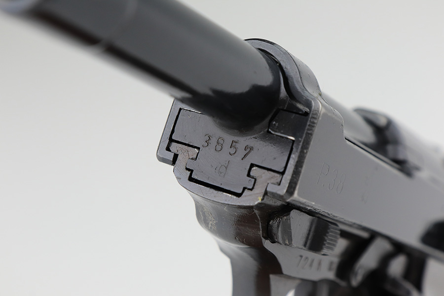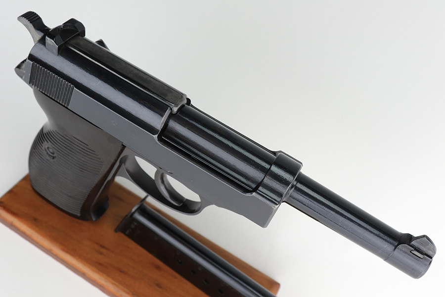 1/24/23 – This is a very nice example of an AC 43 Walther P.38 issued to the Nazi military in 1943. The slide and frame match each other, but the barrel and locking block are mismatched. It has the proper “Eagle 359” military acceptance proofs throughout. The entire gun has been professionally restored, so the bluing is really nice. There is very little finish loss, just hints of wear on the very front edges of the slide and some minor wear on the top plate. Fitted with excellent blackish brown bakelite grips and comes with one post-war magazine. The bore is like-new. De-cocker is functional.