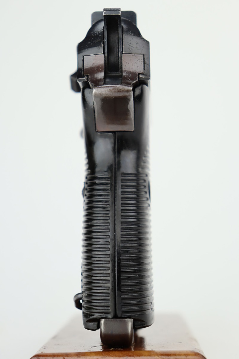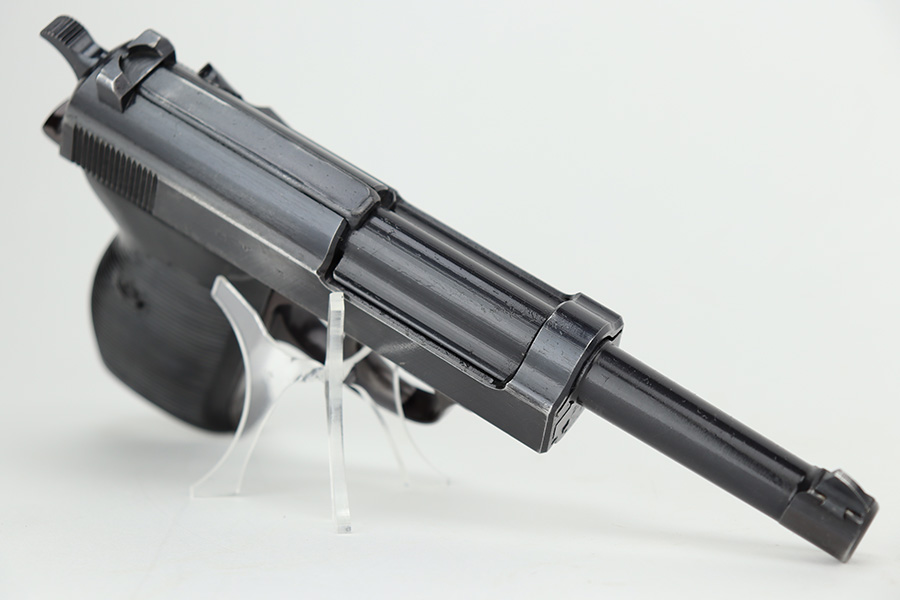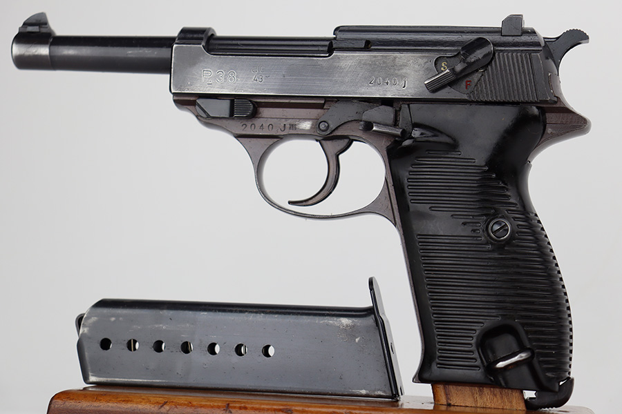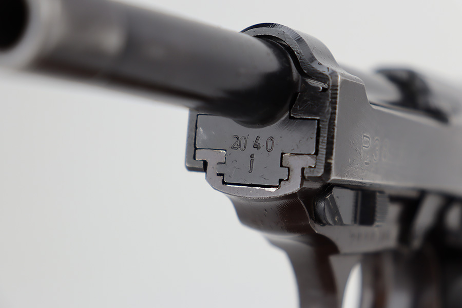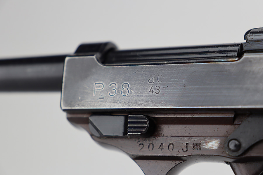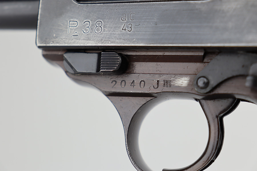 6/21/23 – This is a nice example of an AC 43 Walther P.38 issued to the Nazi military in 1943. It is all matching with the proper “Eagle 359” military acceptance proofs throughout. It has retained roughly 80-85% of its original finish with thinning on the front strap, wear around the muzzle, and areas of wear along both sides of the slide. The frame has a nice plum color to it. Fitted with excellent period-correct blackish-brown bakelite grips. Comes with one “Eagle 359” marked Walther magazine. The bore has decent rifling, but there is pin-pricking and light spotty oxidation throughout. De-cocker is functional.