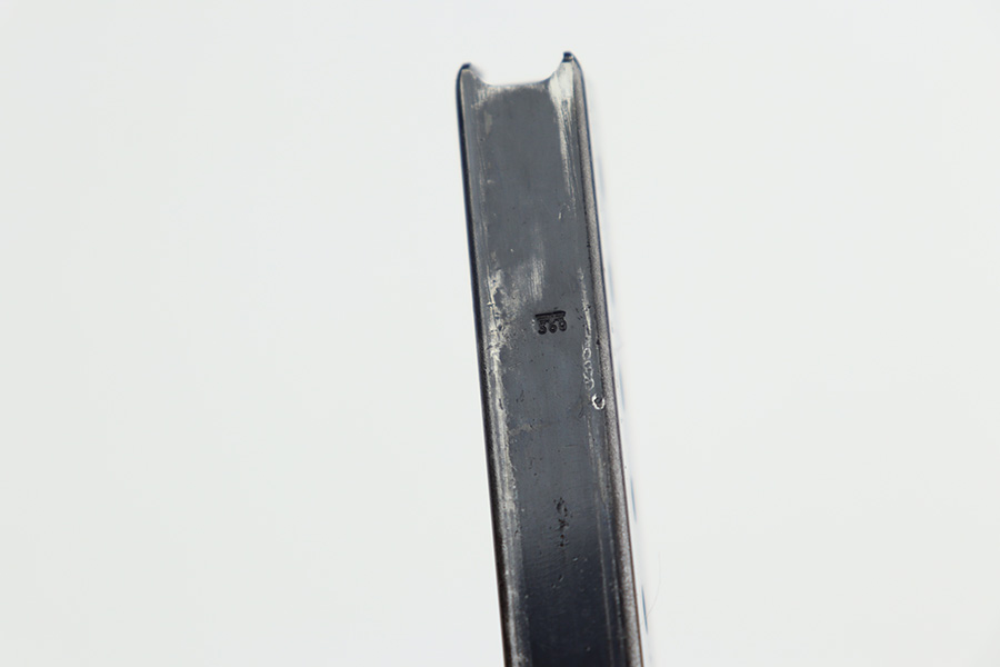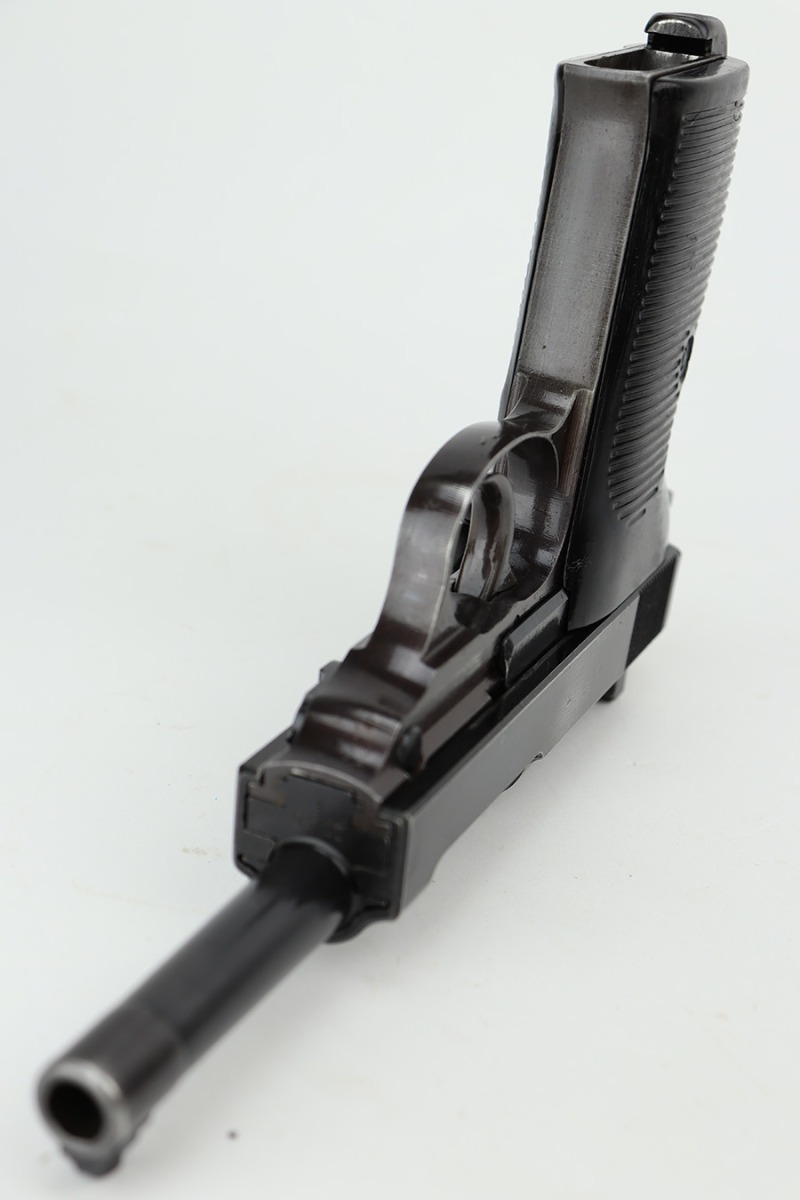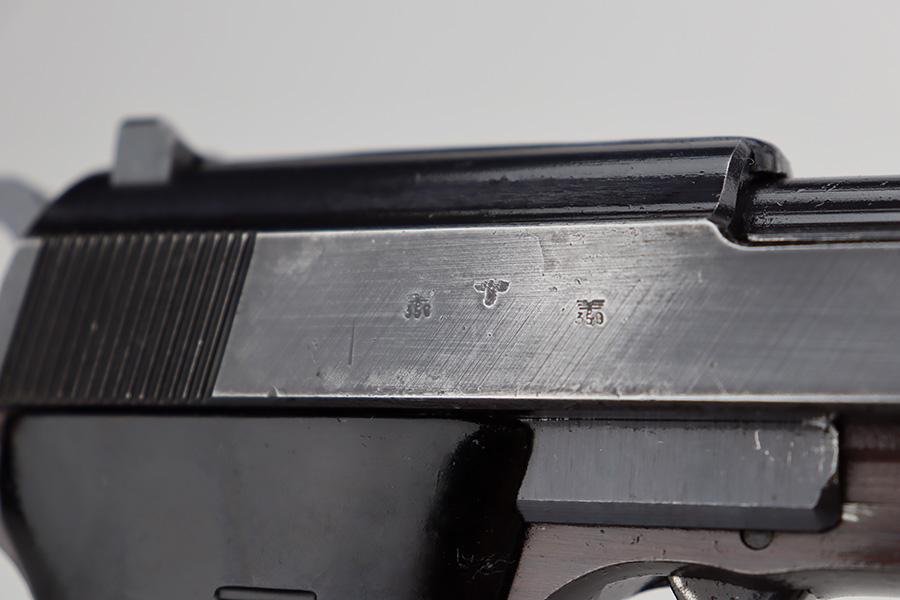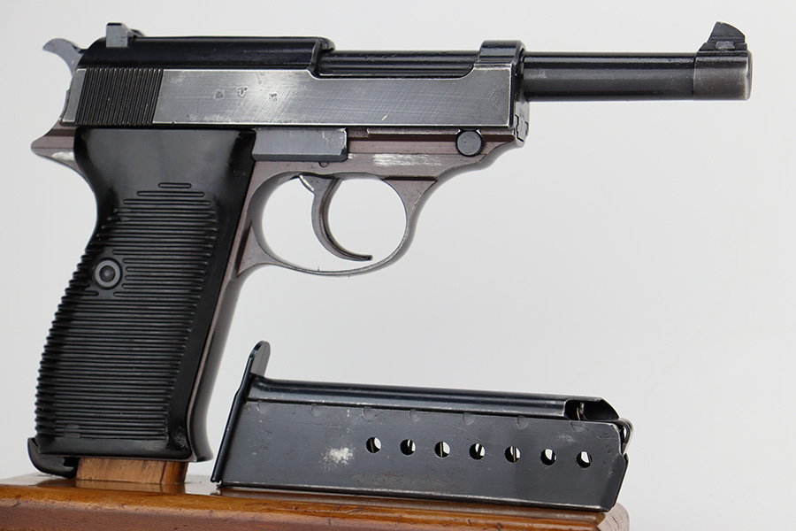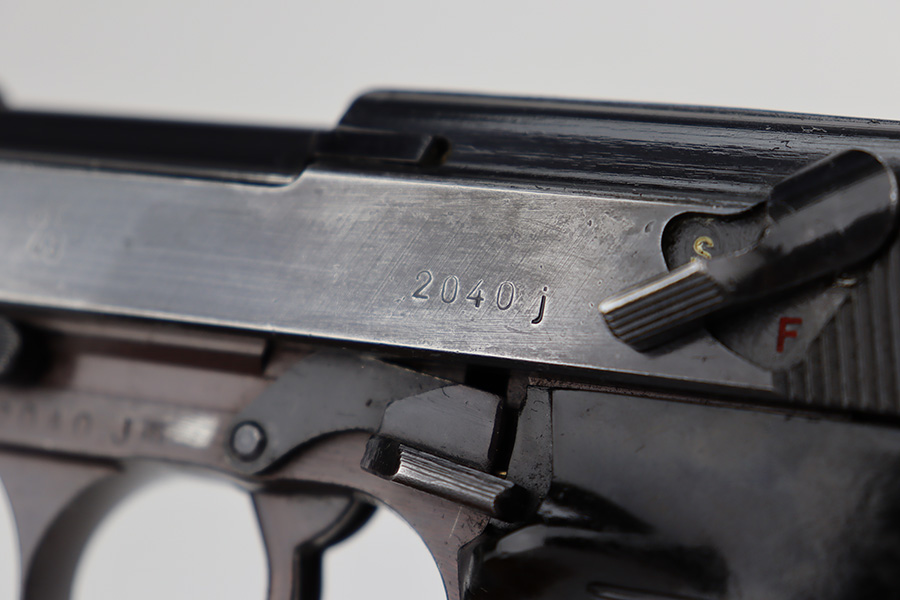 6/21/23 – This is a nice example of an AC 43 Walther P.38 issued to the Nazi military in 1943. It is all matching with the proper “Eagle 359” military acceptance proofs throughout. It has retained roughly 80-85% of its original finish with thinning on the front strap, wear around the muzzle, and areas of wear along both sides of the slide. The frame has a nice plum color to it. Fitted with excellent period-correct blackish-brown bakelite grips. Comes with one “Eagle 359” marked Walther magazine. The bore has decent rifling, but there is pin-pricking and light spotty oxidation throughout. De-cocker is functional.