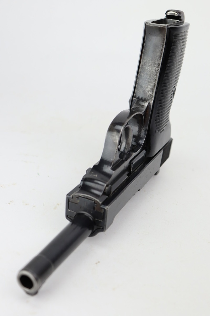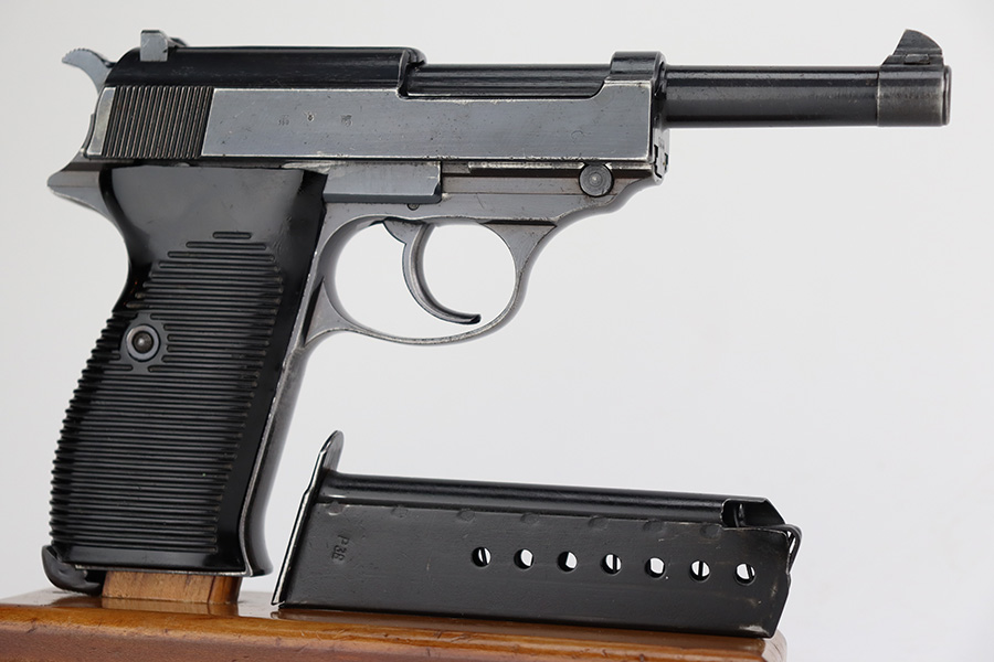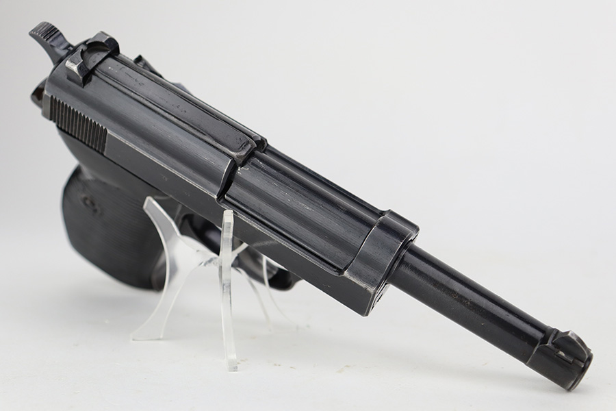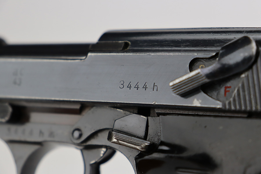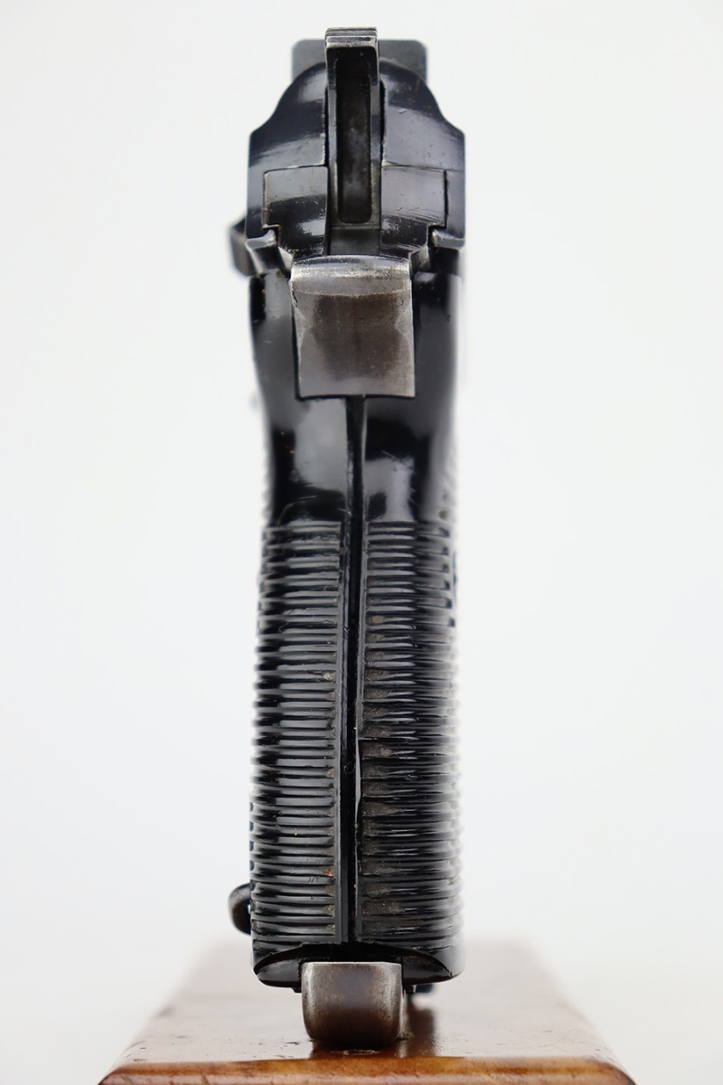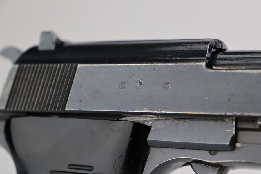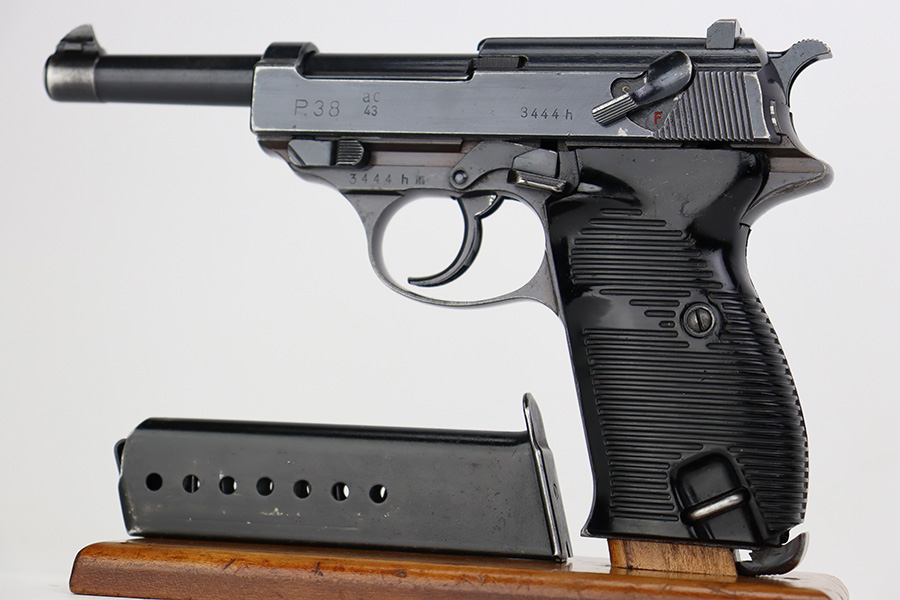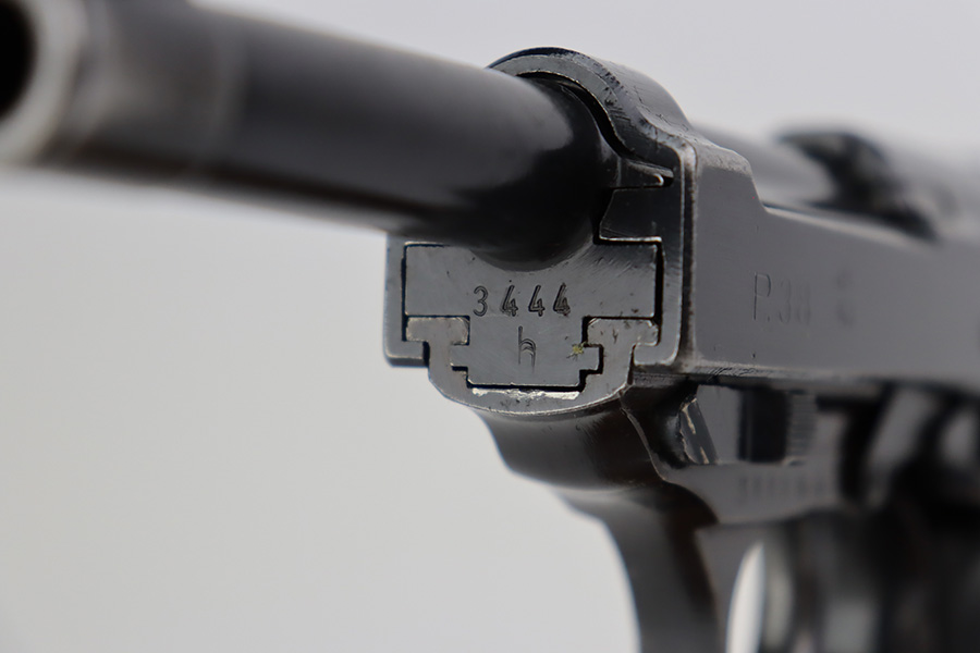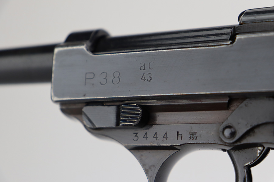 7/10/23 – This is a very nice example of an AC 43 Walther P.38 issued to the Nazi military in 1943. It is all matching and has the proper “Eagle 359” military acceptance proofs throughout. It has retained roughly 85% of its original finish. The majority of the wear is on the front strap, where there is some oxidation, but there is also minor wear around the muzzle and on the high edges of the slide. Fitted with black plastic grips that have been shaved along the top edges. Comes with a period-correct jvd magazine. The bore has good rifling, but there is minor freckling throughout. De-cocker is functional.