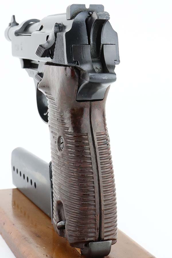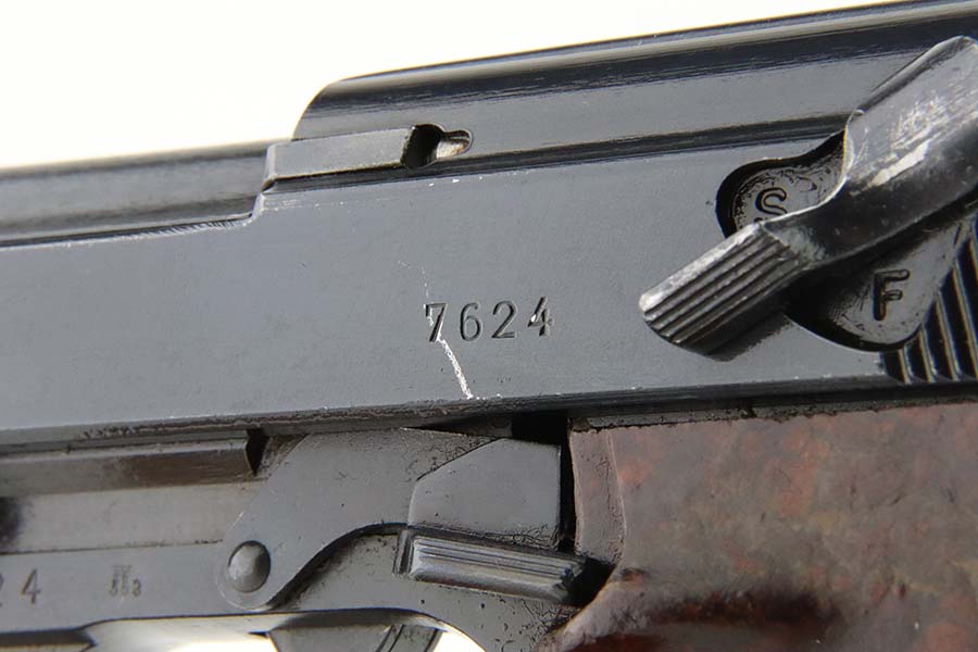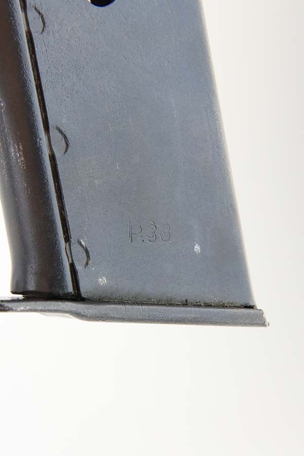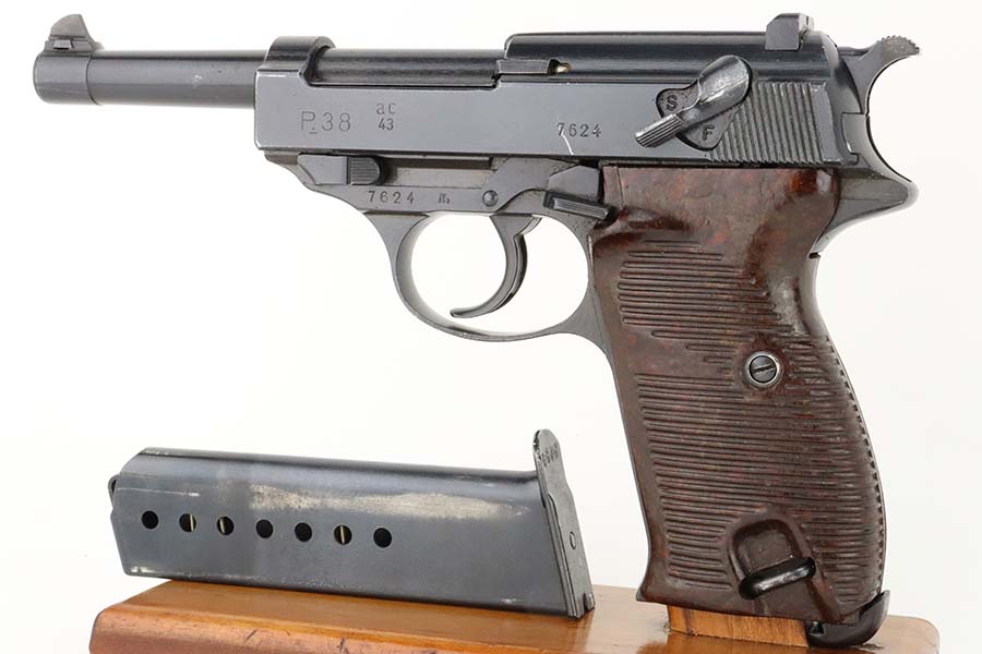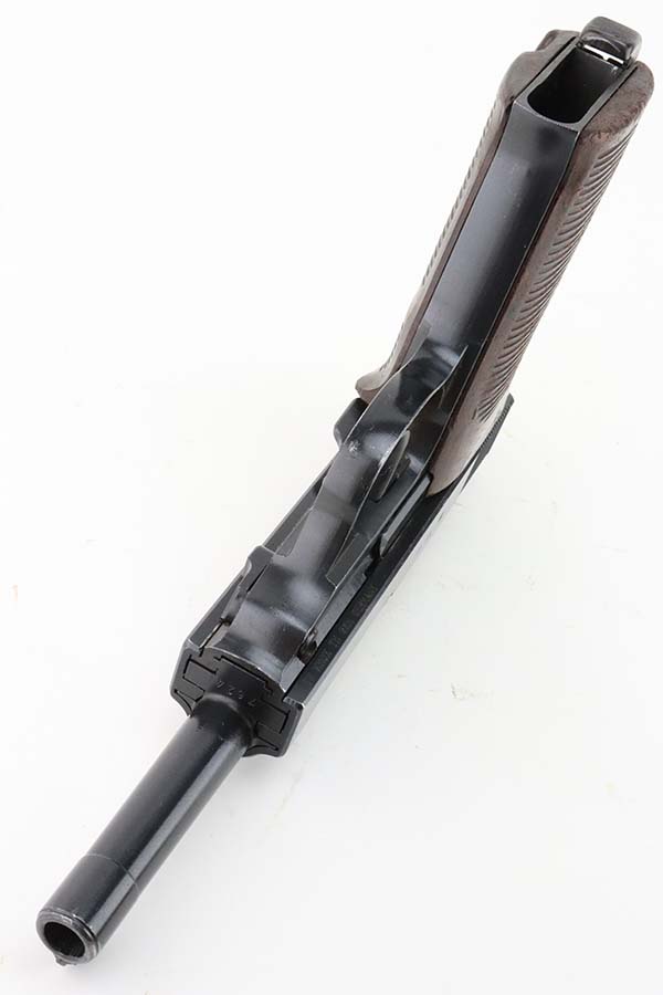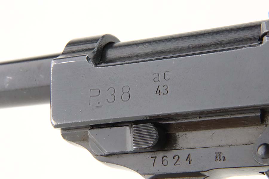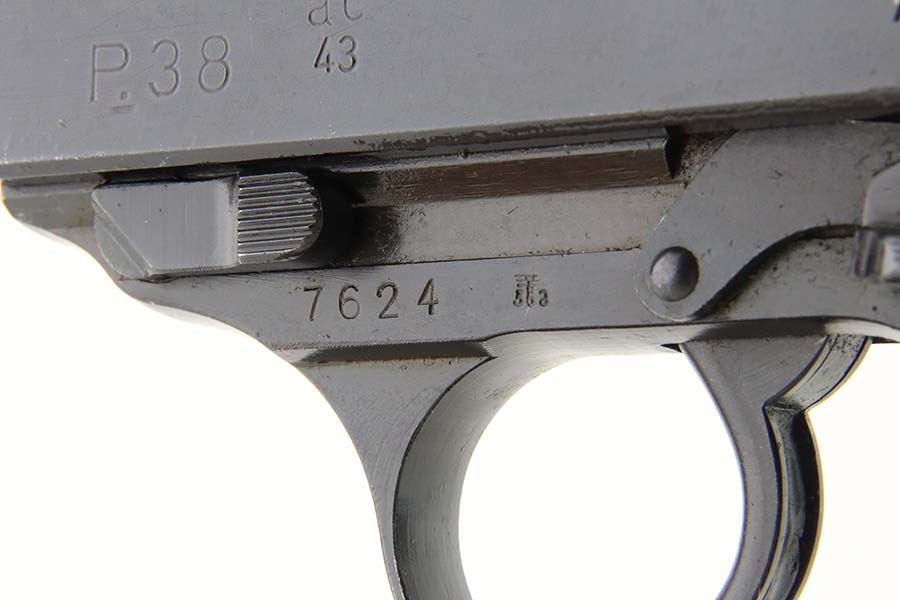 3/21/24 – This is an excellent example of an “AC 43” Walther P.38 issued to the Nazi military in 1943. All matching with the proper “Eagle 359” military acceptance proofs. Large import mark on the under edge of the slide. The entire gun has a dark “Russian dipped” finish – very little finish loss. Fitted with reddish bakelite grips and comes with an “Eagle 359” marked Walther magazine – post-war numbering on the bottom. The bore has strong rifling, but there is frosting in the grooves. De-cocker is functional.