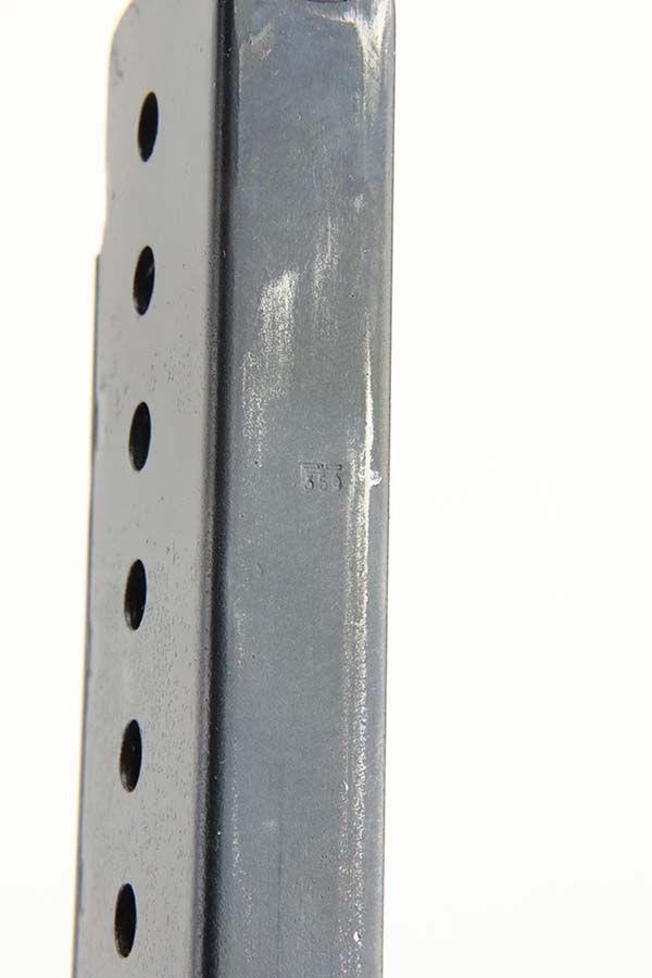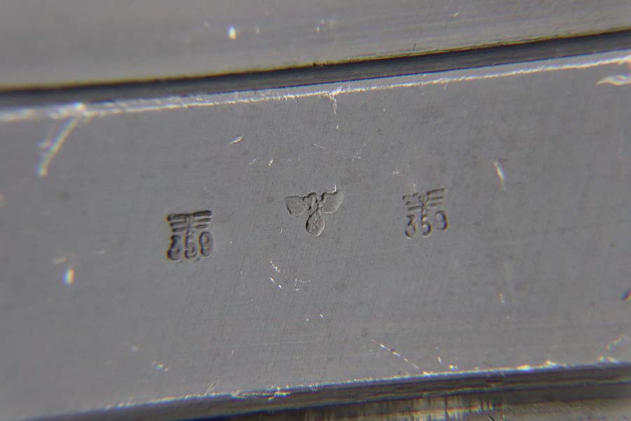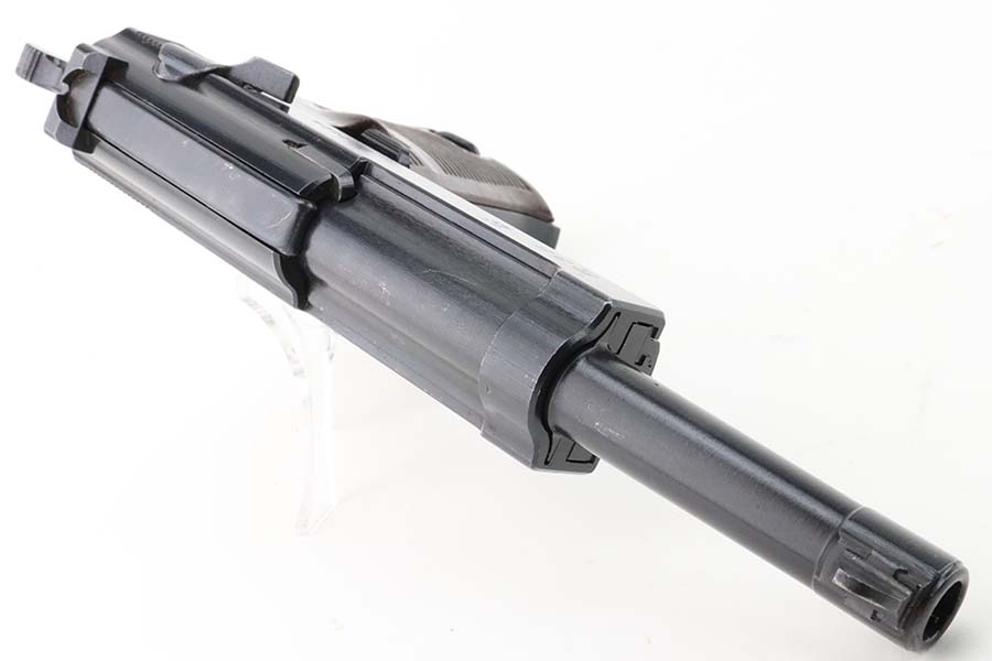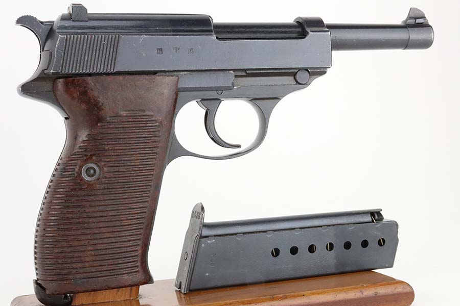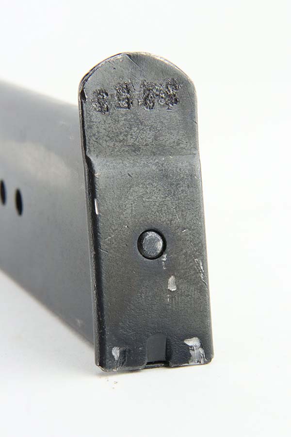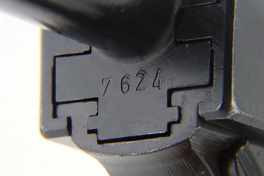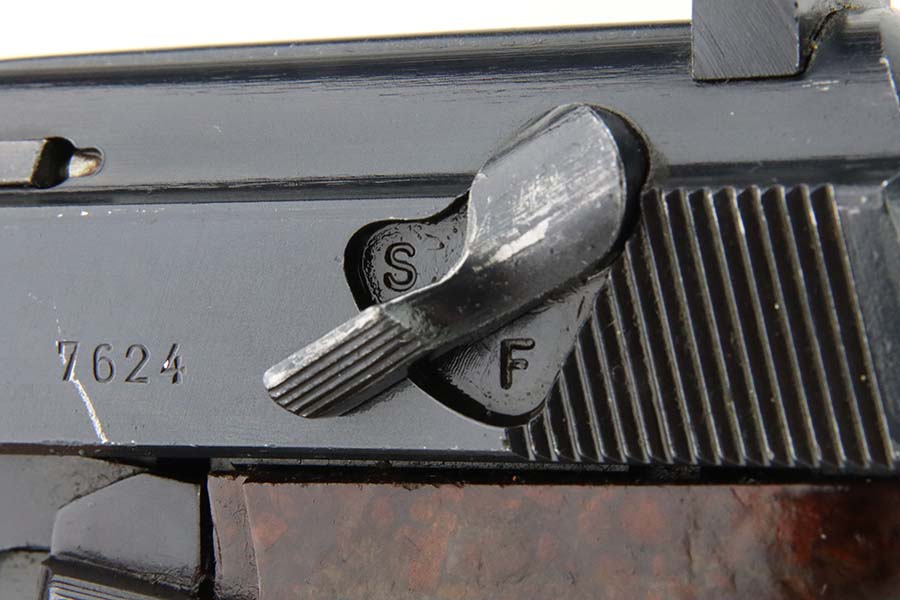 3/21/24 – This is an excellent example of an “AC 43” Walther P.38 issued to the Nazi military in 1943. All matching with the proper “Eagle 359” military acceptance proofs. Large import mark on the under edge of the slide. The entire gun has a dark “Russian dipped” finish – very little finish loss. Fitted with reddish bakelite grips and comes with an “Eagle 359” marked Walther magazine – post-war numbering on the bottom. The bore has strong rifling, but there is frosting in the grooves. De-cocker is functional.