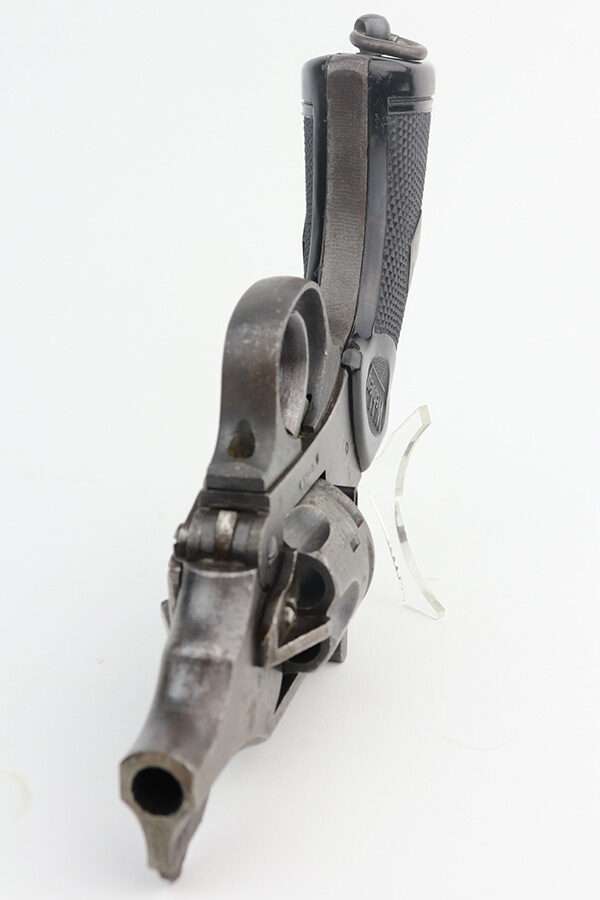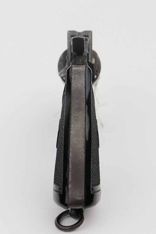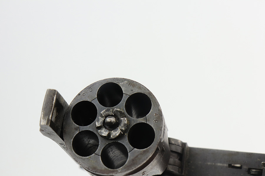6/15/21 – This is a very nice example of a Webley Mark IV revolver issued to the British military in 1943. It is all matching and has the proper British proofs. The serial number is intact on the cylinder, so it has not been shaved or modified. However, the barrel has been cut down to make it a snub nose revolver – the barrel is now 2 inches. There are areas of spotty thinning and tiny dots of oxidation throughout. Comes with excellent original grips. Original lanyard ring is intact. Excellent bore – shiny with strong rifling.