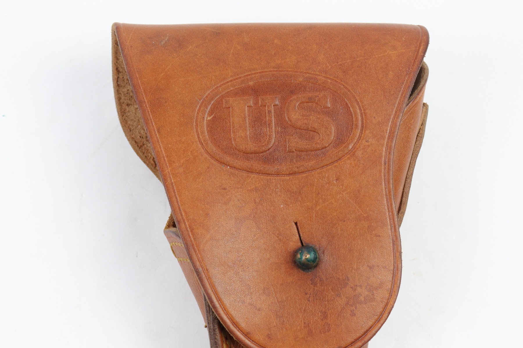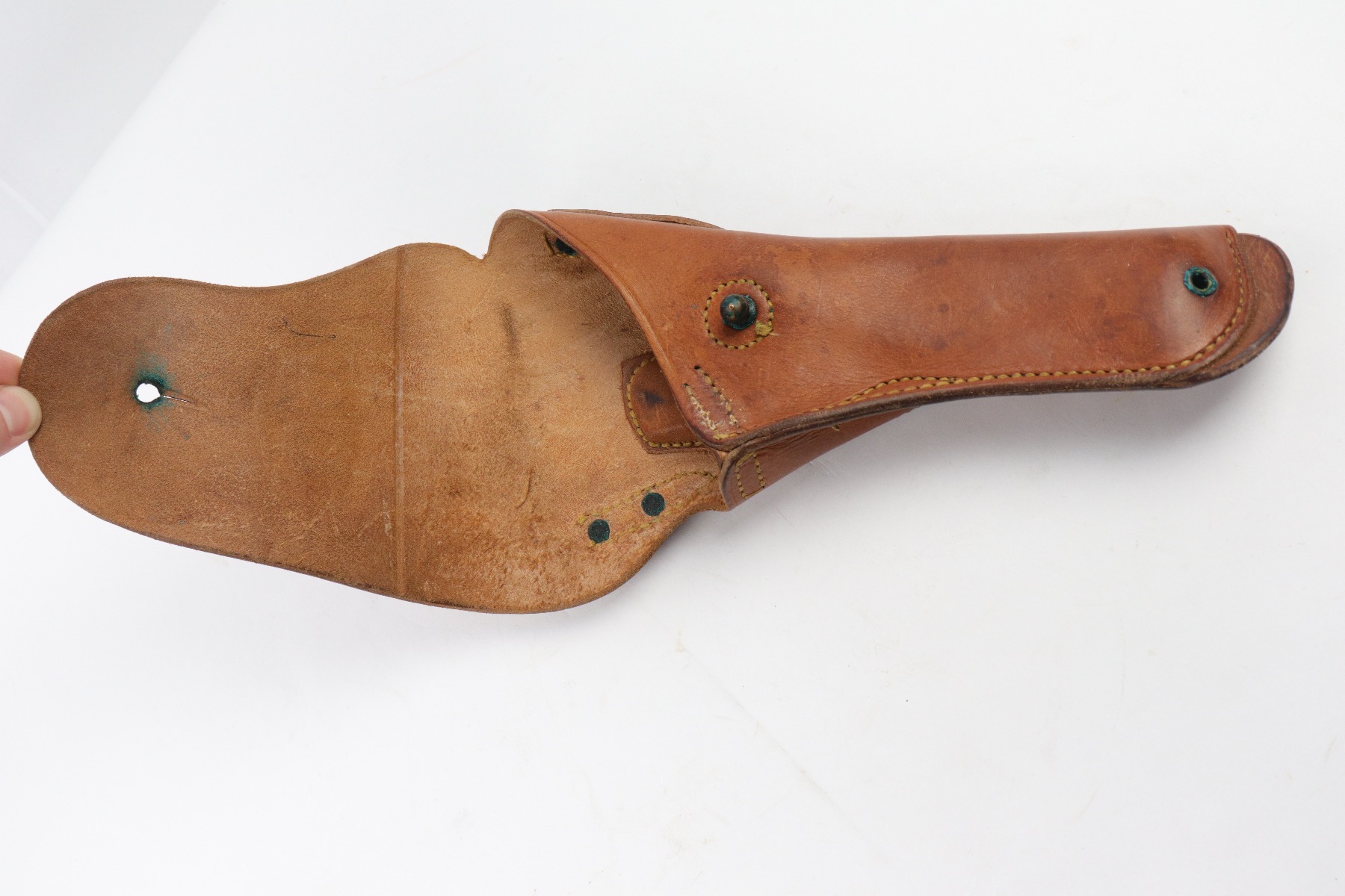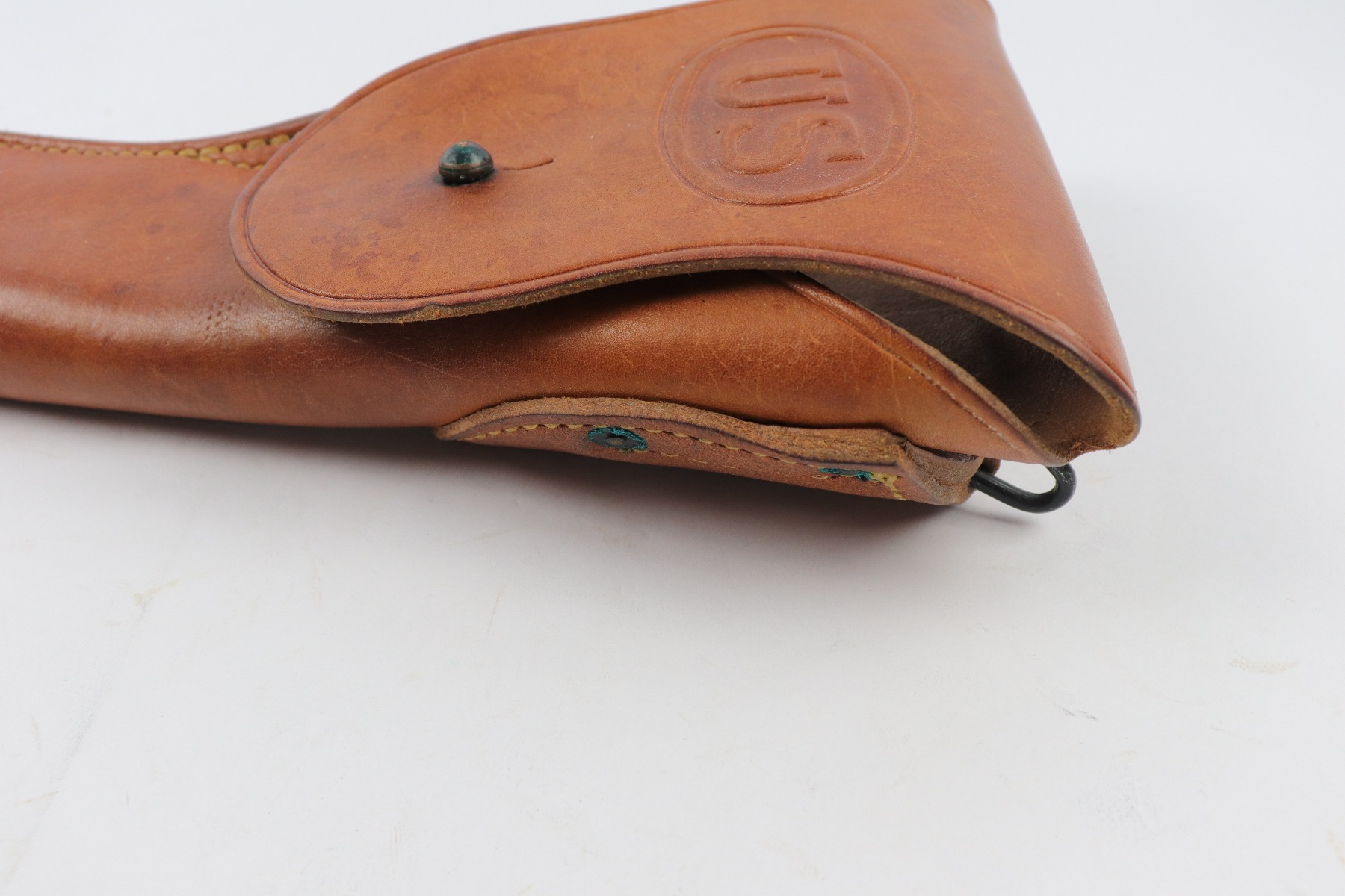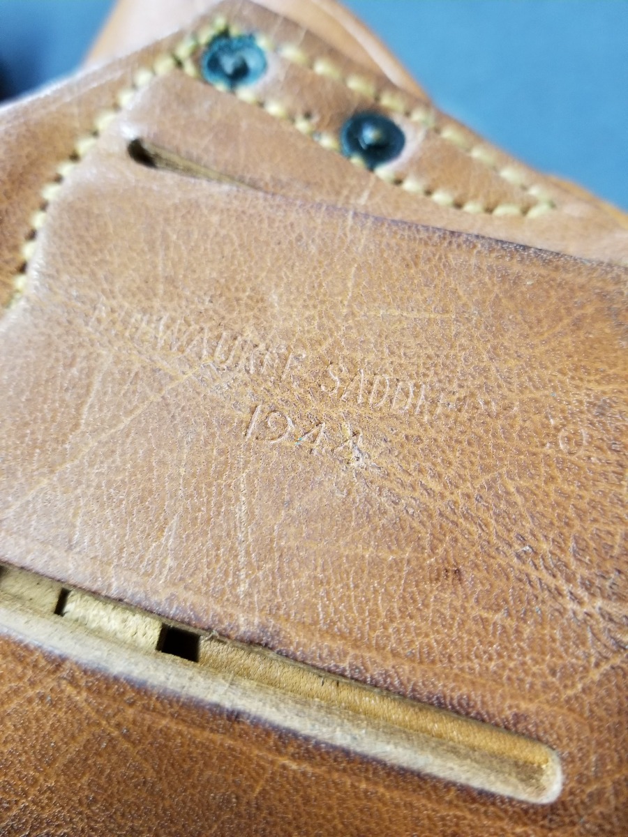 3/30/18 – This is an original 1944 dated 1911A1 holster made by Milwaukee Saddle Co. The holster is beatuiful light brown leather in excellent condition with no notable flaws. Clean interior leather as well. The leather is lightly pliable, and all original. The stitching is all original and excellent as well. Guaranteed original and authentic.