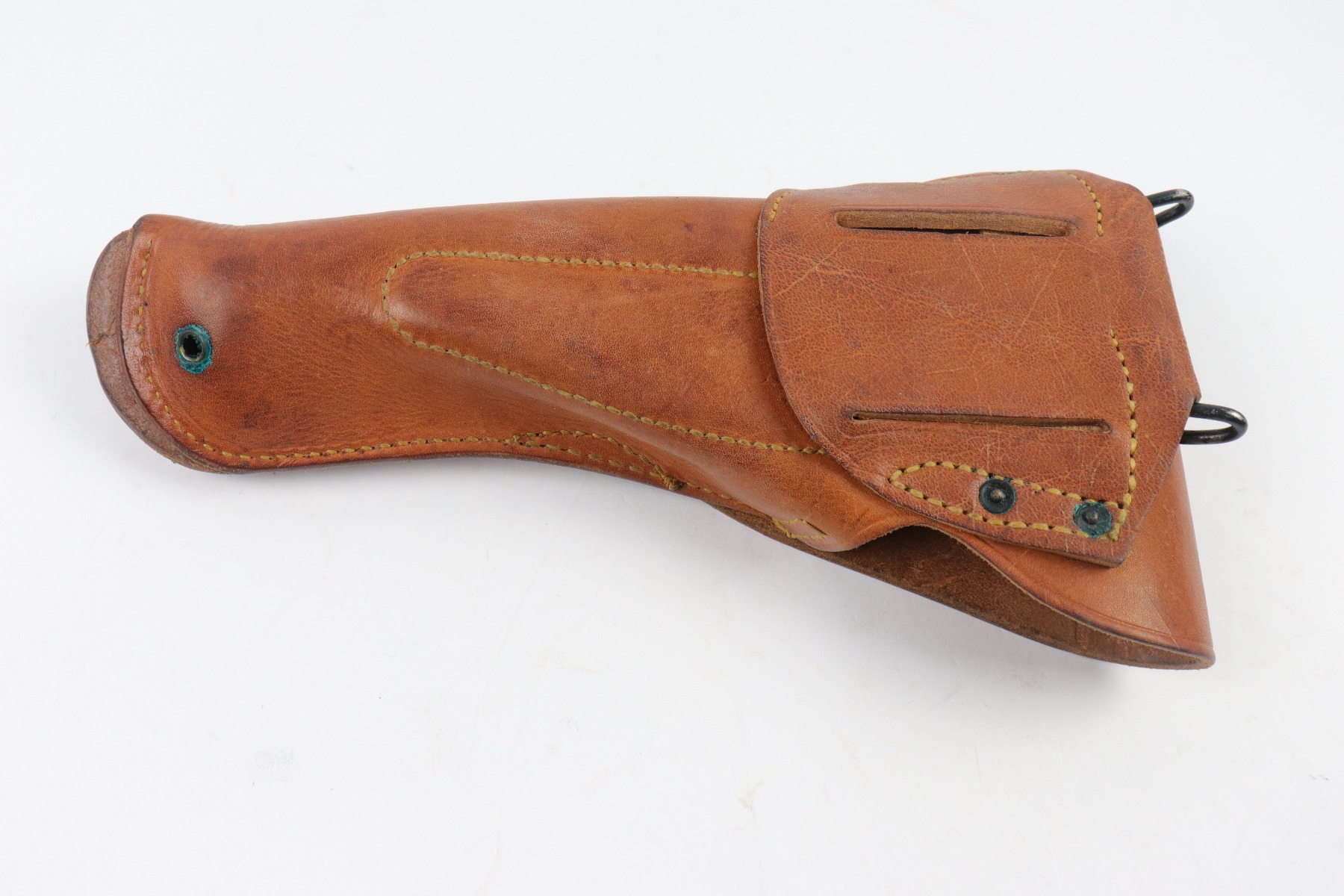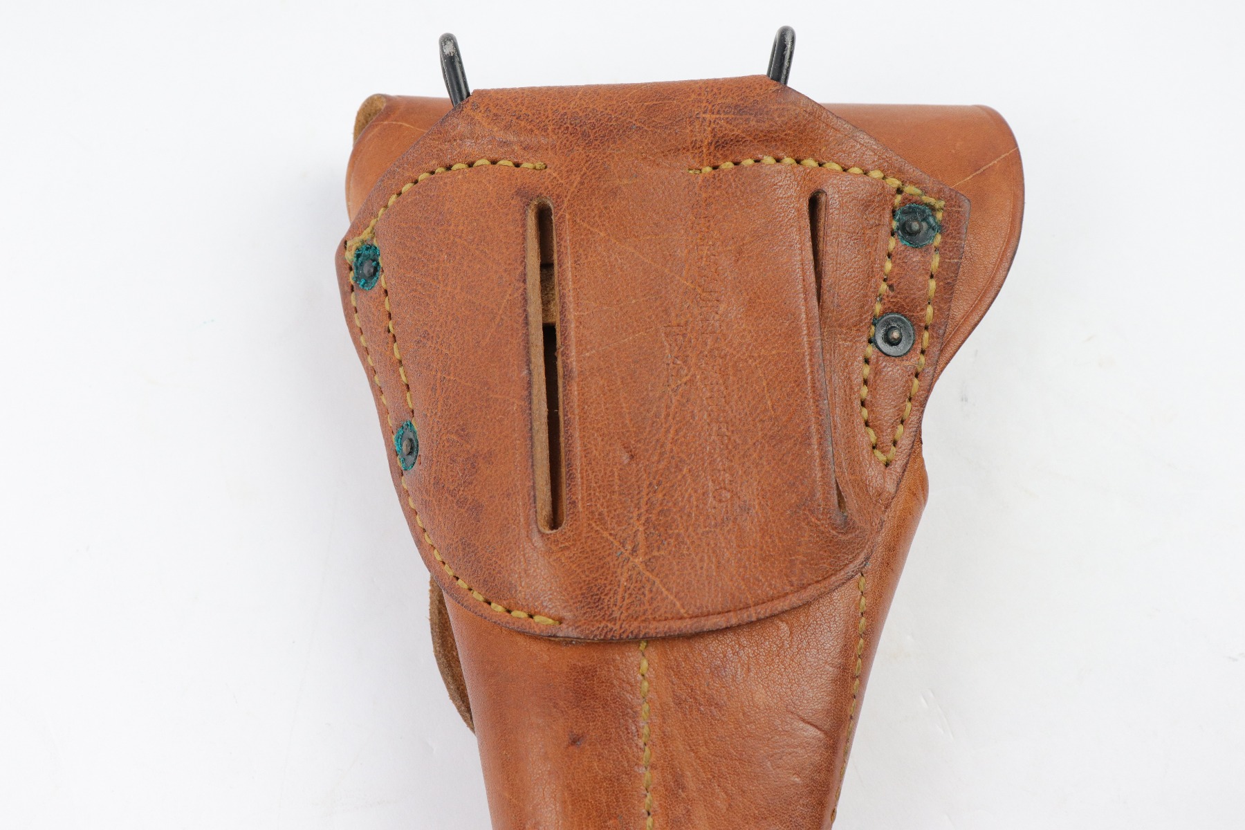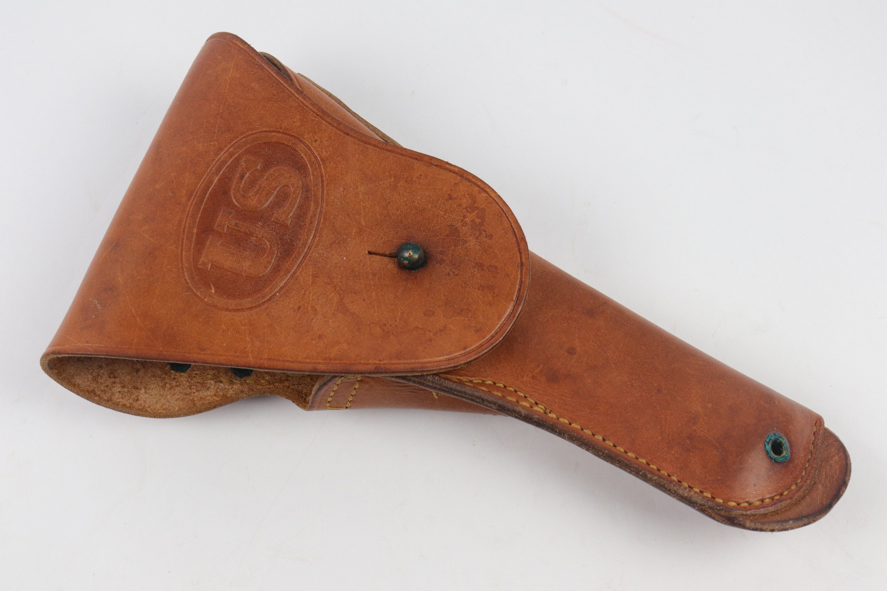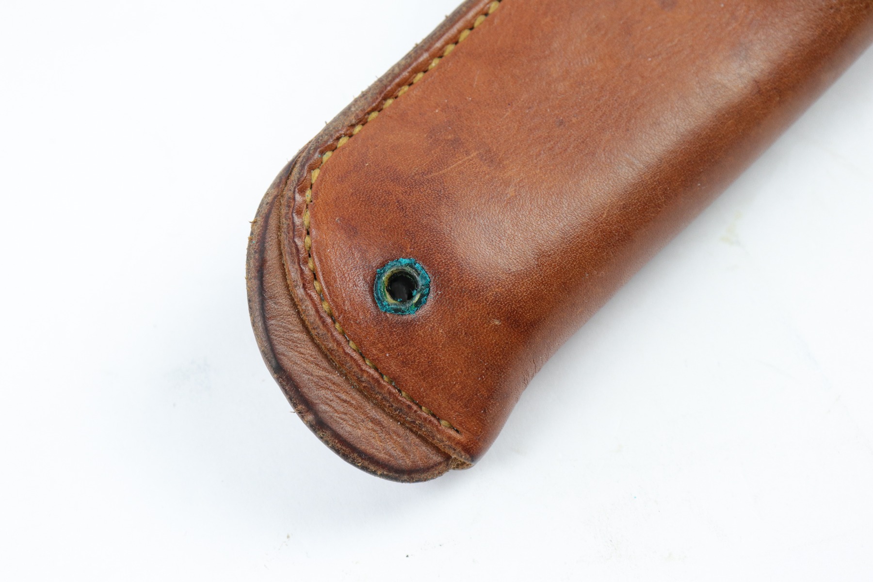 3/30/18 – This is an original 1944 dated 1911A1 holster made by Milwaukee Saddle Co. The holster is beatuiful light brown leather in excellent condition with no notable flaws. Clean interior leather as well. The leather is lightly pliable, and all original. The stitching is all original and excellent as well. Guaranteed original and authentic.