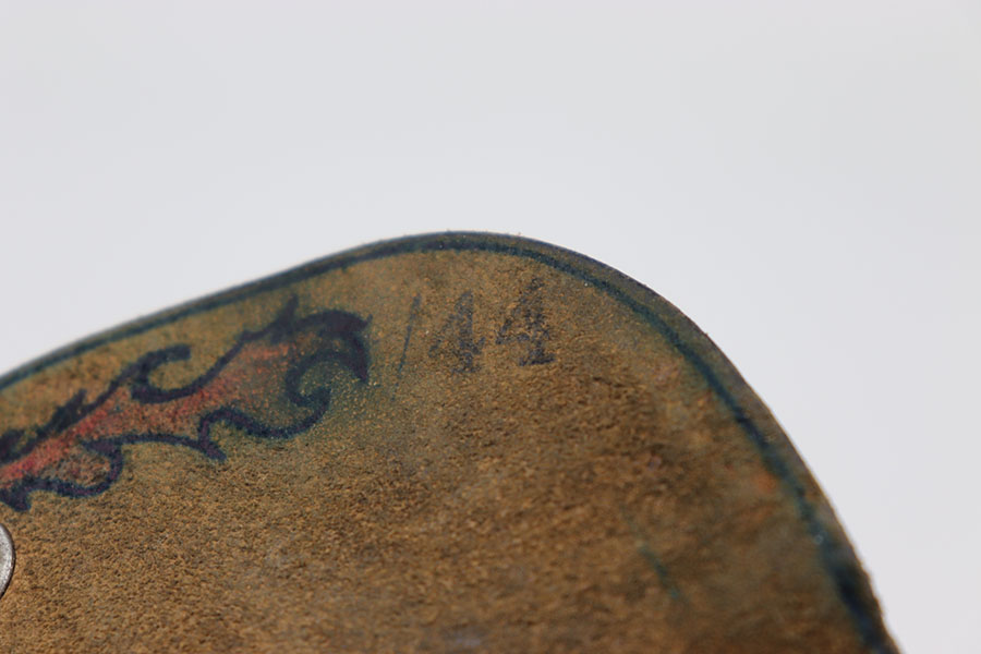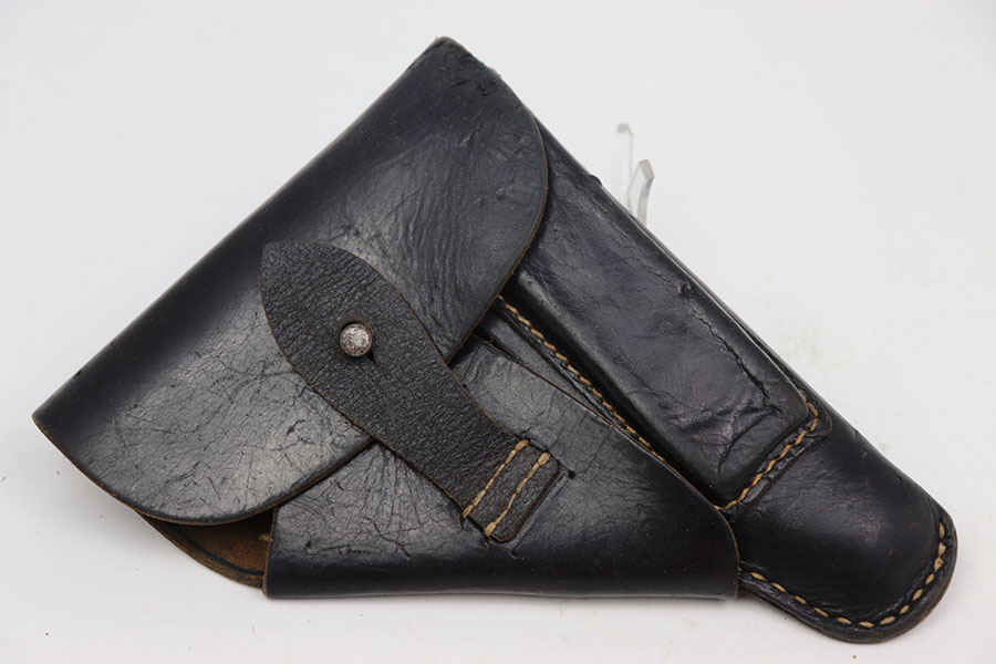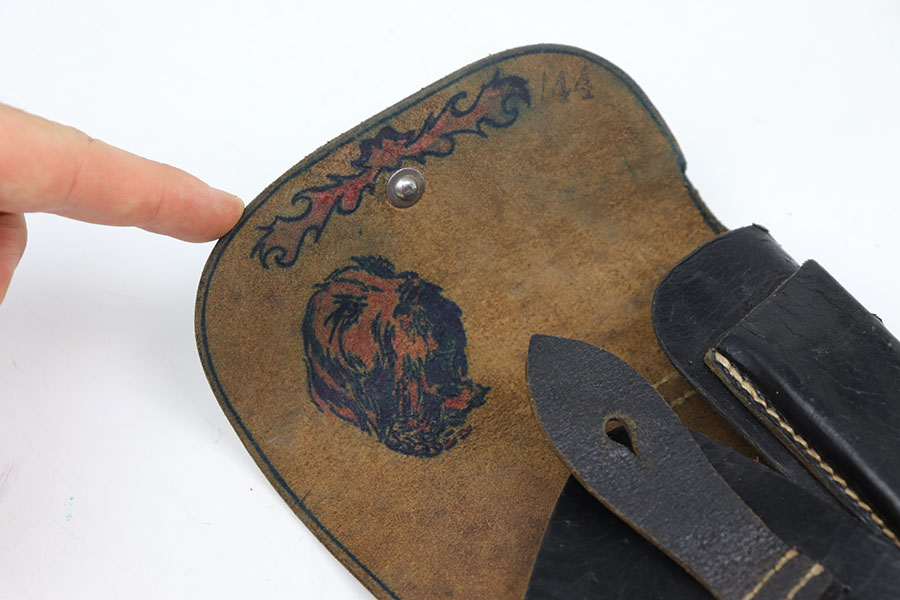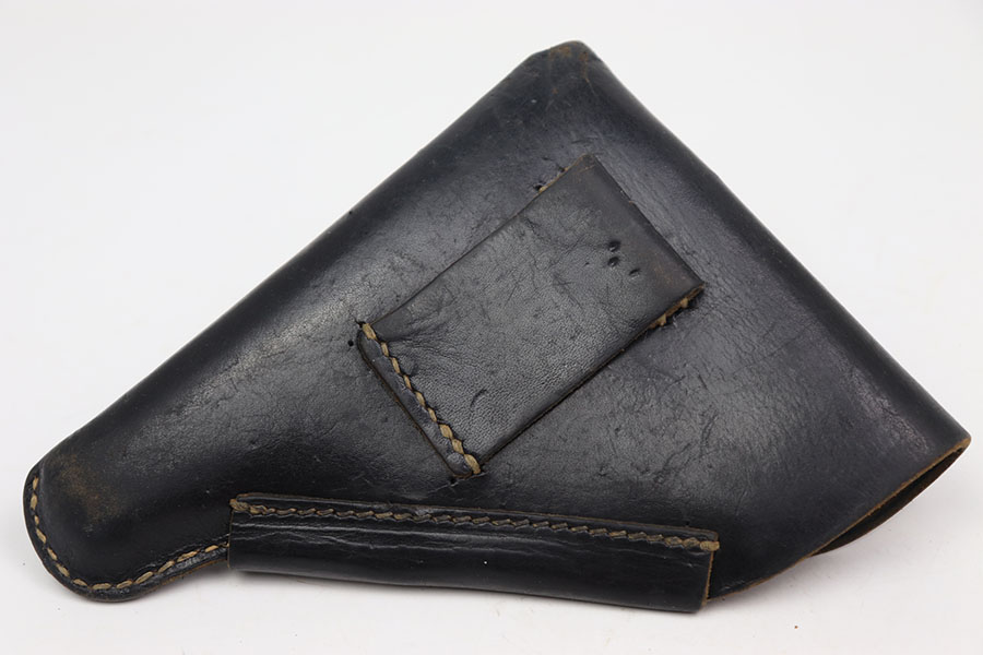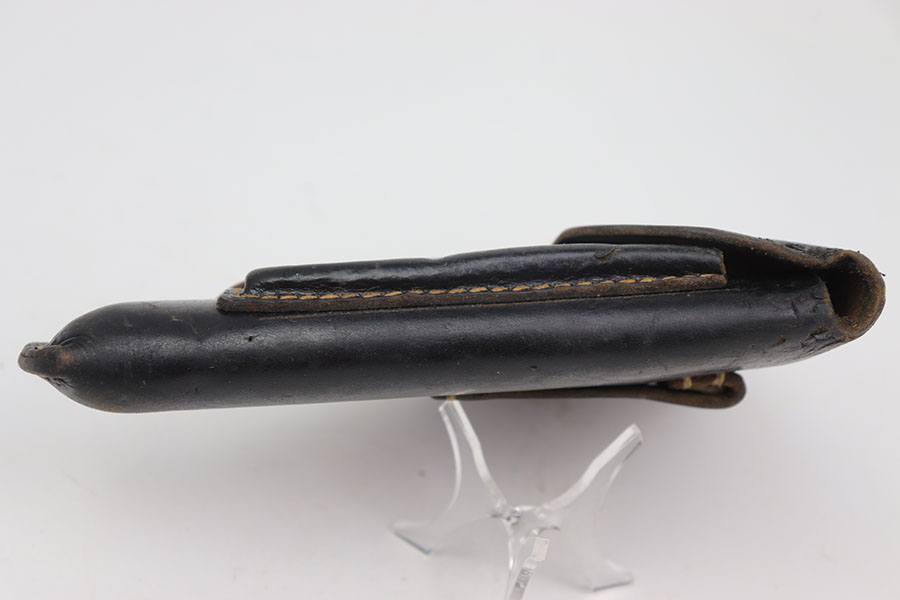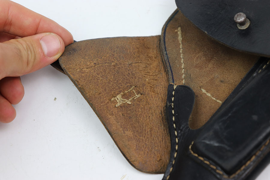 7/30/24 – This is a great example of a 1944 production holster for a 7.65mm Axis pistol. The holster has normal pliability and some mild signs wear such as wrinkling and cracking as seen in the photos. Clean, crisp stitching throughout. Interior leather is stamped “/44” as shown. I assume the maker was ink stamped on the left side of the “/44” but cannot be made out due to the other writing. Still a great late war example.