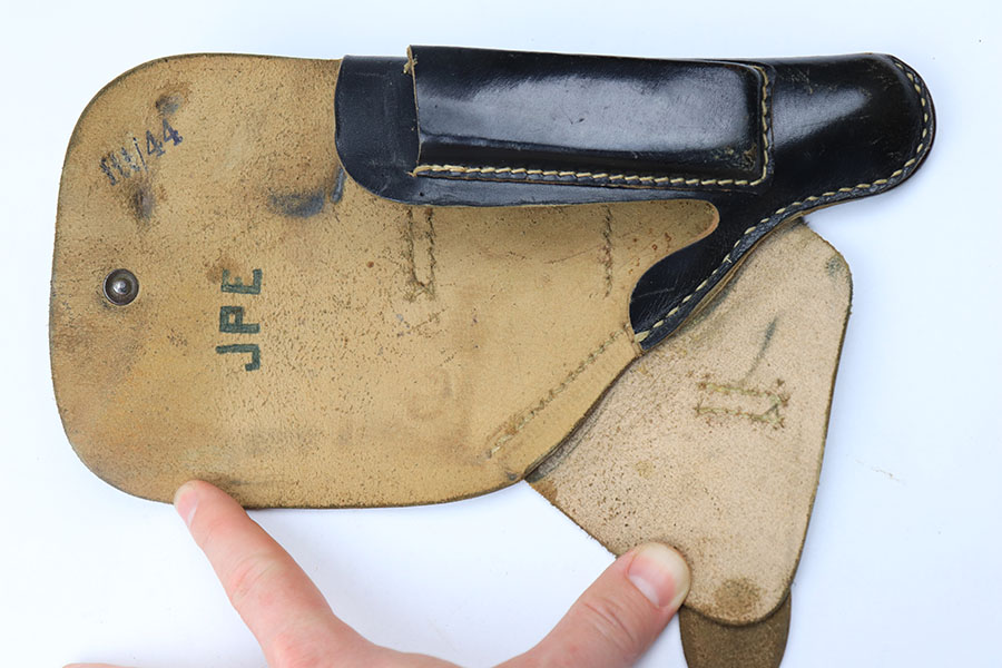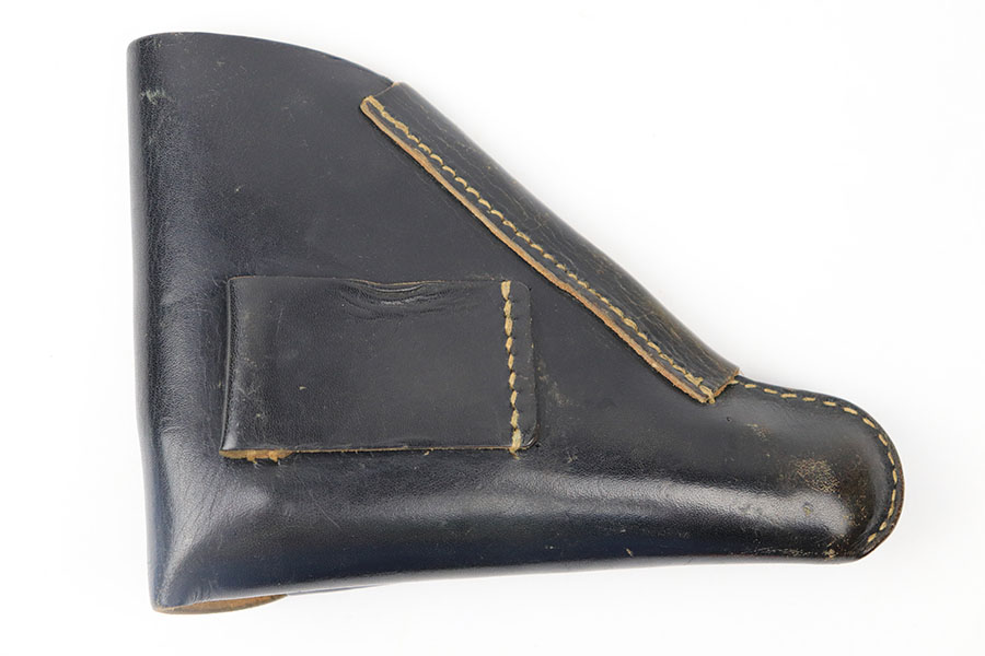 6/25/21 – This is a WW2 era axis pistol holster, often paired with a Sauer 38h or Mauser HSc. The interior leather is “ftt/44” ink stamped. No other markings. There is some light surface wrinkling and typical signs of aging and use wear throughout the leather. No stitching issues, and a fairly clean interior.