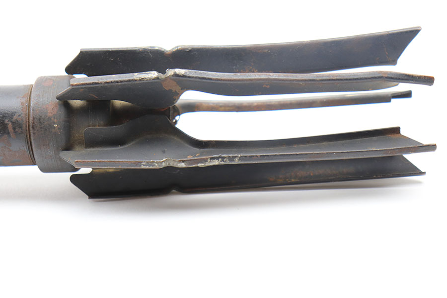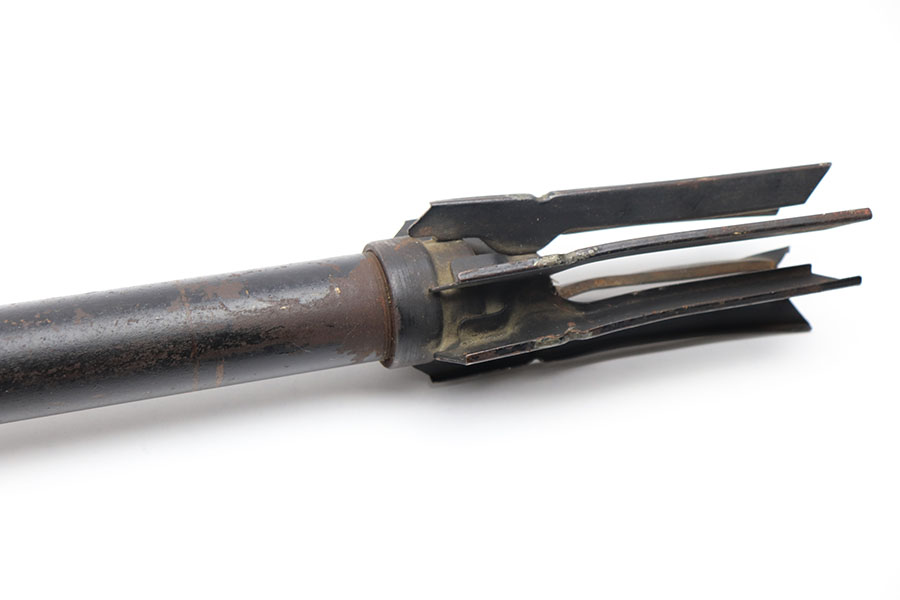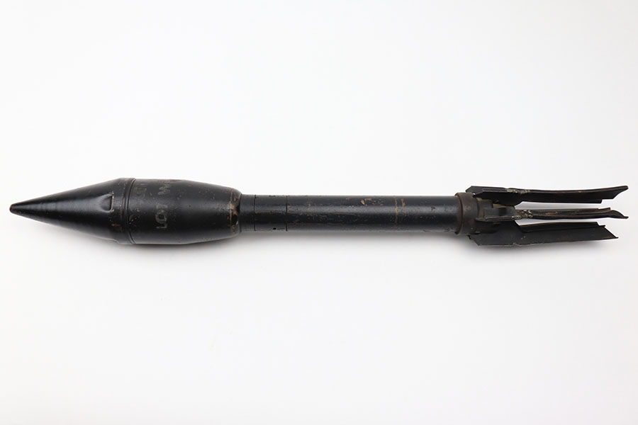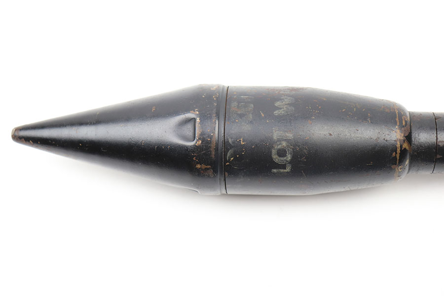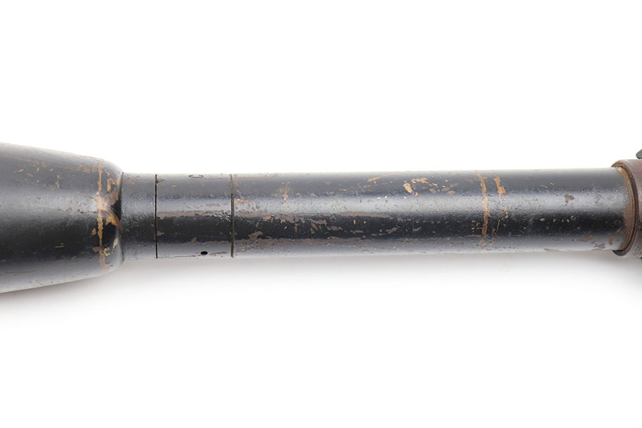 5/6/21 – This is an original 1944 dated practice round for a bazooka rocket launcher. The round is approx. 22 inches long and is currently inert. These rounds were used for training by the U.S. military during WW2. The head of the round is faintly marked with a lot number and dated 1944. The black painted finish is in good overall condition although there is some rust colored patina throughout and some areas of missing finish. The flight fins are slightly bent but still in good overall condition.