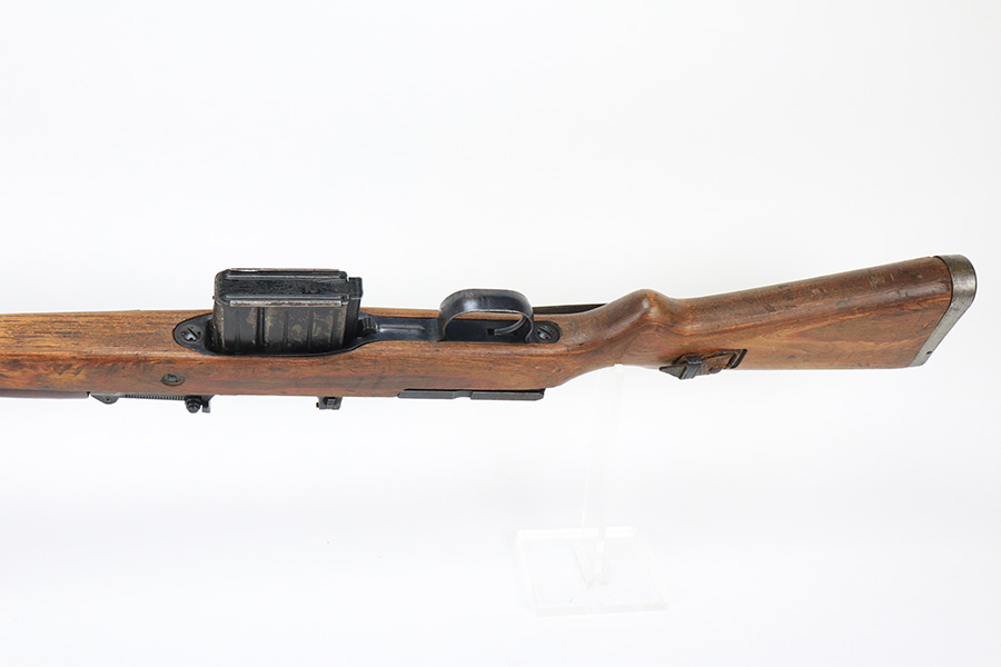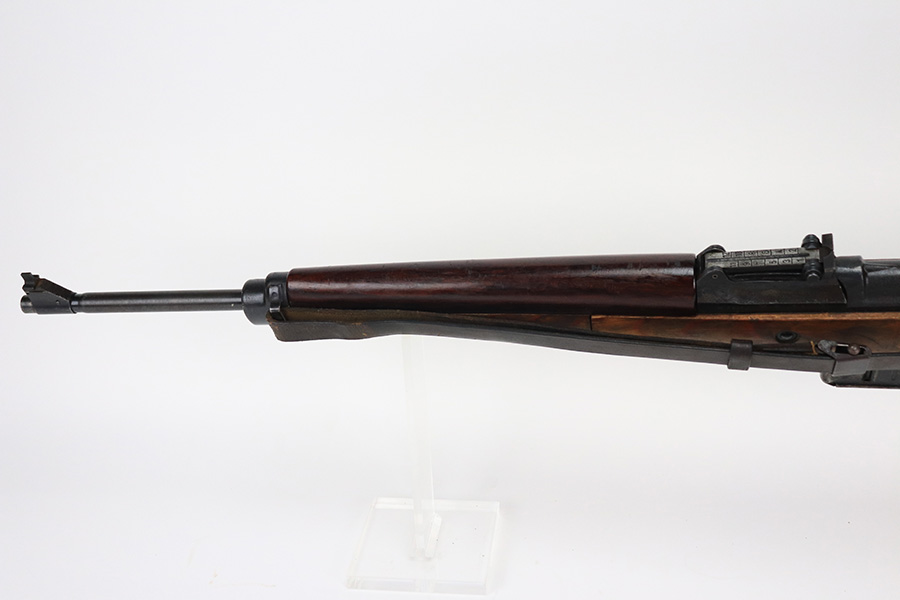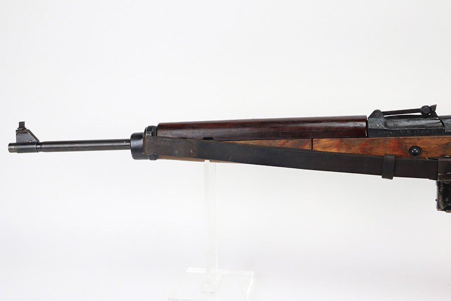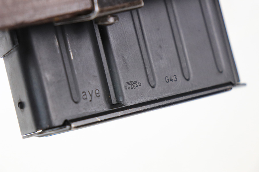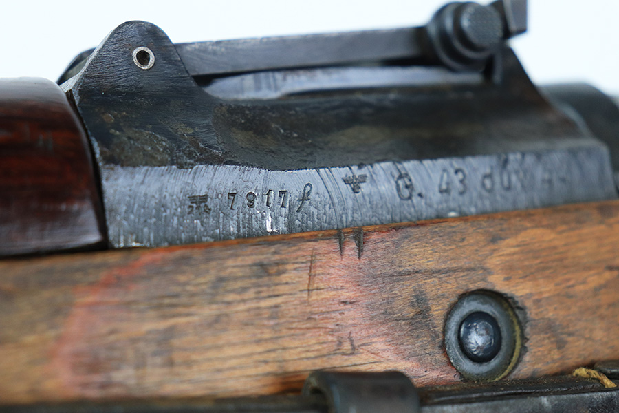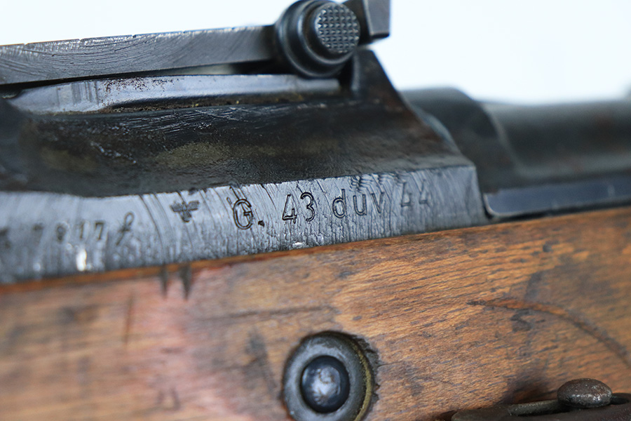 1/26/22 – This a very nice example of a Berlin-Lubecker G.43 issued to the Nazi military in 1944. The gun is entirely matching, including the stock. The bolt housing has matching electro-penciled numbering on the top. Proper waffen military proofs throughout. The left side of the receiver is dated 1944 and has the “duv” Berlin-Lubecker factory code. This particular gun also has a scarce red resin hand guard. Unfortunately, the stock has been duffle-cut, so the front portion of the stock and upper hand guard move freely. It comes with an original leather sling and one nice reproduction magazine. There is very little actual finish loss except for some minor wear around the muzzle and light scratches and handling marks on the barrel band and trigger guard. There is light spotty oxidation covering most of the metal parts. Some areas of significant oxidation on the butt plate. Overall, the stock is nice, but there is a small crack on the left side of the butt stock adjacent to the butt plate. One repaired crack on the left side of the stock where it is duffle-cut. There appears to a name scratched lightly into the right side of the butt stock. The bore has strong rifling, but there is spotty oxidation in the grooves.