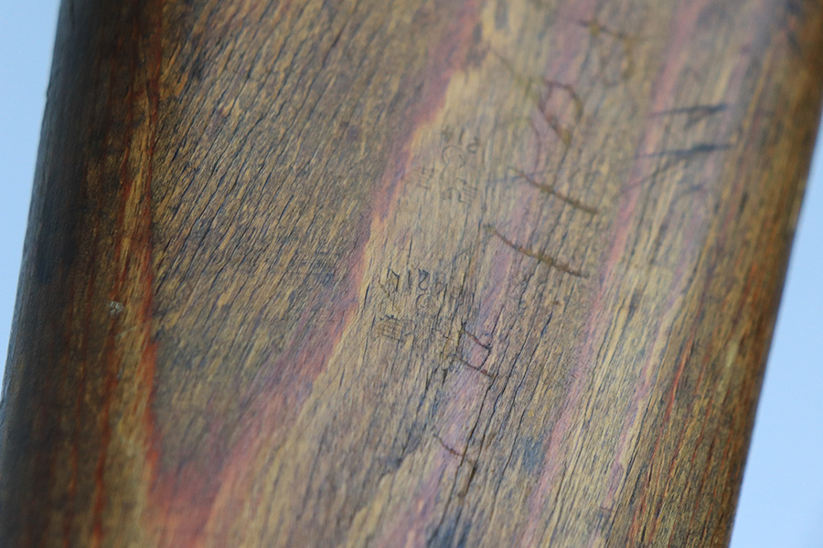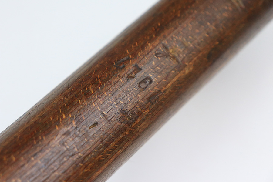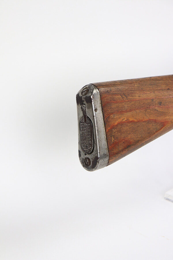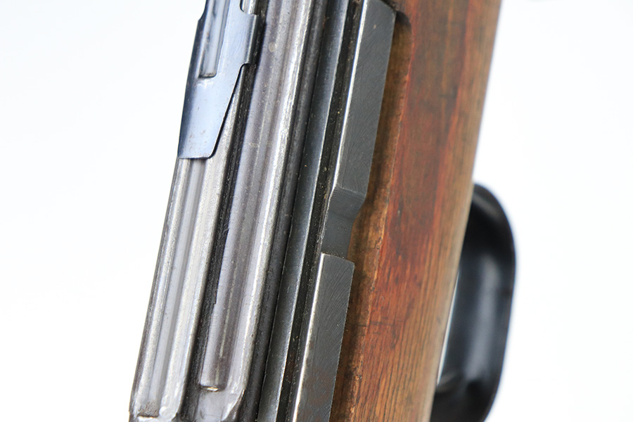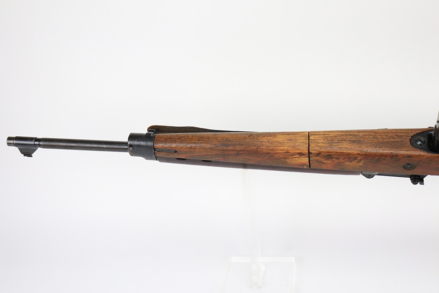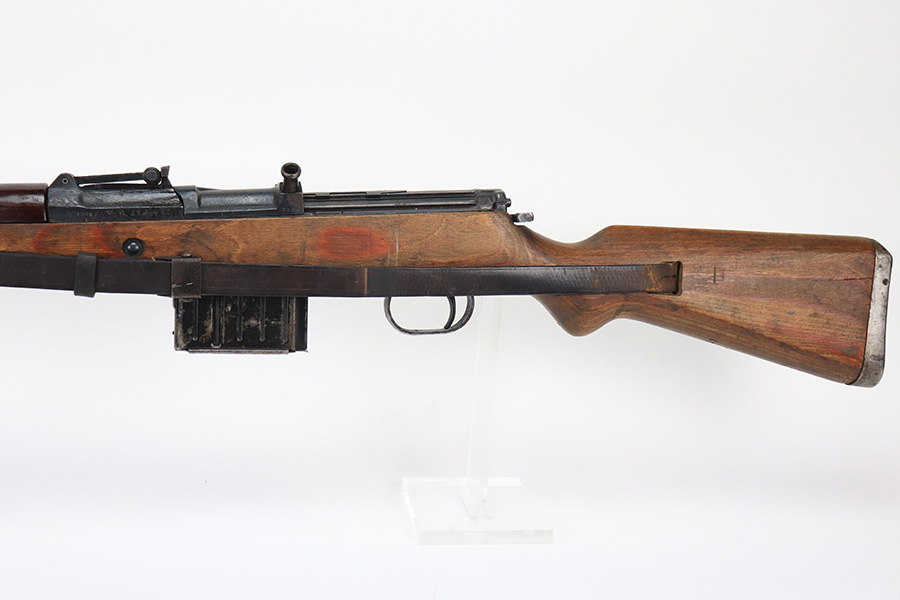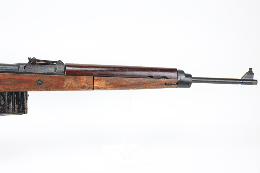 1/26/22 – This a very nice example of a Berlin-Lubecker G.43 issued to the Nazi military in 1944. The gun is entirely matching, including the stock. The bolt housing has matching electro-penciled numbering on the top. Proper waffen military proofs throughout. The left side of the receiver is dated 1944 and has the “duv” Berlin-Lubecker factory code. This particular gun also has a scarce red resin hand guard. Unfortunately, the stock has been duffle-cut, so the front portion of the stock and upper hand guard move freely. It comes with an original leather sling and one nice reproduction magazine. There is very little actual finish loss except for some minor wear around the muzzle and light scratches and handling marks on the barrel band and trigger guard. There is light spotty oxidation covering most of the metal parts. Some areas of significant oxidation on the butt plate. Overall, the stock is nice, but there is a small crack on the left side of the butt stock adjacent to the butt plate. One repaired crack on the left side of the stock where it is duffle-cut. There appears to a name scratched lightly into the right side of the butt stock. The bore has strong rifling, but there is spotty oxidation in the grooves.
