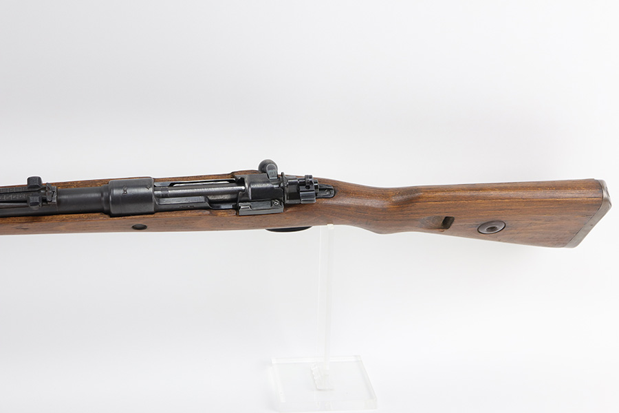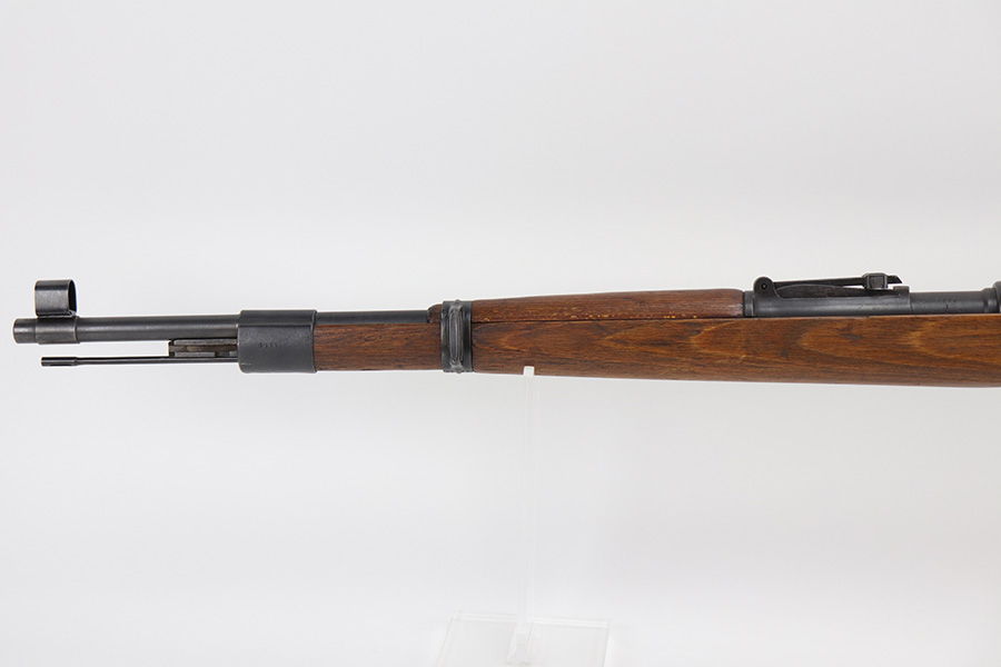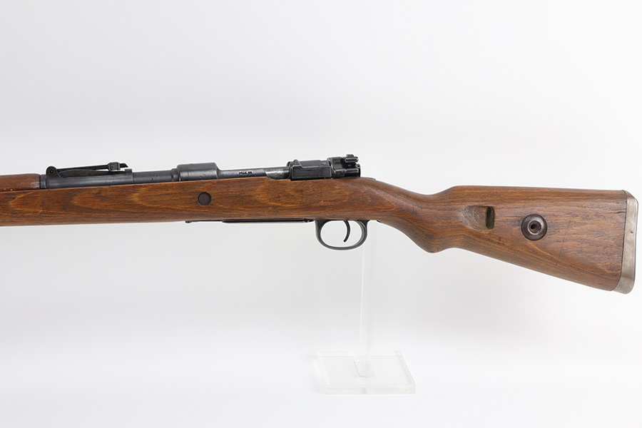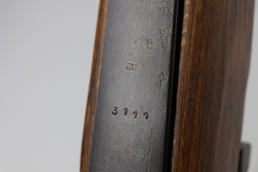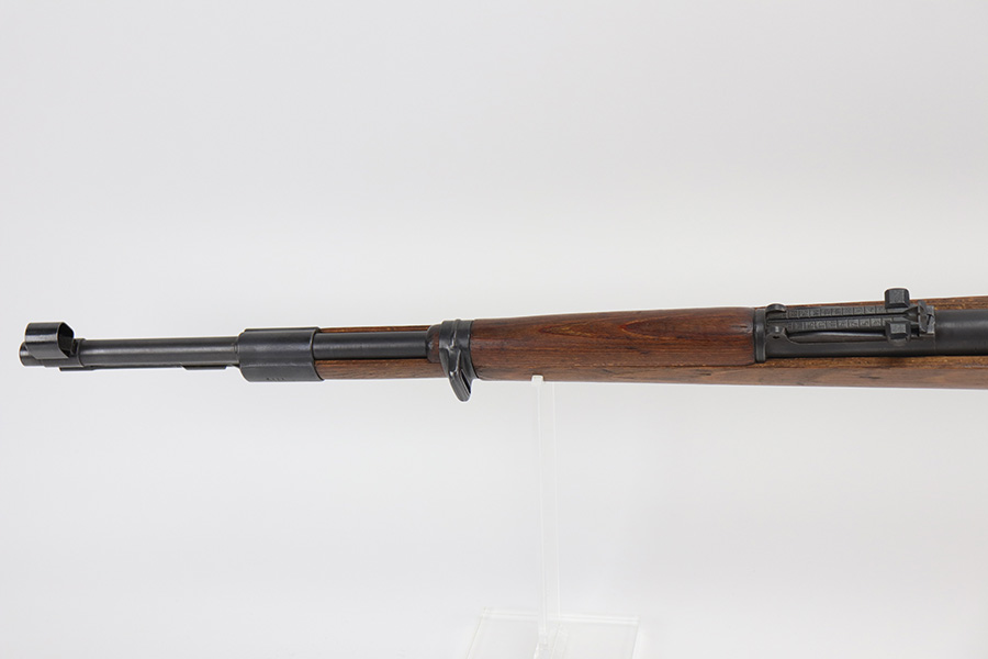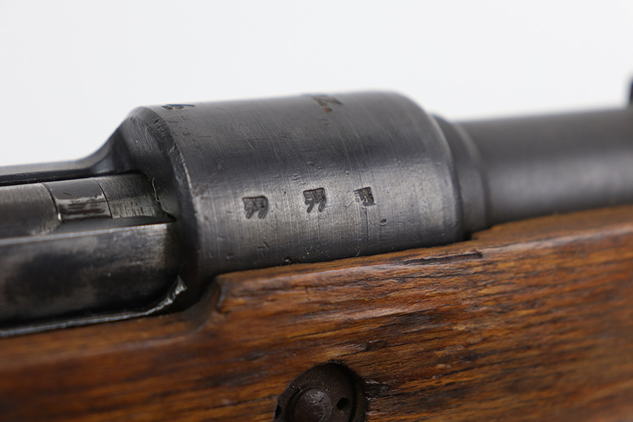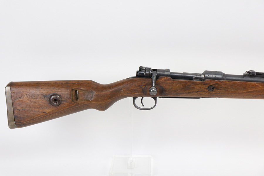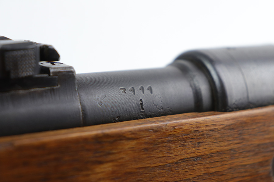 10/20/21 – This is an excellent example of a Steyr K98 Rifle issued to the Nazi military in 1944. All numbered parts are matching, but some are un-numbered. While the bolt is matching, the font looks different than the rest of the gun. It has the proper Nazi military acceptance proofs throughout. The stock is un-numbered and has no visible proofs. It has retained most of its finish. While there is very little finish loss, there is noticeable pin-pricking on the front barrel band and areas of pitting on the floor plate and on the left side of the receiver where the metal meets the wood. The wood stock is excellent with just very minor handling marks/light scratches here and there. The bore is excellent – shiny with strong rifling.