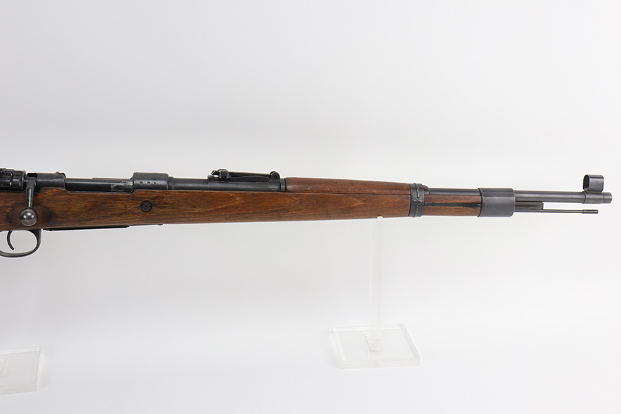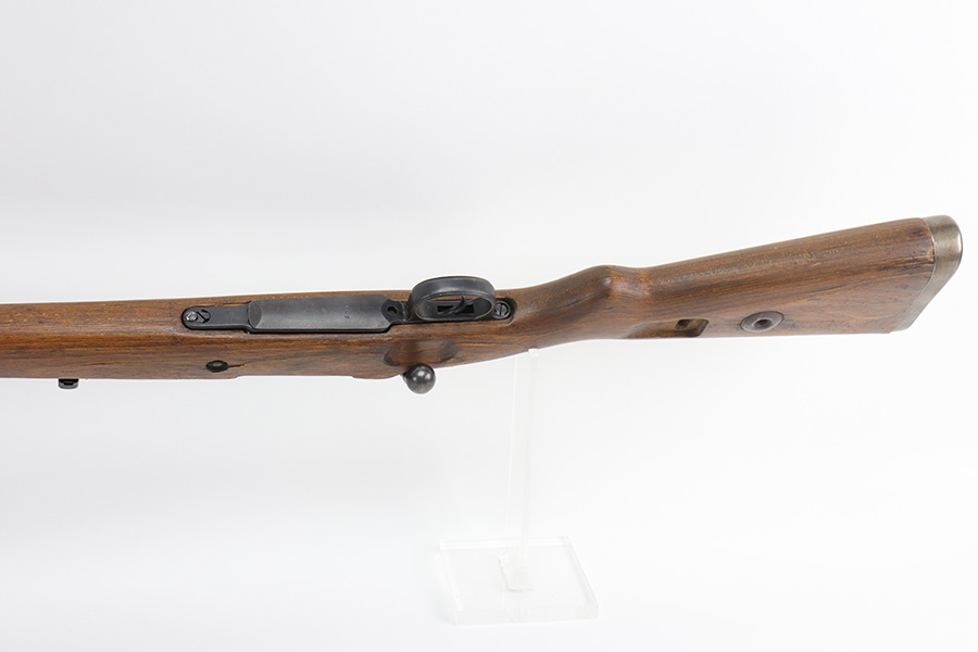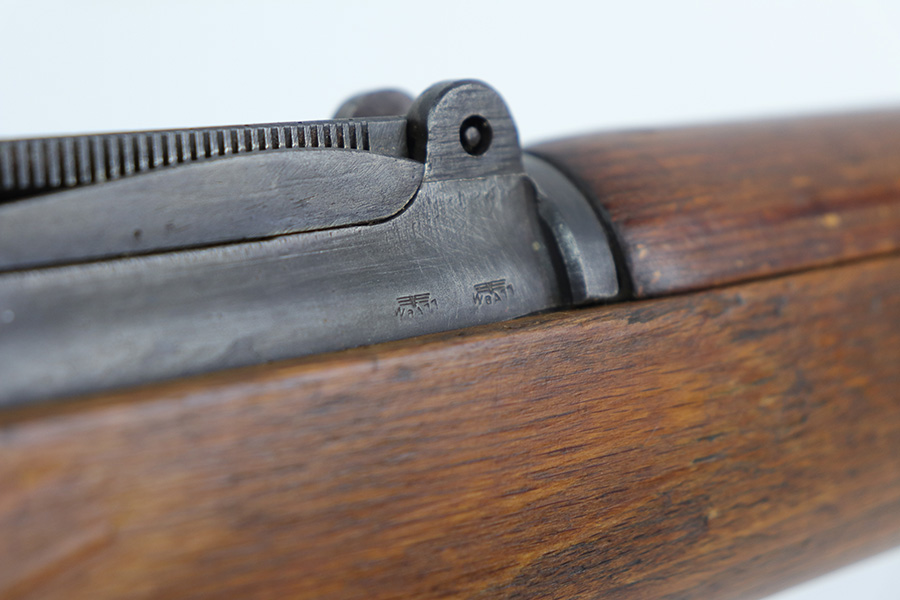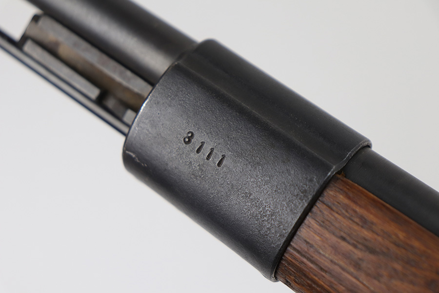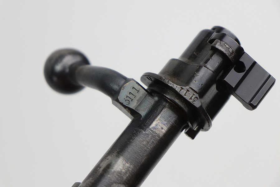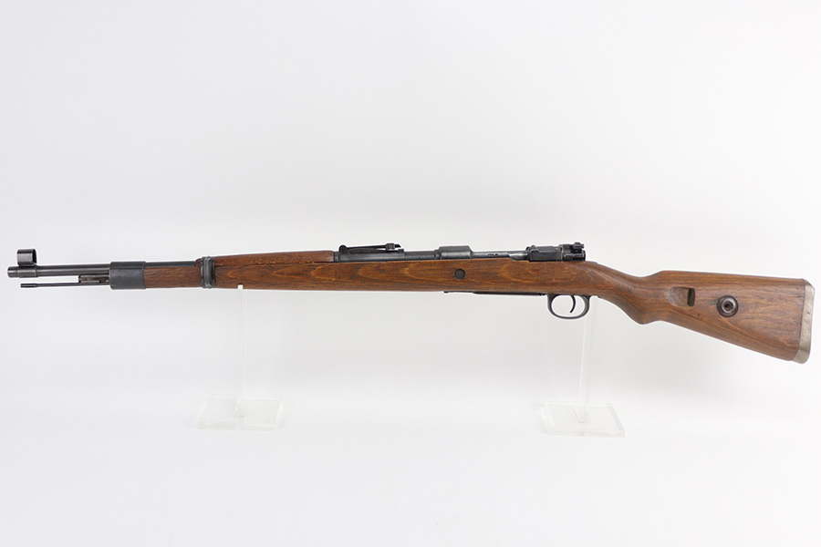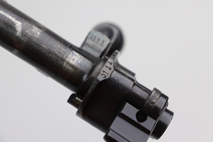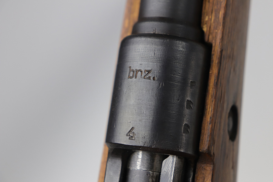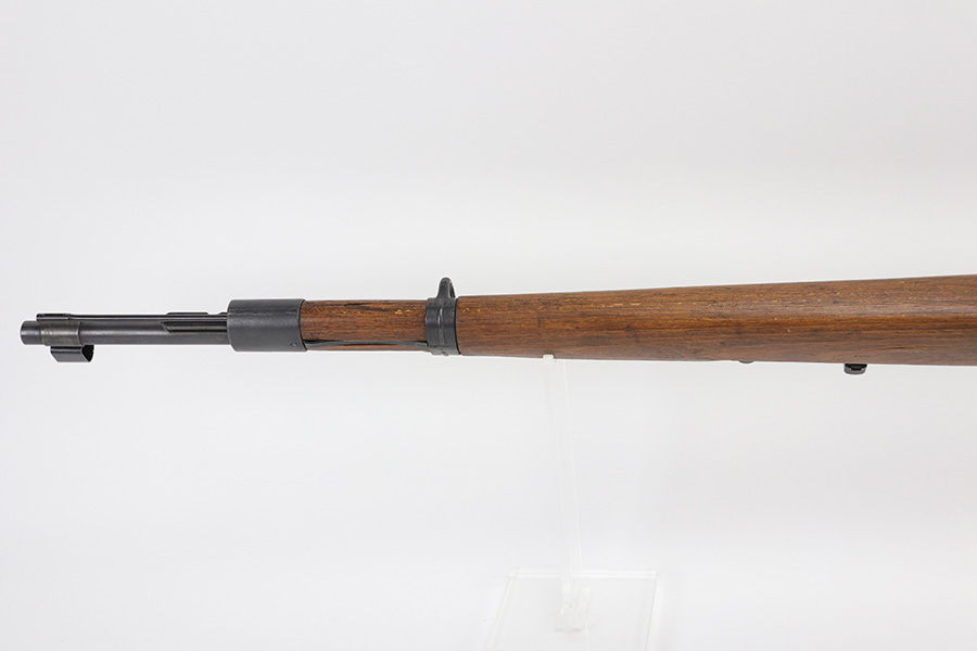 10/20/21 – This is an excellent example of a Steyr K98 Rifle issued to the Nazi military in 1944. All numbered parts are matching, but some are un-numbered. While the bolt is matching, the font looks different than the rest of the gun. It has the proper Nazi military acceptance proofs throughout. The stock is un-numbered and has no visible proofs. It has retained most of its finish. While there is very little finish loss, there is noticeable pin-pricking on the front barrel band and areas of pitting on the floor plate and on the left side of the receiver where the metal meets the wood. The wood stock is excellent with just very minor handling marks/light scratches here and there. The bore is excellent – shiny with strong rifling.