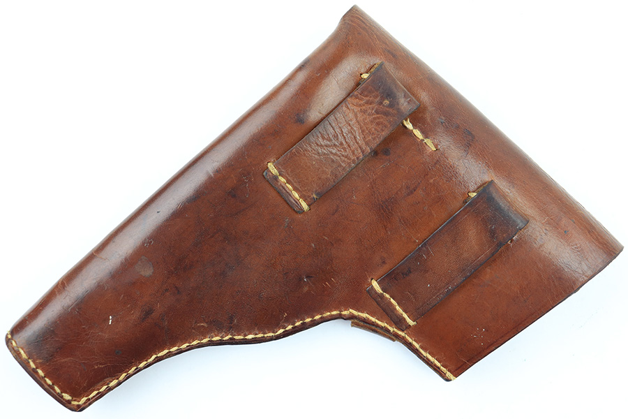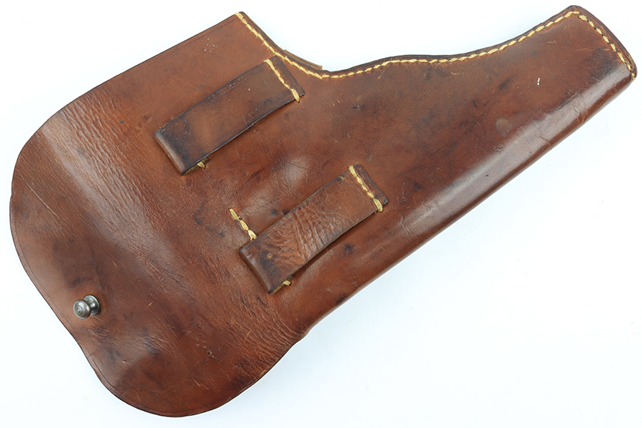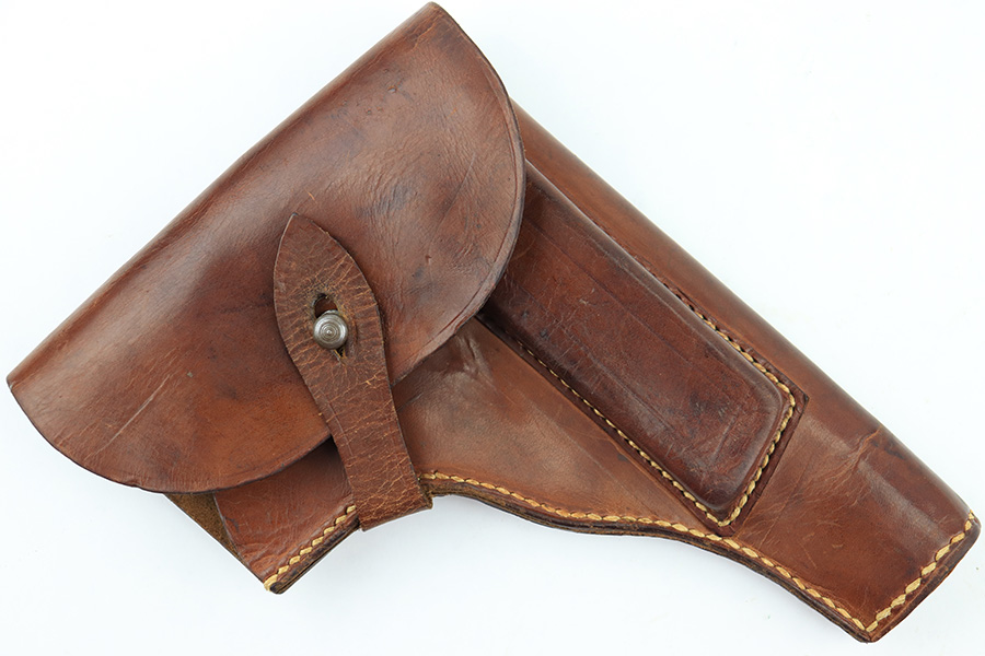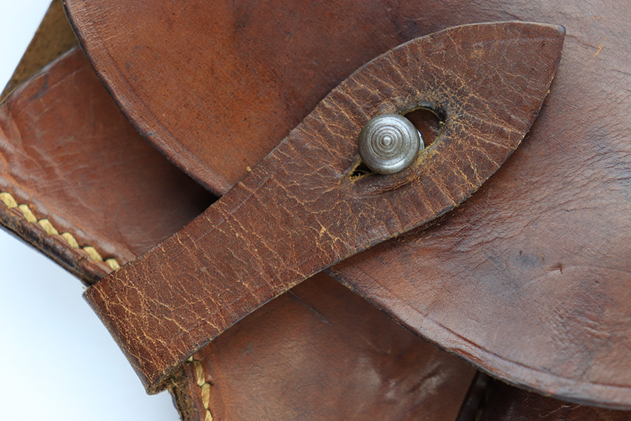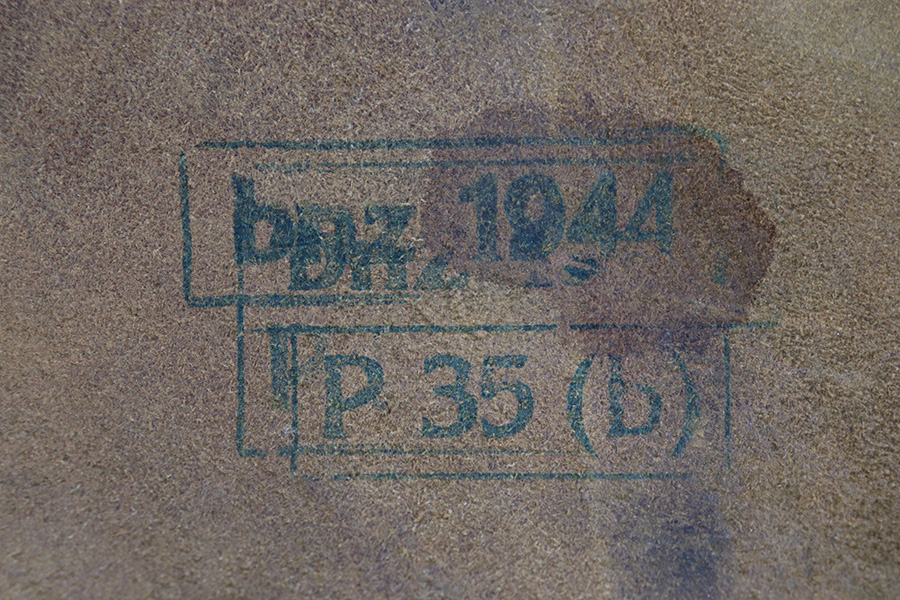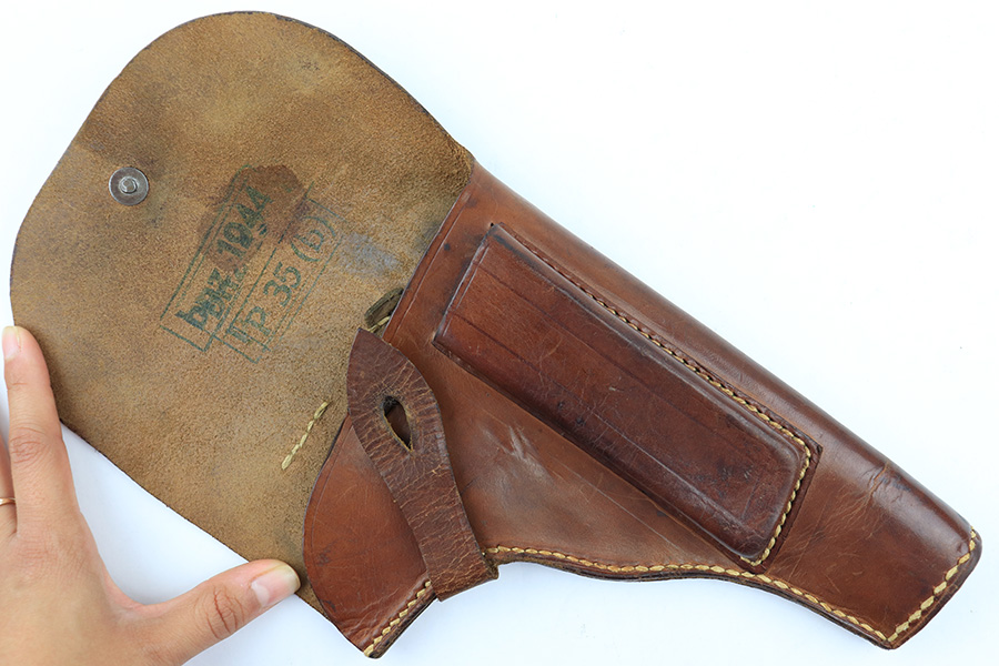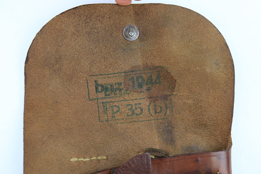 7/26/23 – This is an original 1944 dated Radom holster from WW2. The holster is ink stamped on the interior leather “bnz 1944” and designation ink stamped “P.35 (b)”. The leather is in great condition with light use wear and some mild surface wrinkling around the top leather. The original stitching is all tight and intact with no notable issues.