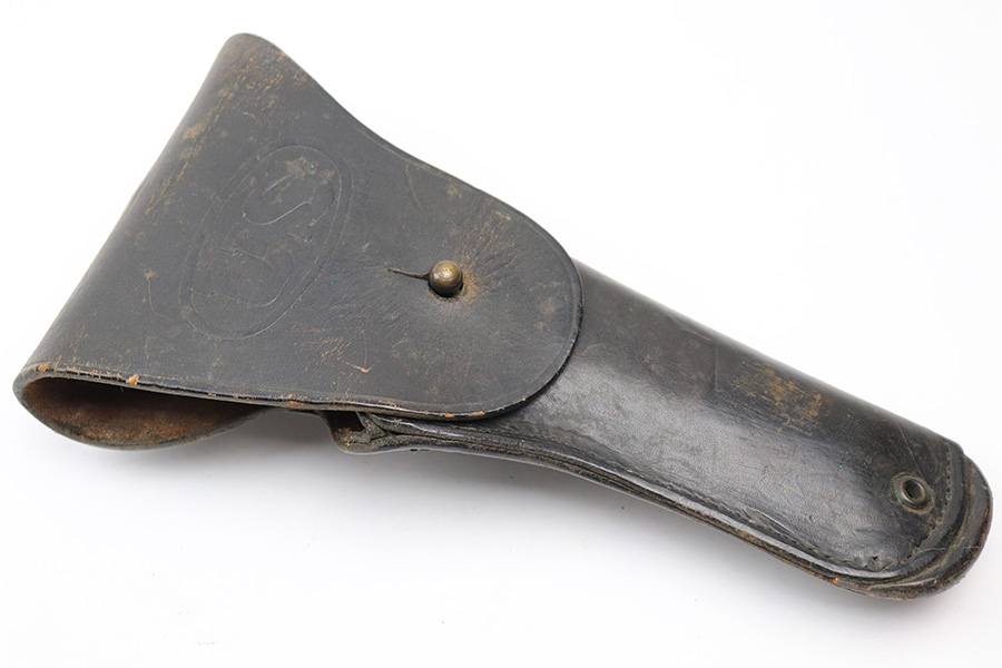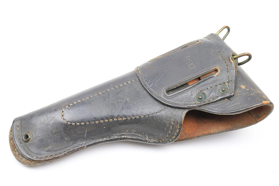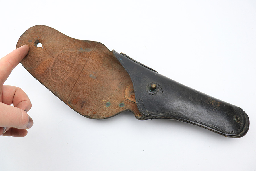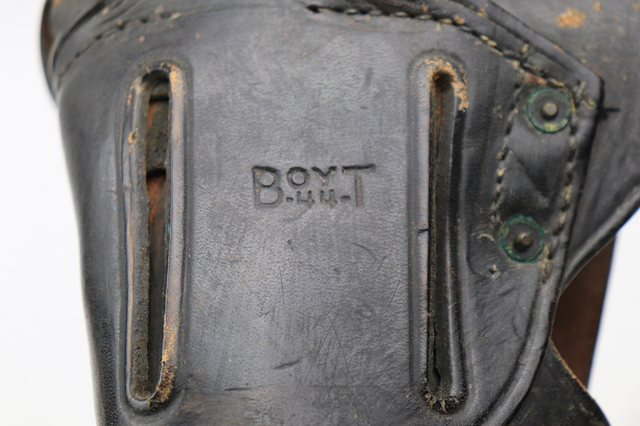 5/11/22 – This is a 1944 dated holster for a 1911A1 pistol. Great overall condition with attractive black leather and no stitching issues. Maker stamped and dated on the back leather. There’s some mild surface scuffing and wrinkling on the leather, but this is normal signs of aging and previous use. Clean interior leather.