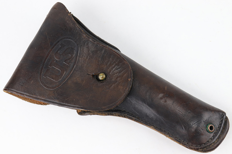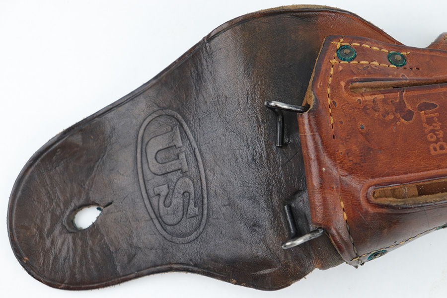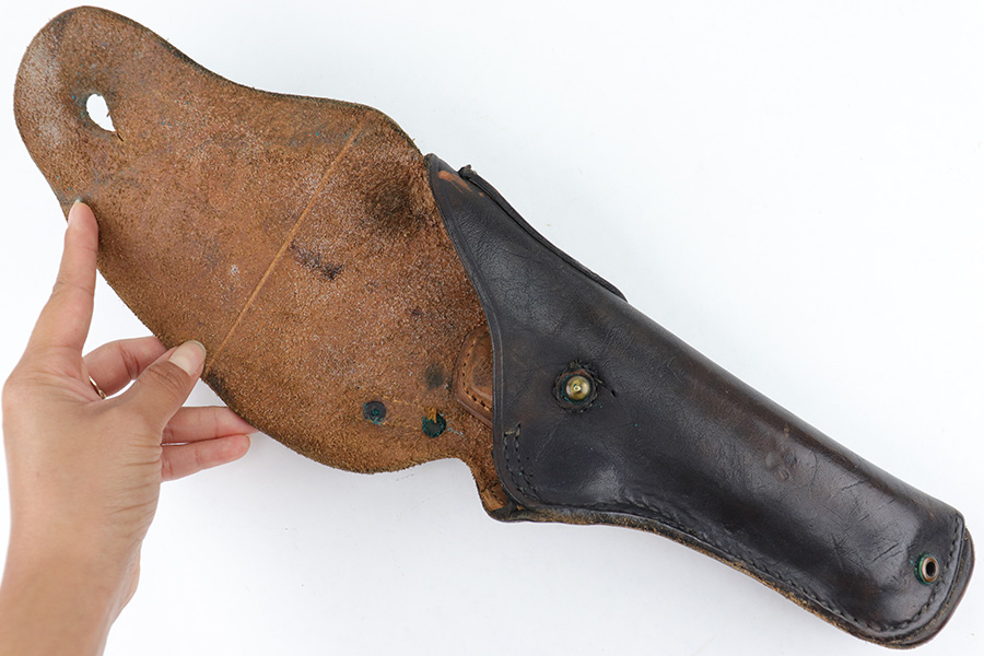 6/21/23 – This is an original WW2 production M1916 holster. The holster is in great condition with strong leather that has mild pliability. The front leather looks like it was once dyed black, but most of the dye has faded so the front leather is a darker shade than the back leather. The stitching is all tight and original with no issues. The back leather is maker stamped and dated, as shown. Clean interior leather and a brass closure stud.
