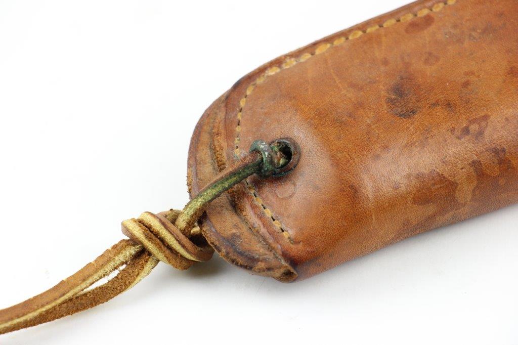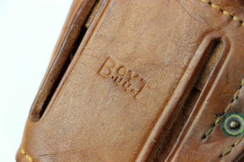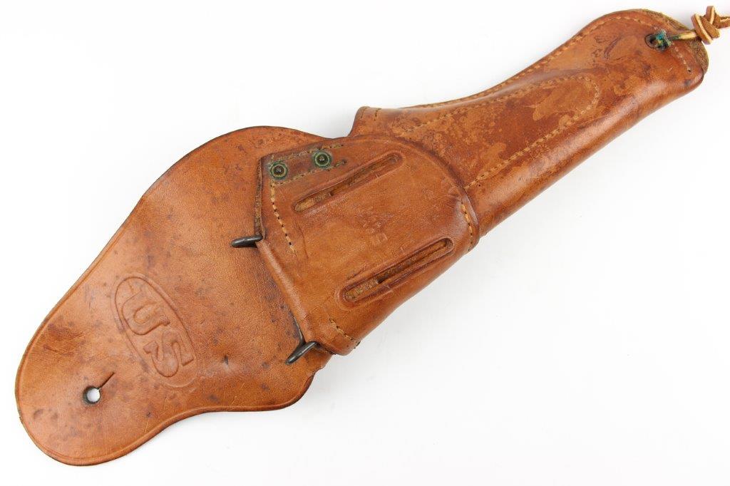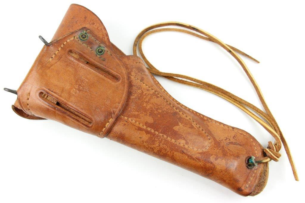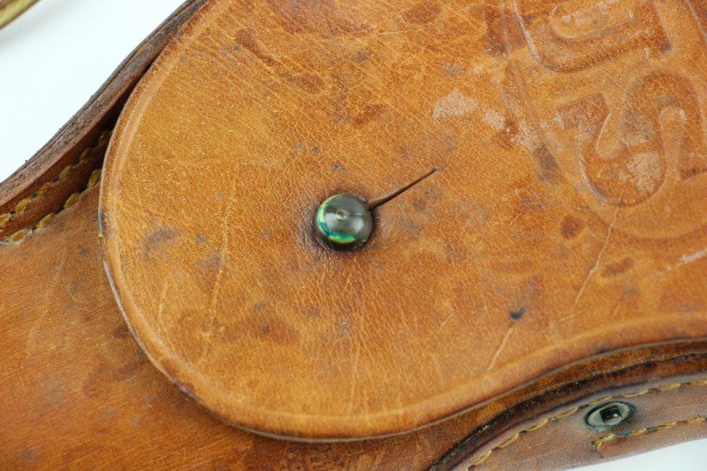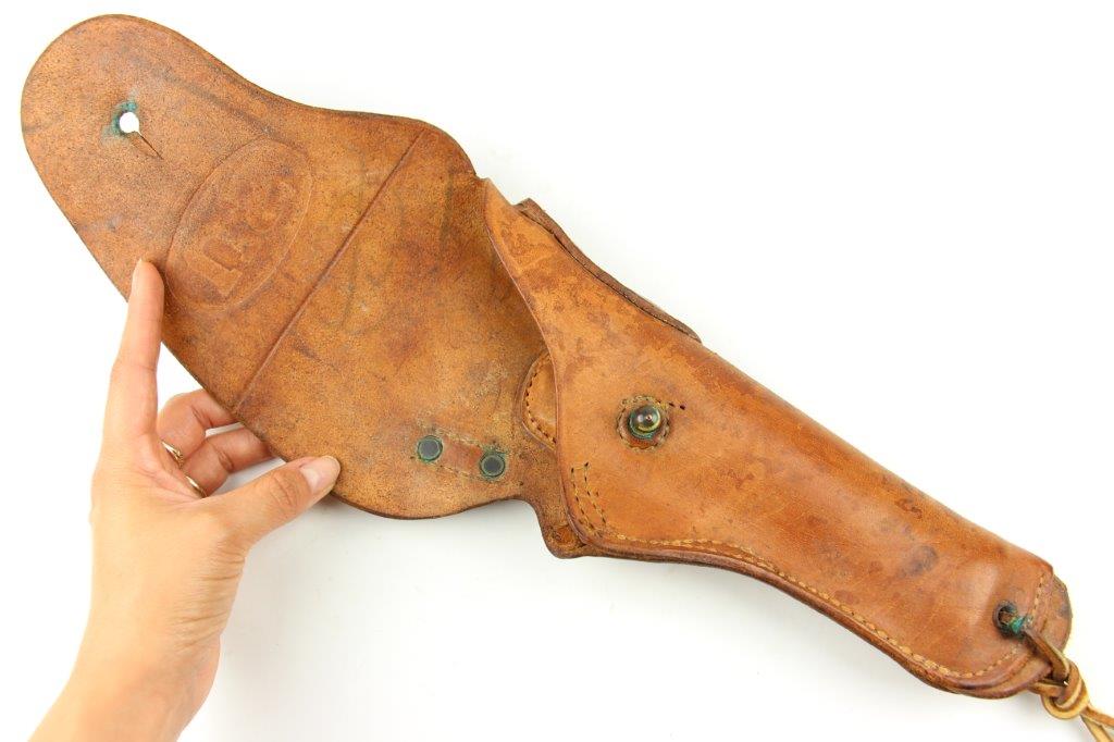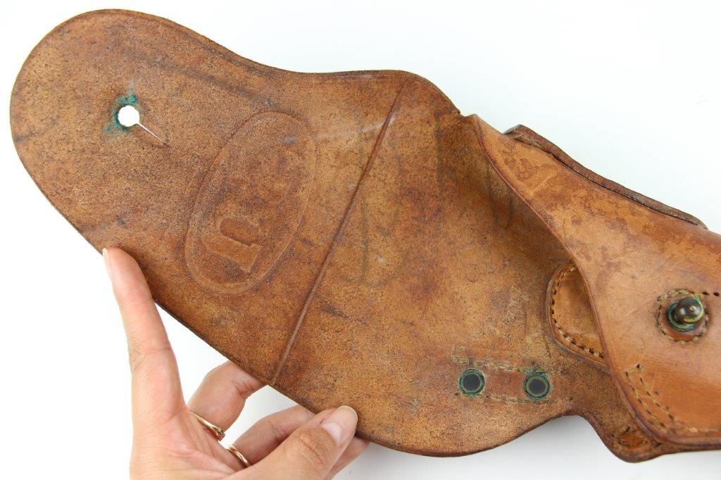 5/20/24 – This is an original WW2 US M1916 Holster. The holster is maker stamped and dated on the back leather, BOYT 44. The front leather has a crisp US stamp. The holster is in great overall condition with all original leather and stitching intact. The only notable issue on this holster is the loose eye rings at the toe of the holster. These are the holes for the lanyard loop – the metal rings are still intact, just loose on the lanyard strings. The leather has normal signs of use and age, with normal pliability. No stitching issues.