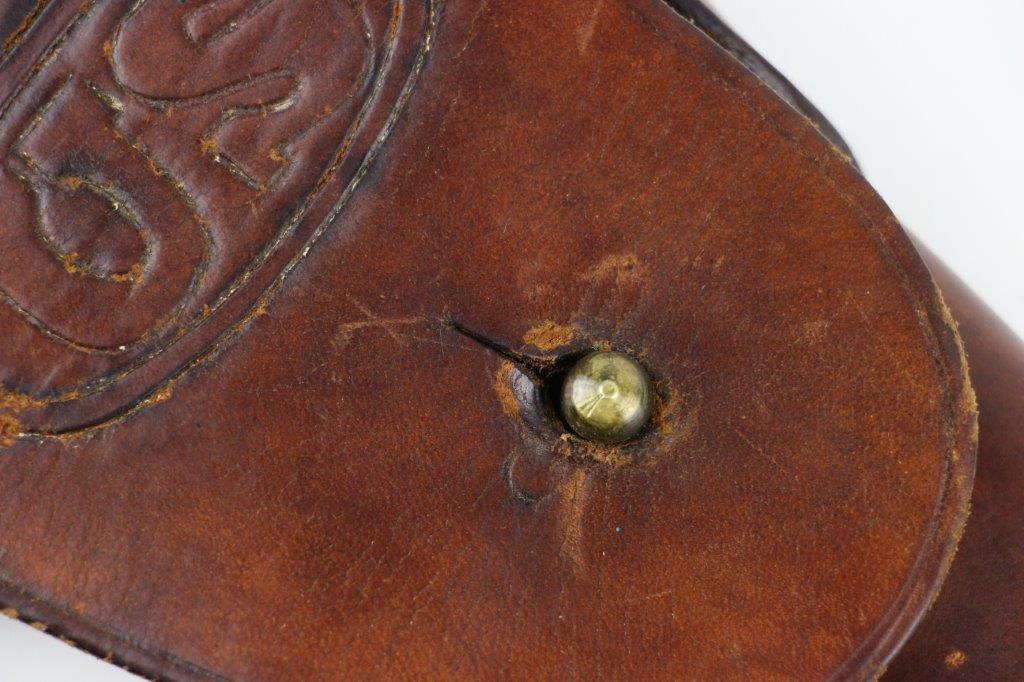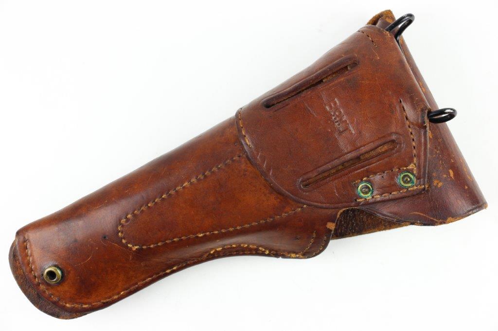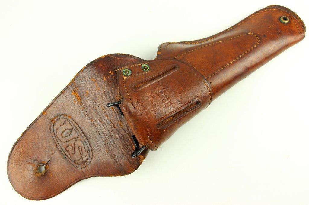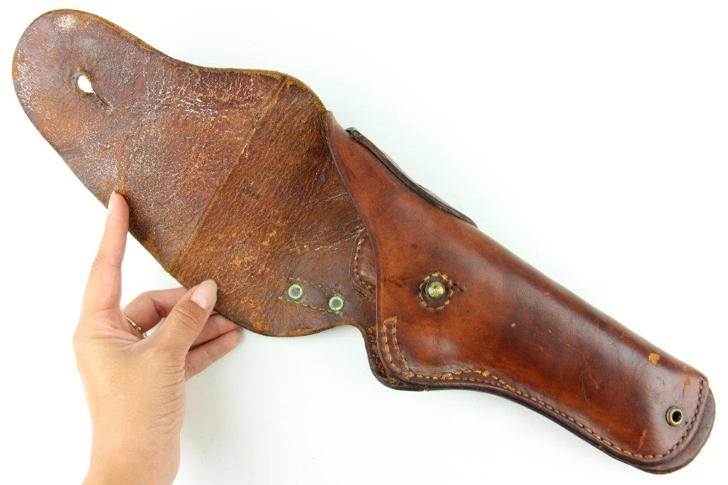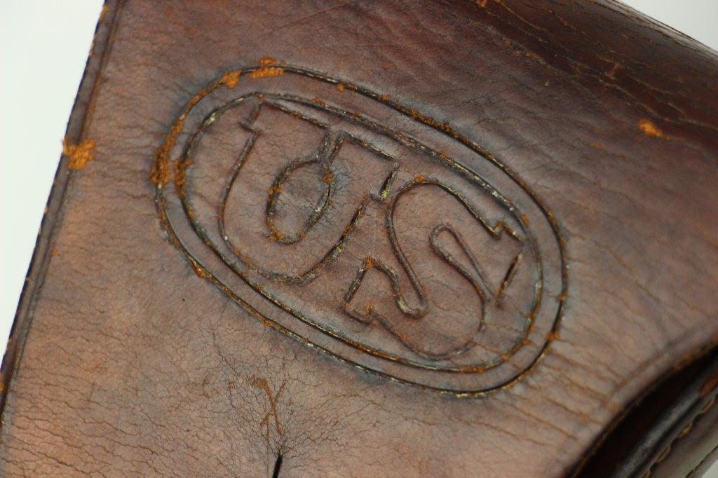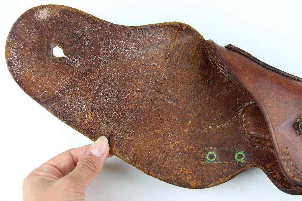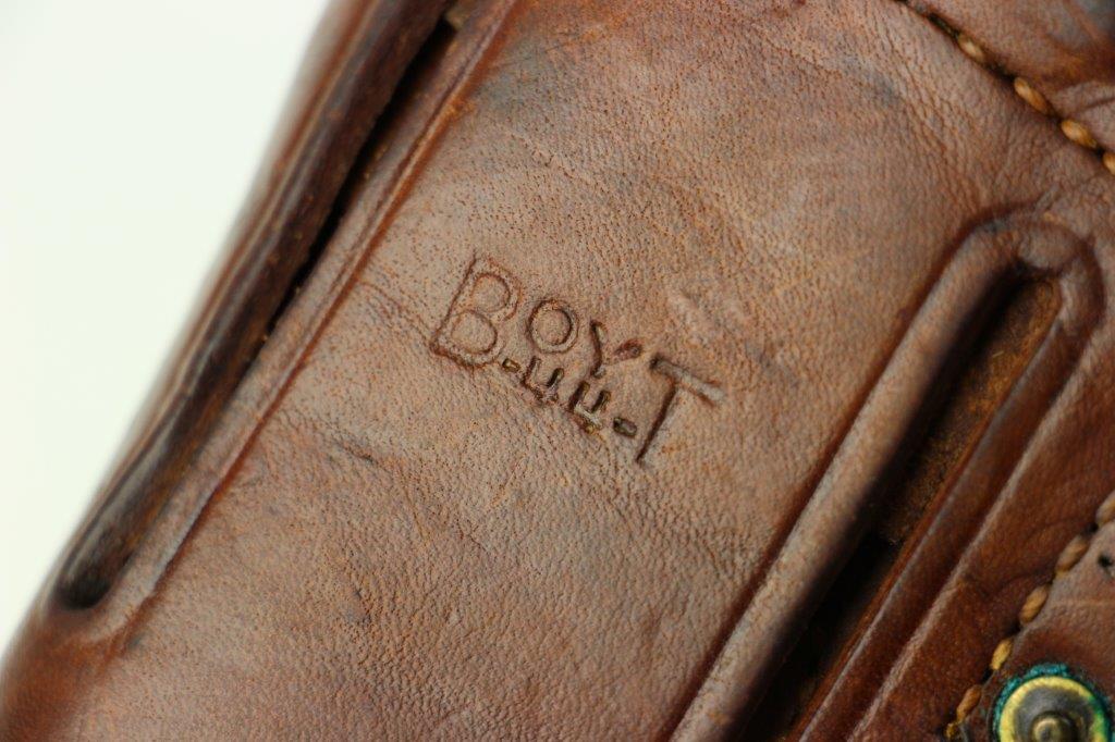8/12/24 – This is an original WW2 US M1916 holster for the M1911A1 pistol. The holster is in very good overall condition with surface wrinkling and scuffing, mostly located at the top leather around the bended portion of leather. The front of the holster is “US” marked. This marking is a slightly different style than other examples we’ve encountered, and we’re not sure if this is significant. The back of the holster is maker and date stamped “BOYT 44”. All original stitching is tight throughout. Brass closure knob and normal use wear.