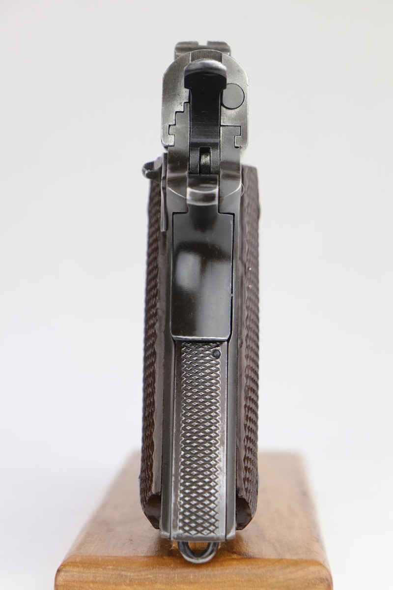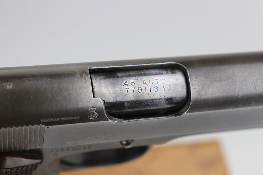 3/25/20 – This is an Army Colt 1911A1 that was manufactured in 1944. It has original finish and proper American inspector proofs on slide and frame. There’s a general thinning overall, but the front strap is the thinnest area. The pistol ended up in the hands of the British government/military as part of the lend-lease program, as the right side of the frame and slide have various English proofs, including ‘RELEASED BRITISH GOVT. 1952’ on slide, and ‘NOT ENGLISH MAKE’ on frame. The pistol has all the original parts except for the barrel, which appears to be a commercial barrel that received a lot number at some point in the process. The bore is terrific though, so this could be a good shooter. Excellent grips and a ‘G’ marked mag on the toe.