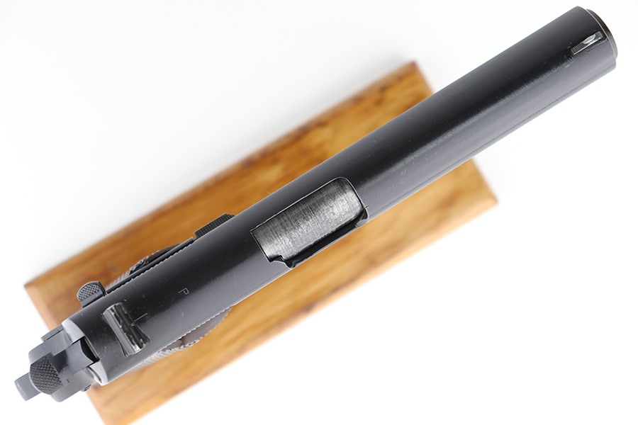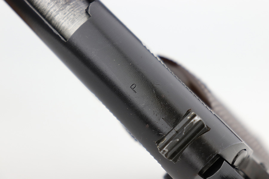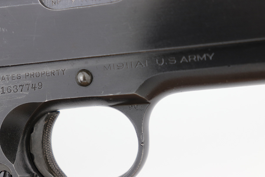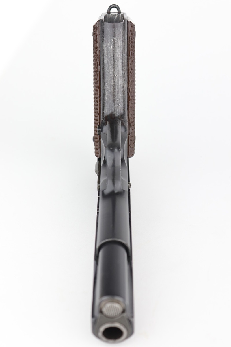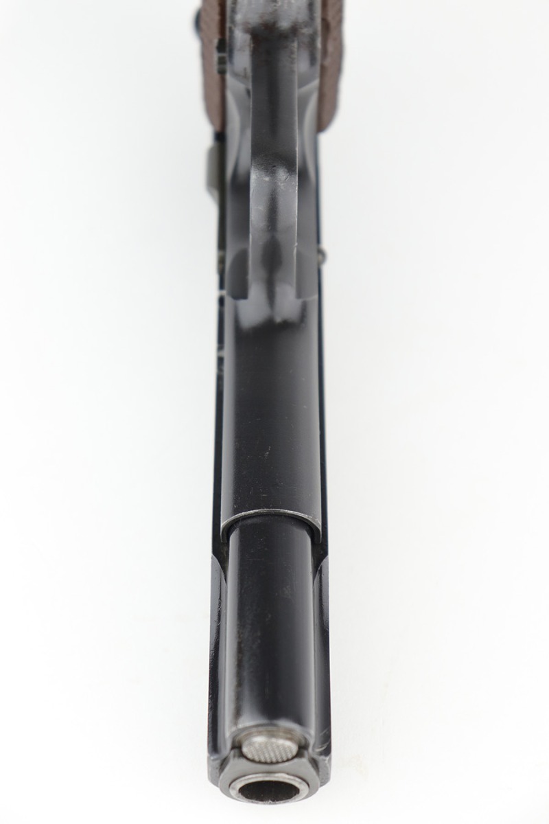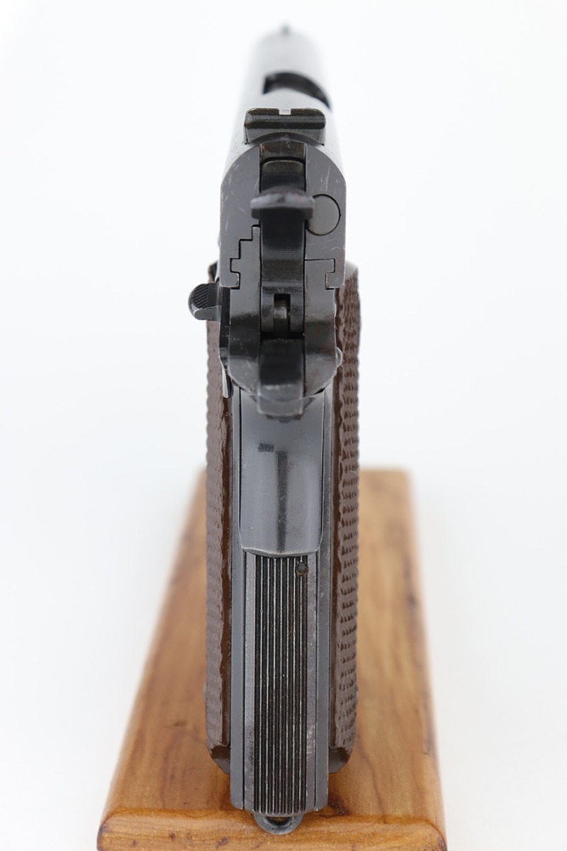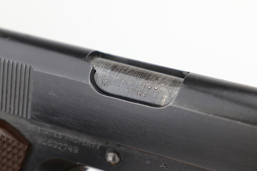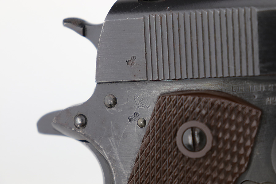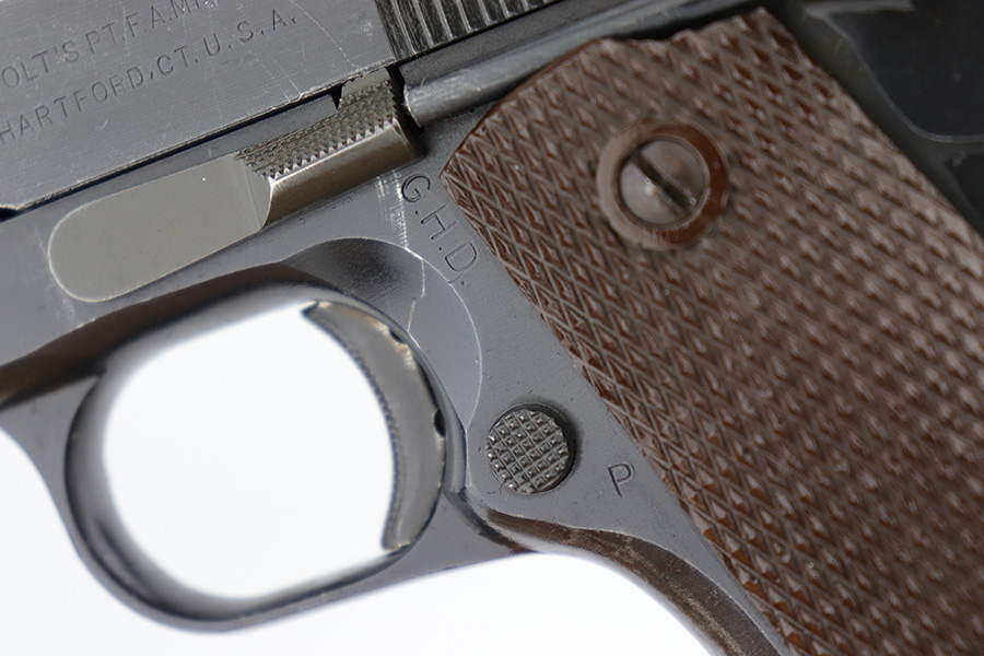 1/16/23 – This is a U.S. Army issued and inspected Colt 1911A1 from 1944 that was sent to Britain as part of the lend-lease program. It has the proper U.S. military inspectors marks, and British proofs are visible on the right rear of the frame and slide, as well as the barrel. Proper Colt barrel with a “G” under the lug. It has retained about 93-94% of its parkerized finish. The majority of the finish loss is on the front strap, where there is also some spotty oxidation and a few small dings. One tiny spot of discoloration on the left side of the slide. Fitted with very nice period-correct reddish bakelite grips and comes with one magazine. The bore has good rifling, but there is light spotty oxidation throughout.