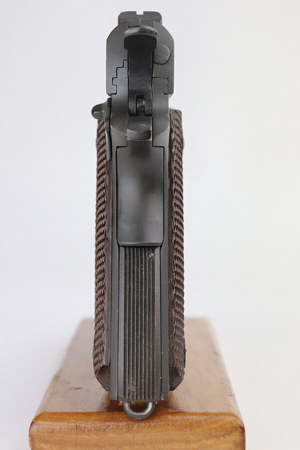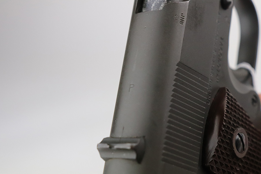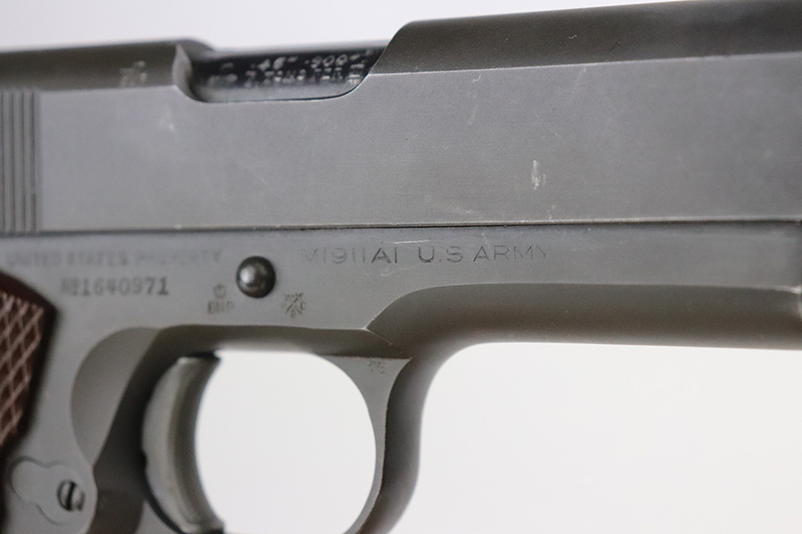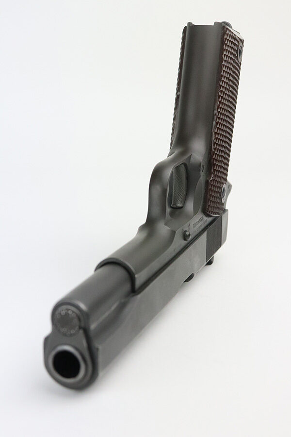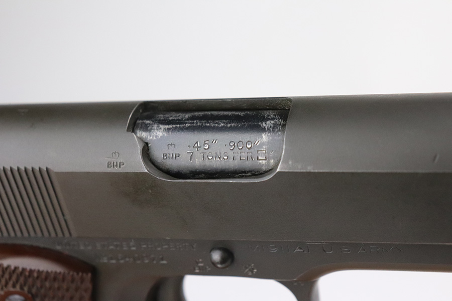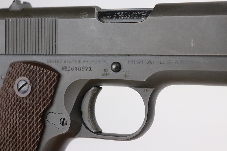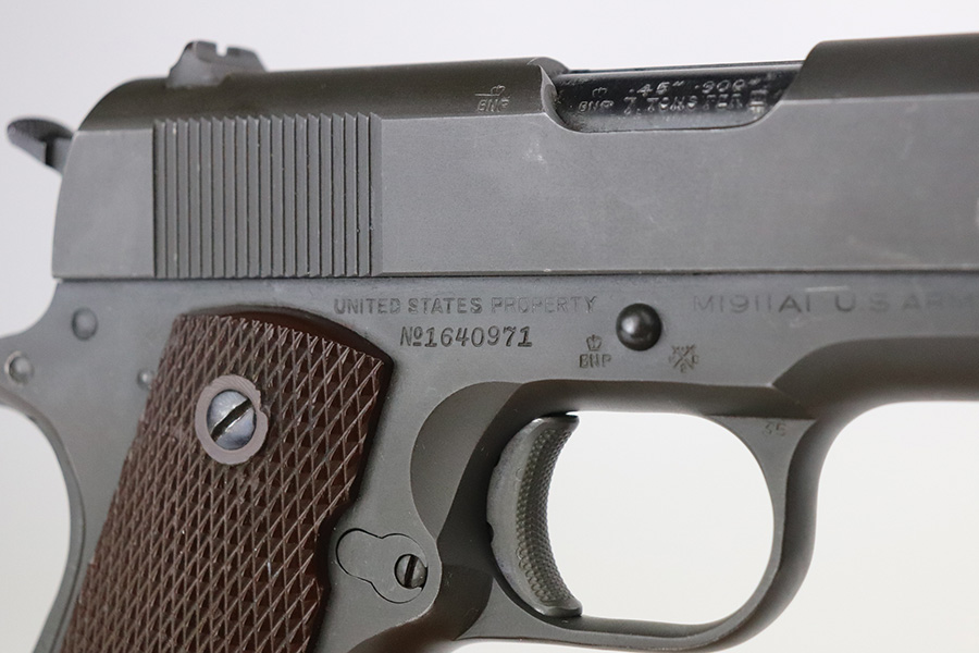 7/27/21 – This is a minty example of a Colt Model 1911A1 manufactured in 1944. It is all-correct, has the proper “United States Property” marking, and the proper US military cross-canon cartouche. This one, however, has British proofs throughout, indicating it was part of the WW2 British Lend-Lease Program. Colt Auto .45 barrel. It has retained about 98% of its parkerized finish with hints of wear on the high edges of the slide and around the muzzle. Some areas of minor discoloration on the right side of the gun and a few tiny dots of patina on the left side of the slide. Comes with excellent grips and a period-correct magazine. Excellent shiny bore with strong rifling.
