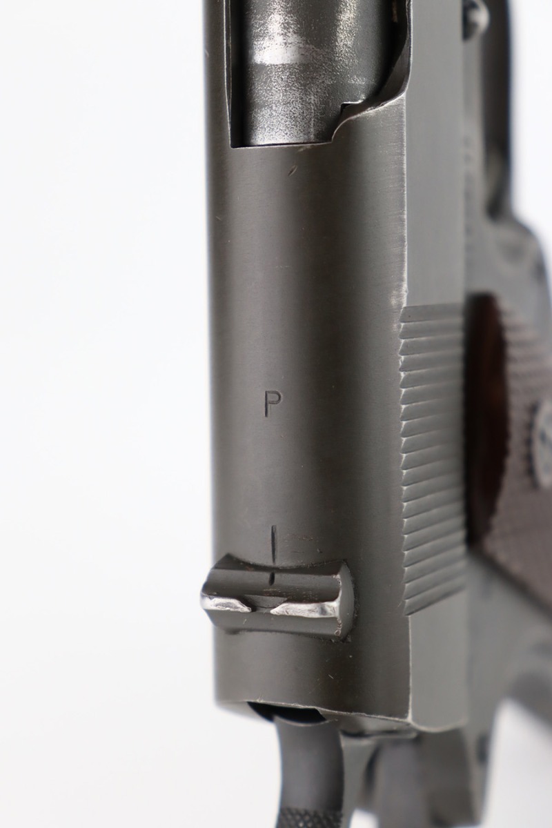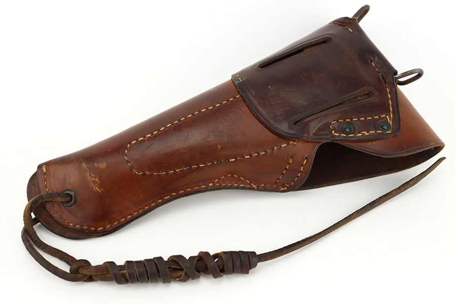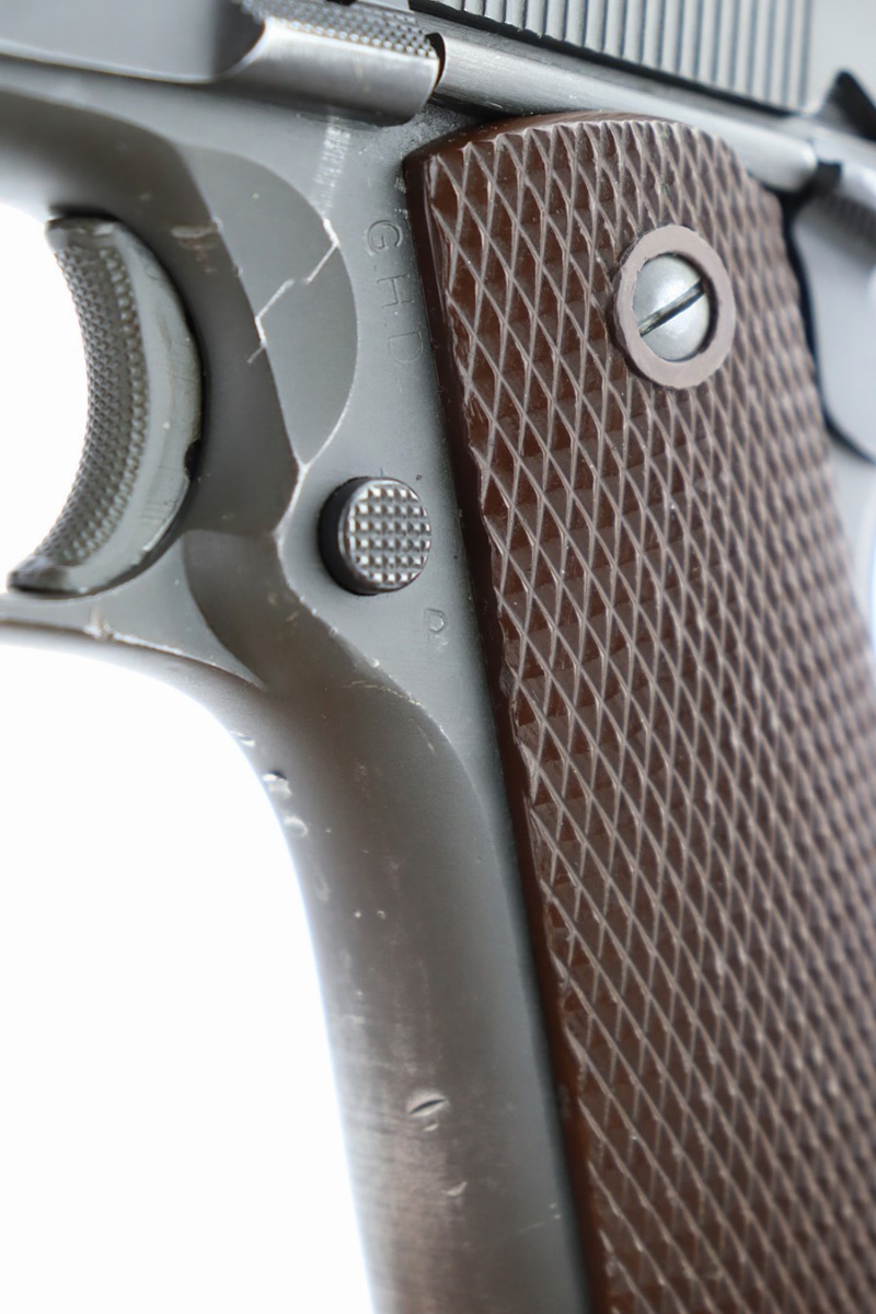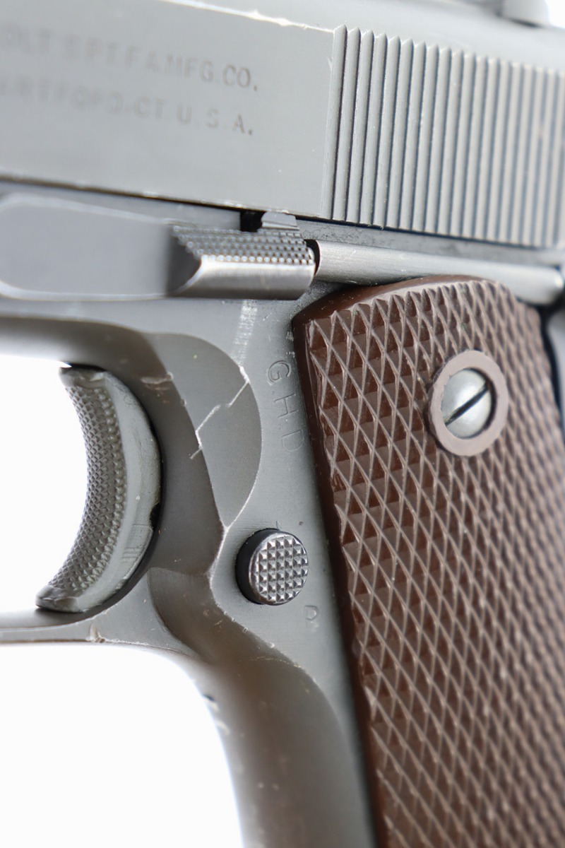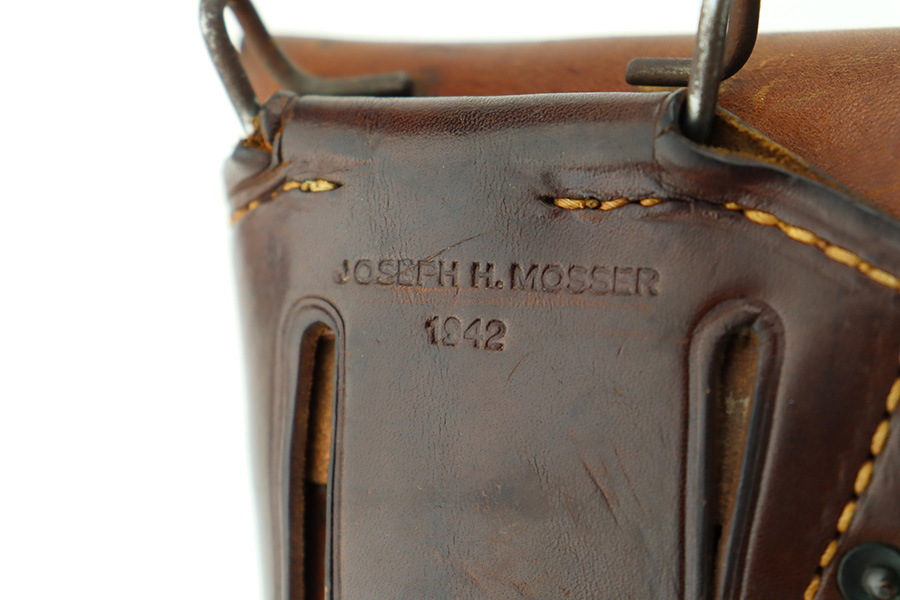12/26/23 – This is a very nice Colt 1911A1 issued to the US military in 1944. It is “United States Property” marked, has the proper GHD initials, and has a cross-canon military cartouche. Correct “Colt 45 Auto” barrel that has been parkerized. The original finish rates about 93% with general high edge wear and some thinning and a few small dings on the front strap. Fitted with period-correct reddish plastic grips. Excellent bore with strong rifling. Comes as a rig with one “S” marked magazine, a 1942-dated Joseph Mosser holster, and an original leather lanyard.