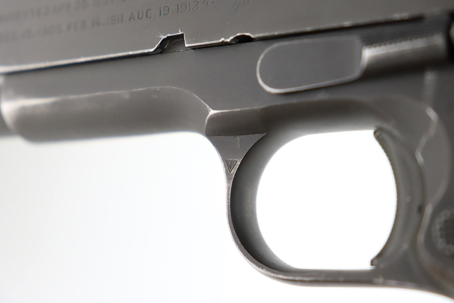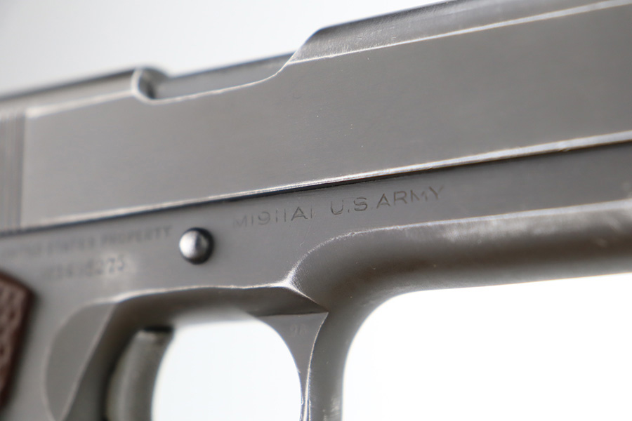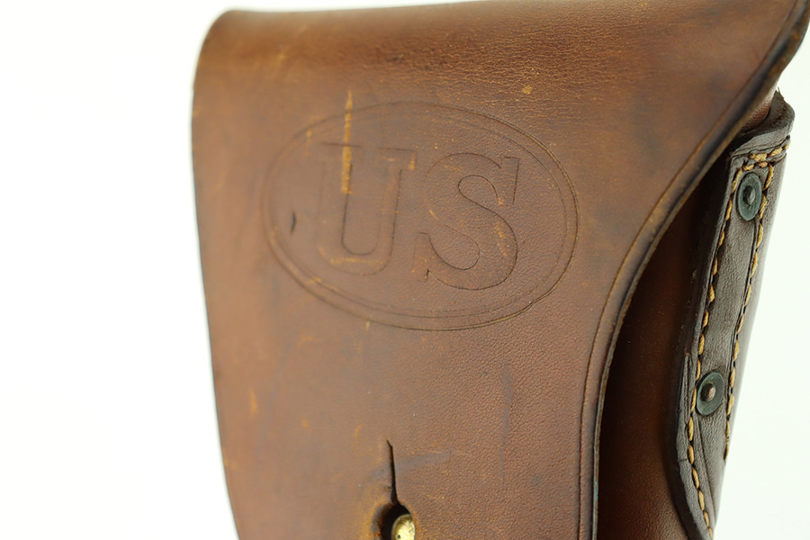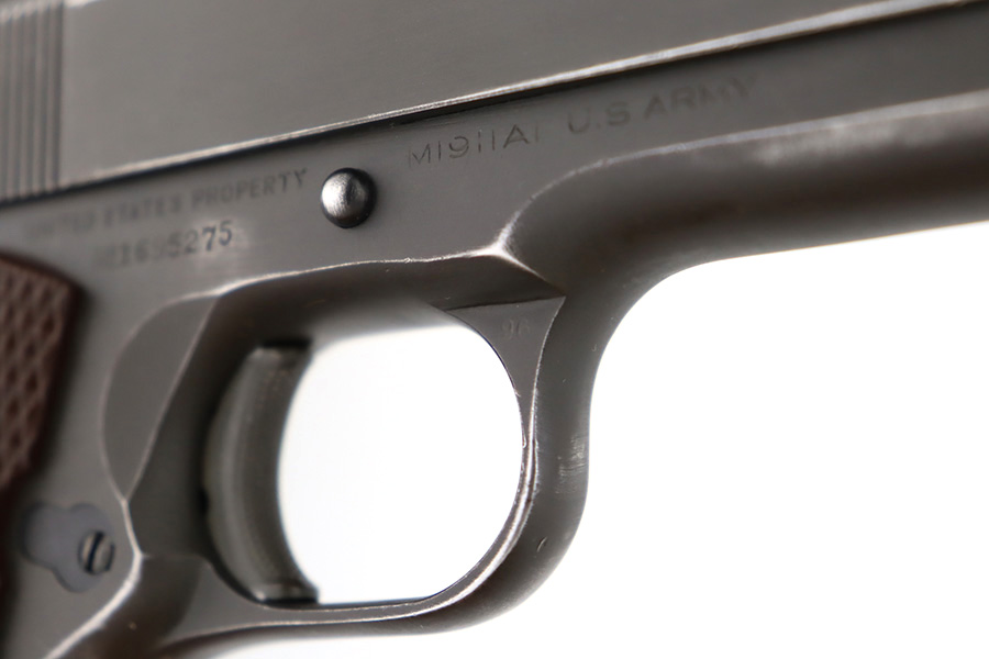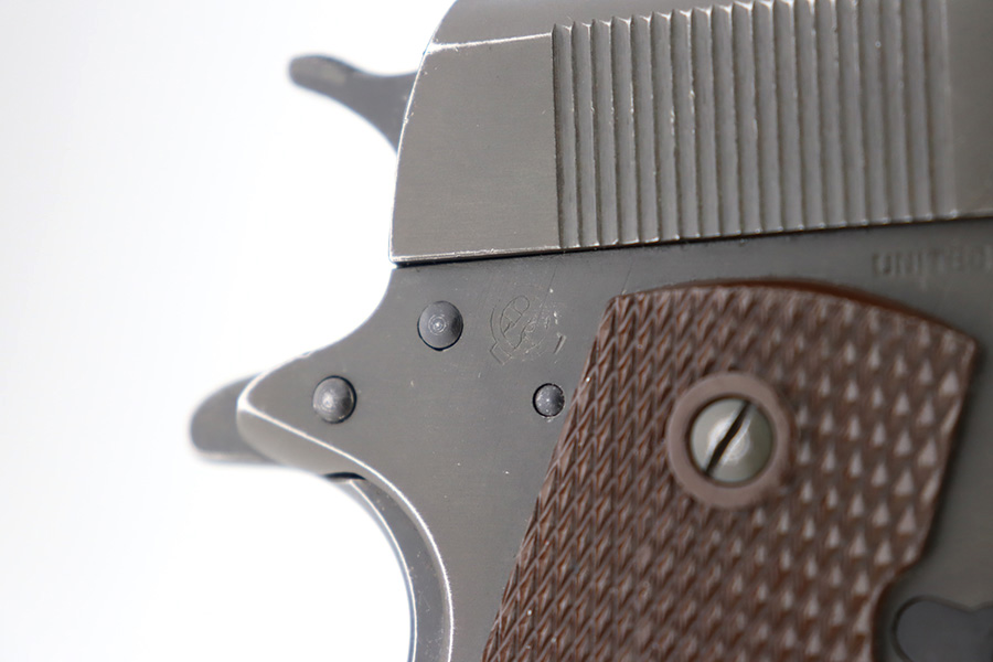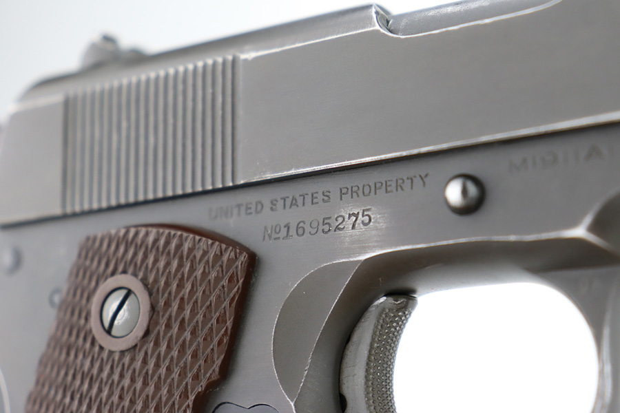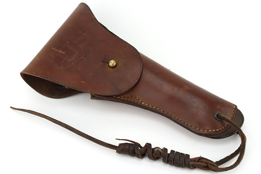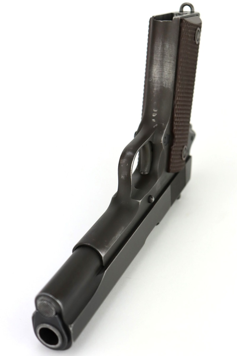 12/26/23 – This is a very nice Colt 1911A1 issued to the US military in 1944. It is “United States Property” marked, has the proper GHD initials, and has a cross-canon military cartouche. Correct “Colt 45 Auto” barrel that has been parkerized. The original finish rates about 93% with general high edge wear and some thinning and a few small dings on the front strap. Fitted with period-correct reddish plastic grips. Excellent bore with strong rifling. Comes as a rig with one “S” marked magazine, a 1942-dated Joseph Mosser holster, and an original leather lanyard.