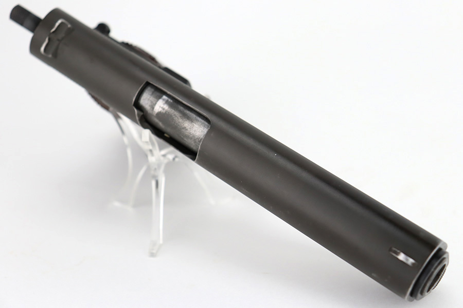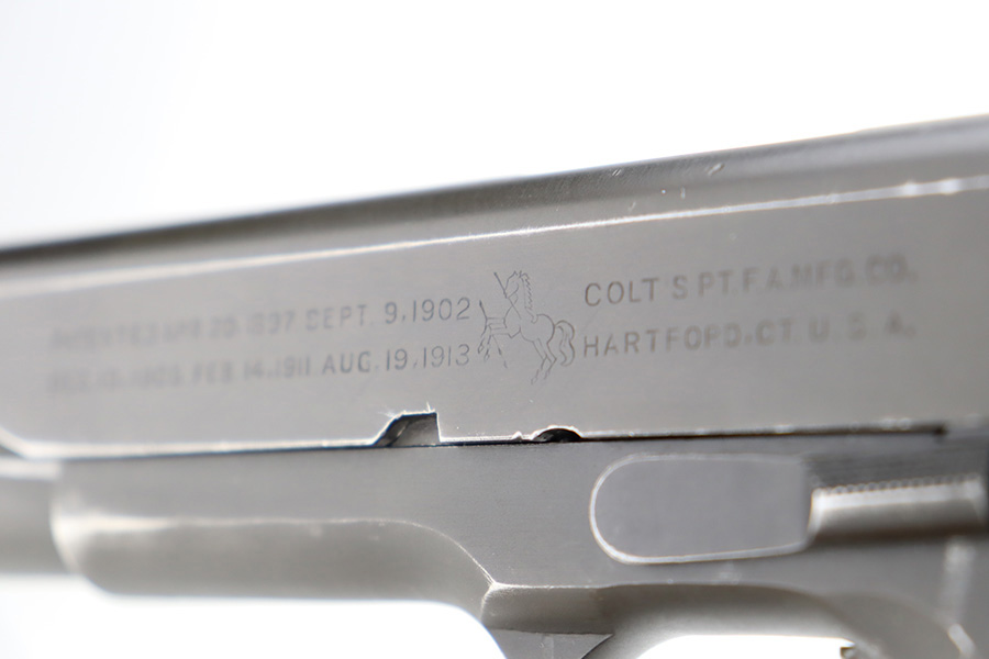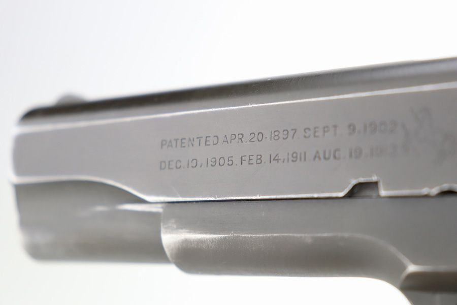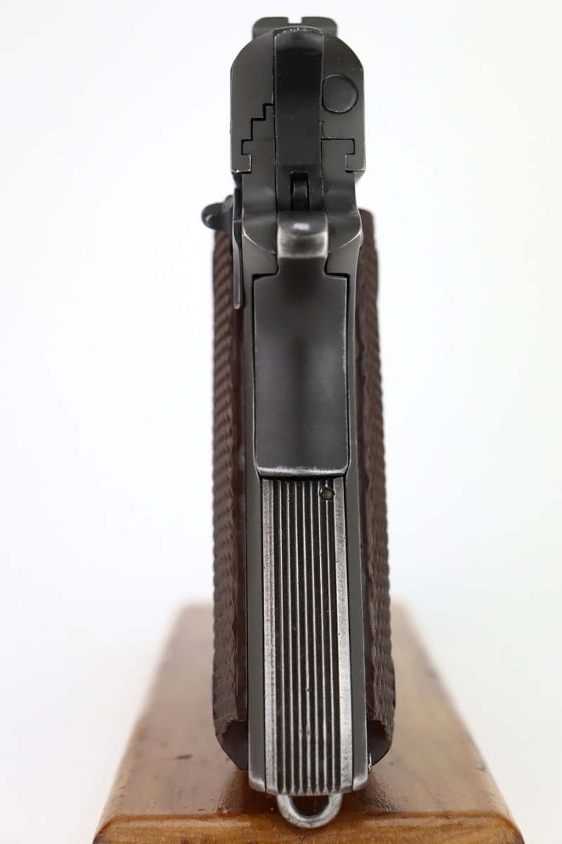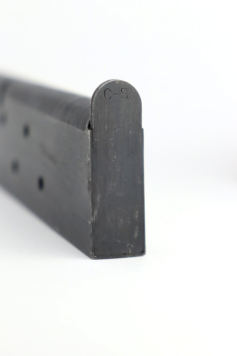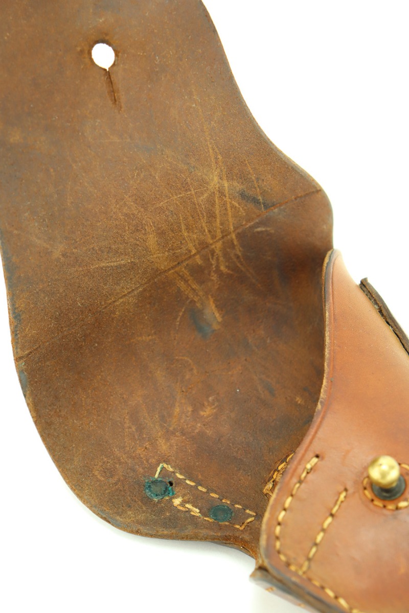 12/26/23 – This is a very nice Colt 1911A1 issued to the US military in 1944. It is “United States Property” marked, has the proper GHD initials, and has a cross-canon military cartouche. Correct “Colt 45 Auto” barrel that has been parkerized. The original finish rates about 93% with general high edge wear and some thinning and a few small dings on the front strap. Fitted with period-correct reddish plastic grips. Excellent bore with strong rifling. Comes as a rig with one “S” marked magazine, a 1942-dated Joseph Mosser holster, and an original leather lanyard.