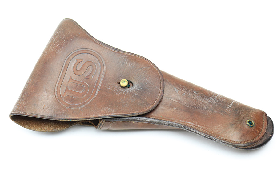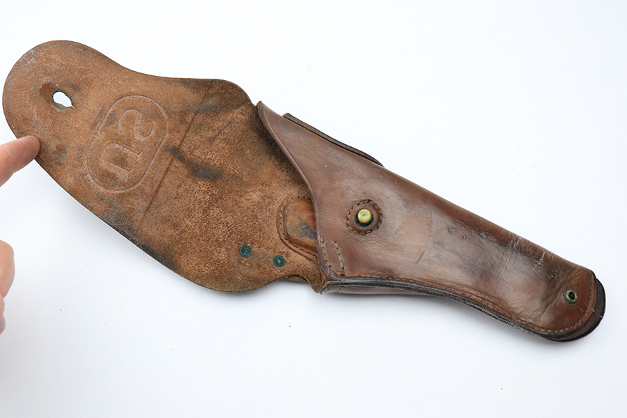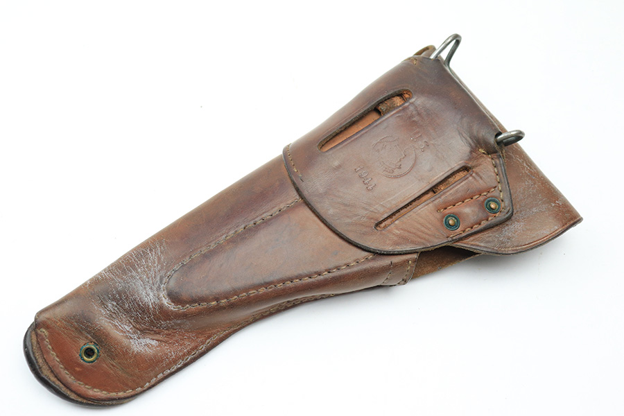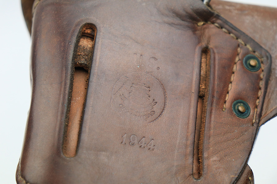 5/11/22 – This is an original 1911A1 holster from 1944. The holster is maker stamped and dated on the back leather by Craighead. The leather is pliable with some mild surface wrinkling but no excessive wear or damage. Excellent stitching throughout.