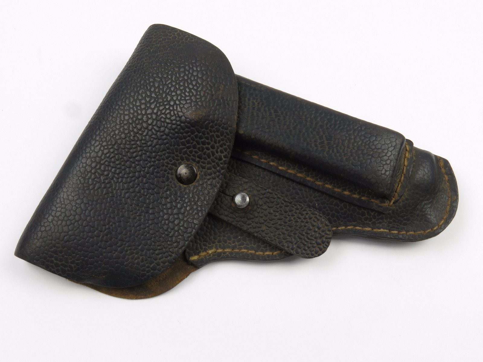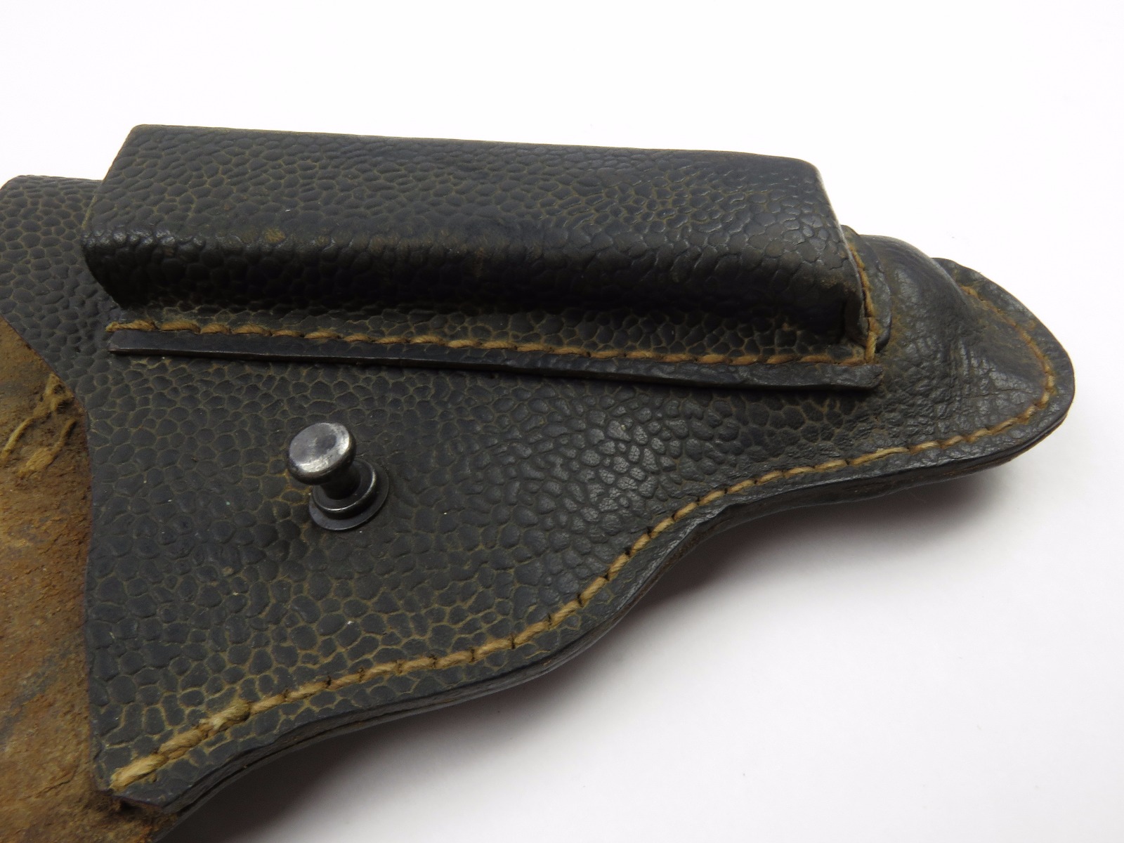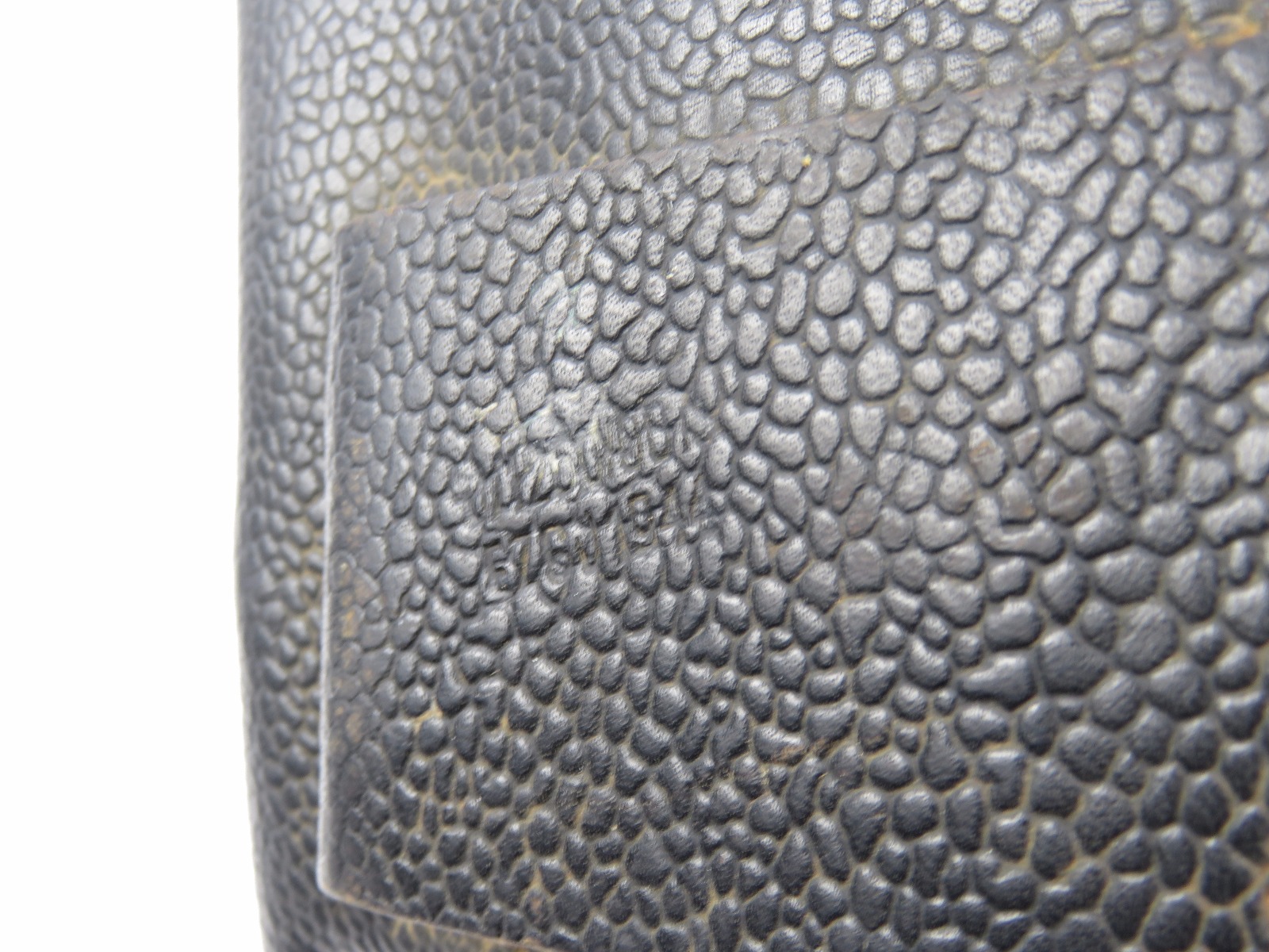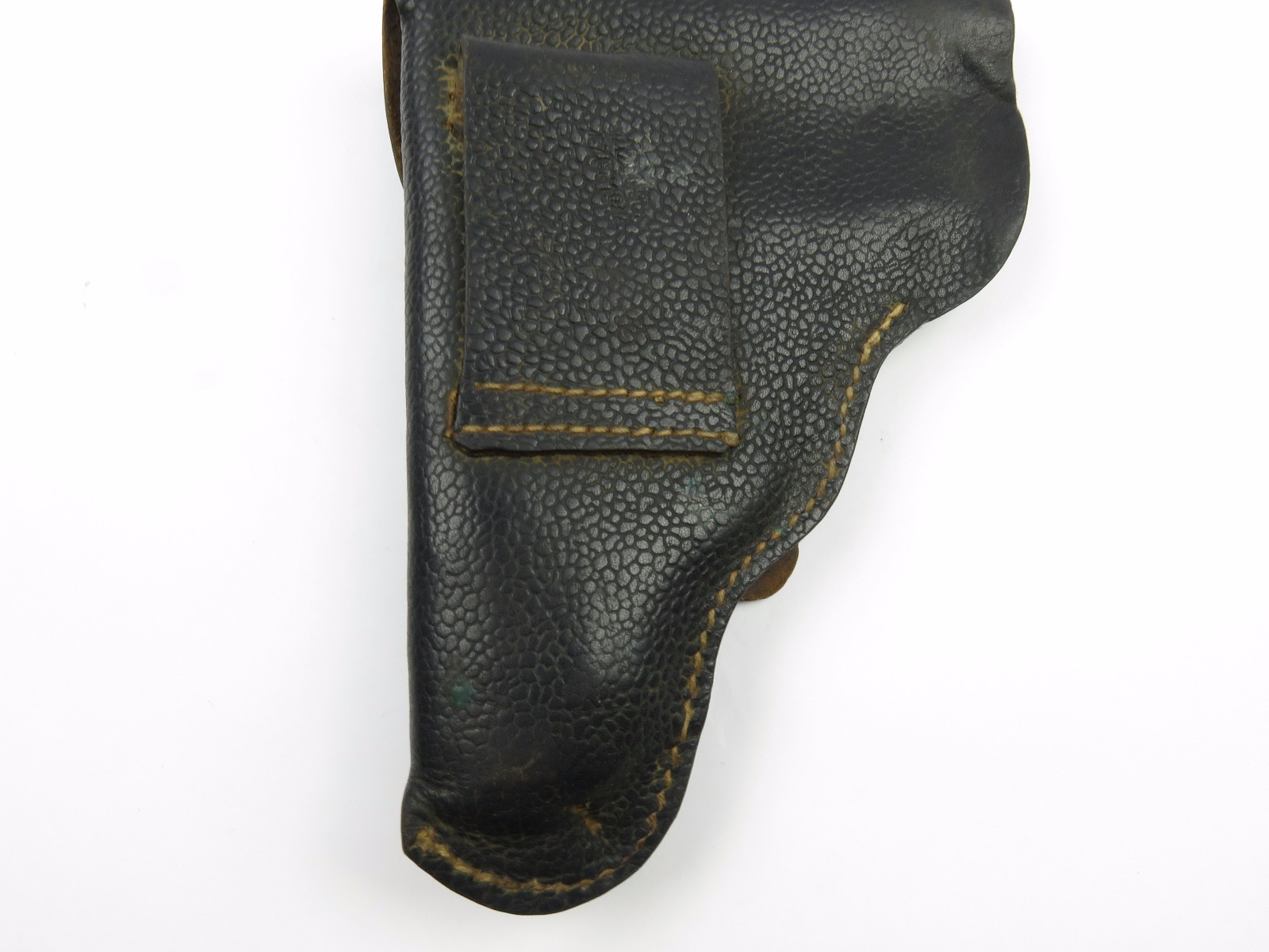 11/3/17 – This is a pebble grain leather CZ model 27 holster. The holster has firm leather but is worn due to holding a pistol and aging. The back belt loop is stamped with a unit marking (probably police) and underneath is “EZGJ 1944”. The stitching is all tight and original. The leather is completely in tact with some normal exterior wear. The interior leather is a little rugged, but clean overall.