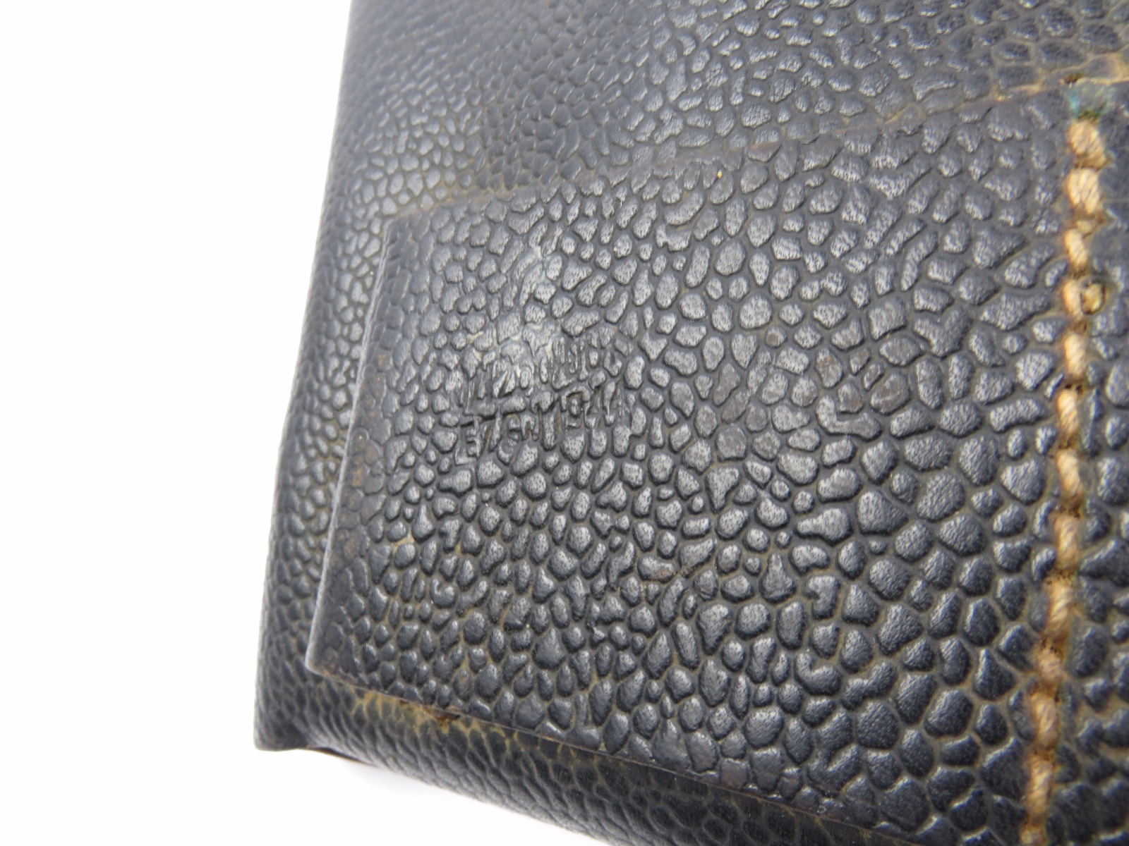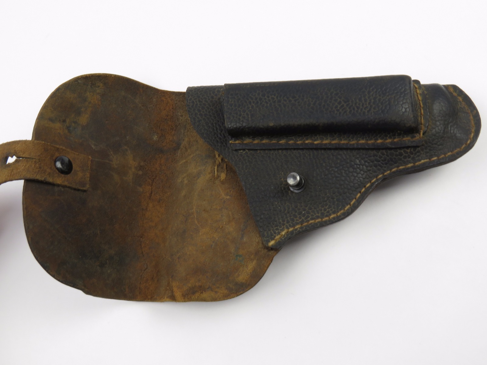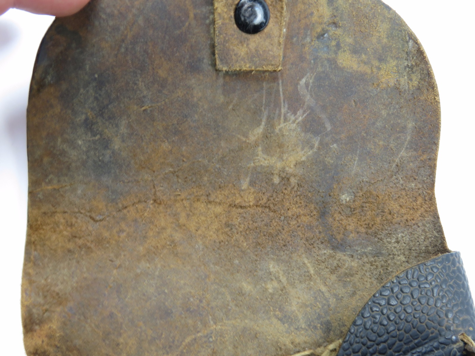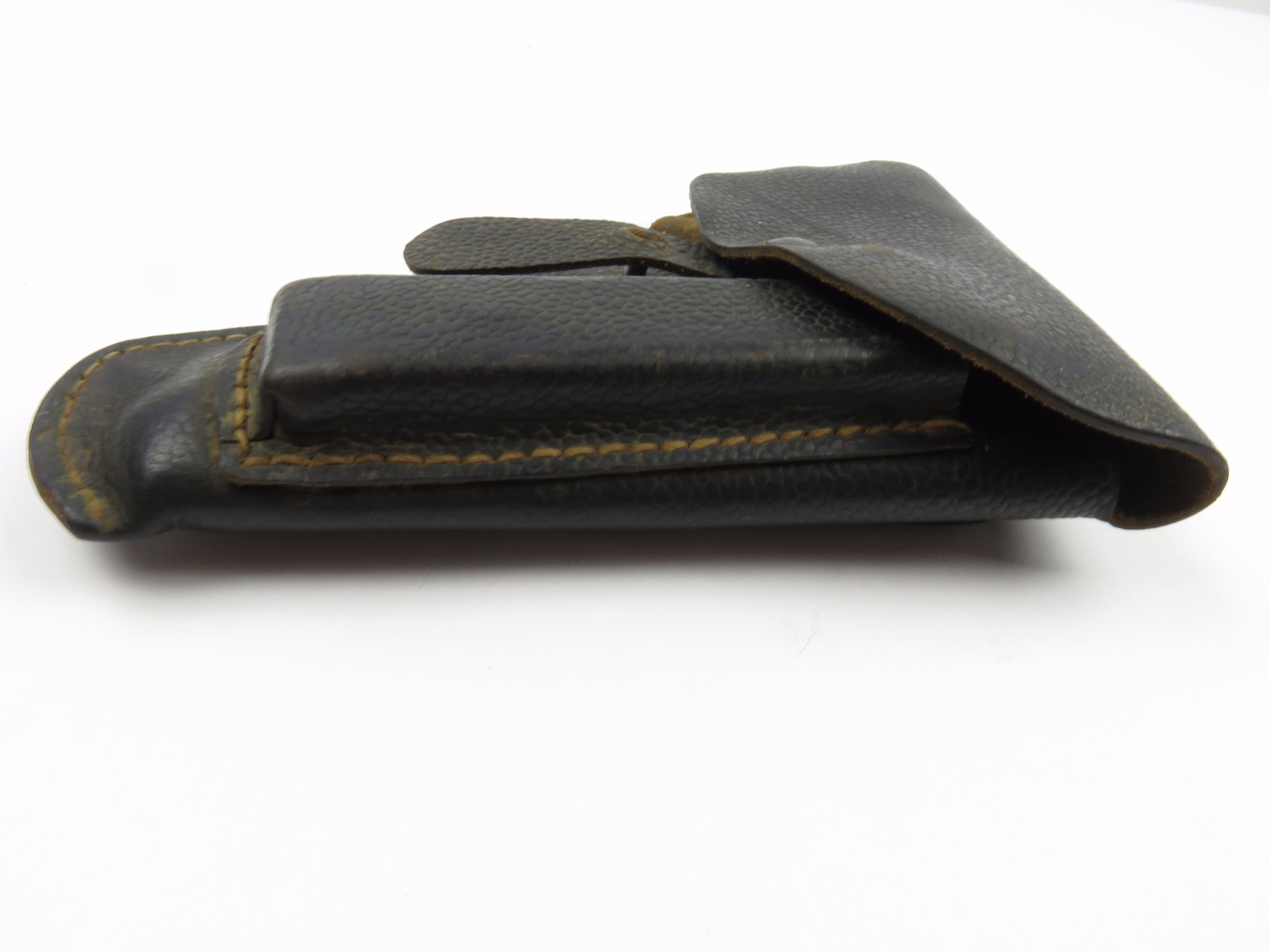 11/3/17 – This is a pebble grain leather CZ model 27 holster. The holster has firm leather but is worn due to holding a pistol and aging. The back belt loop is stamped with a unit marking (probably police) and underneath is “EZGJ 1944”. The stitching is all tight and original. The leather is completely in tact with some normal exterior wear. The interior leather is a little rugged, but clean overall.