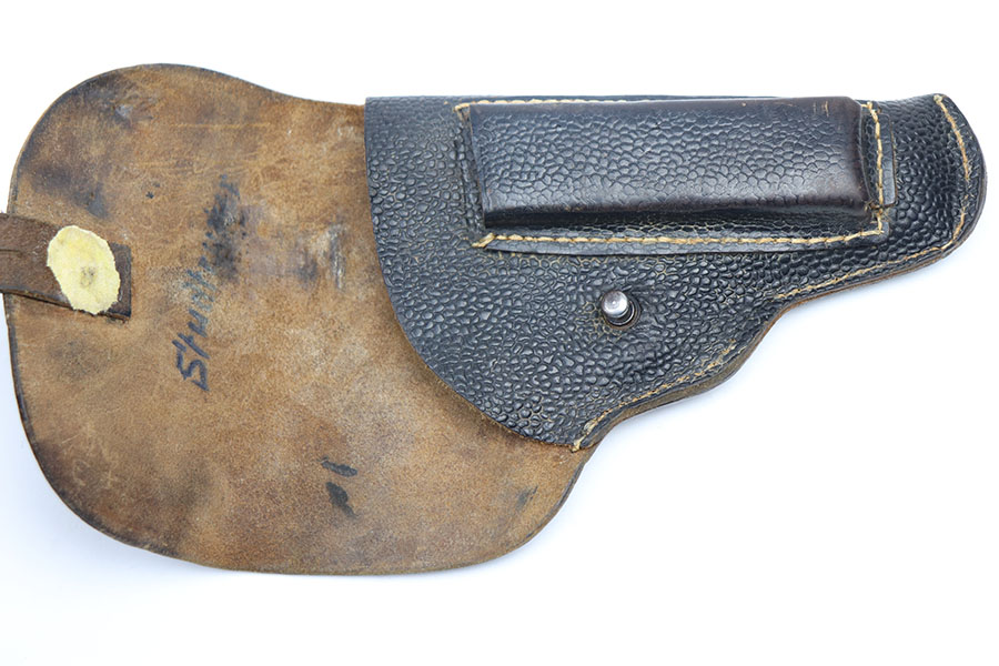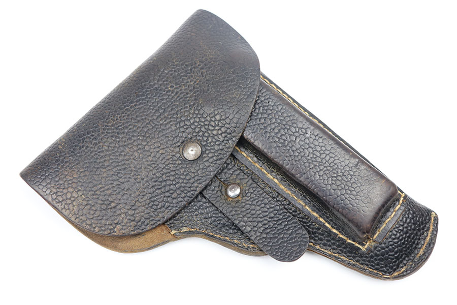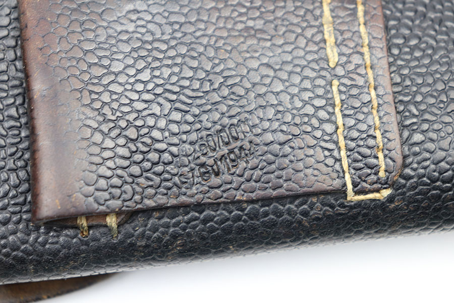 4/7/21 – This is an original 1944 dated CZ-27 holster. Nice black pebble grain leather. Some mild surface wear and aging but no major issues. The back belt loop shows a unit / manufacture number along with a date stamp. The stitching is all original and in tact.