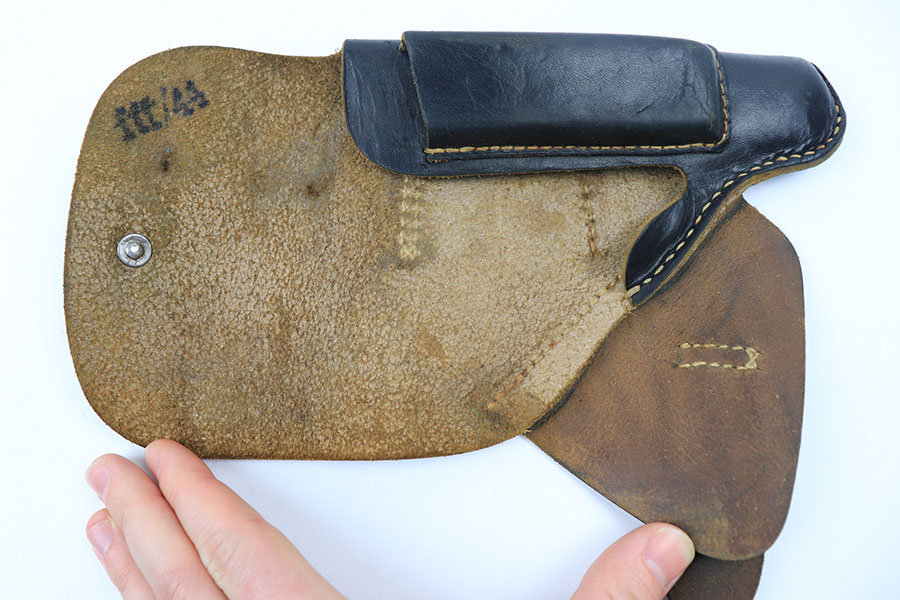 4/29/21 – This is an original late WW2 production holster for a Mauser HSC or similar sized 7.65mm axis pistol. The holster is ink stamped on the interior leather. There’s some mild signs of aging and previous use but no major wear or damage to the leather. Stitching is tight and intact.