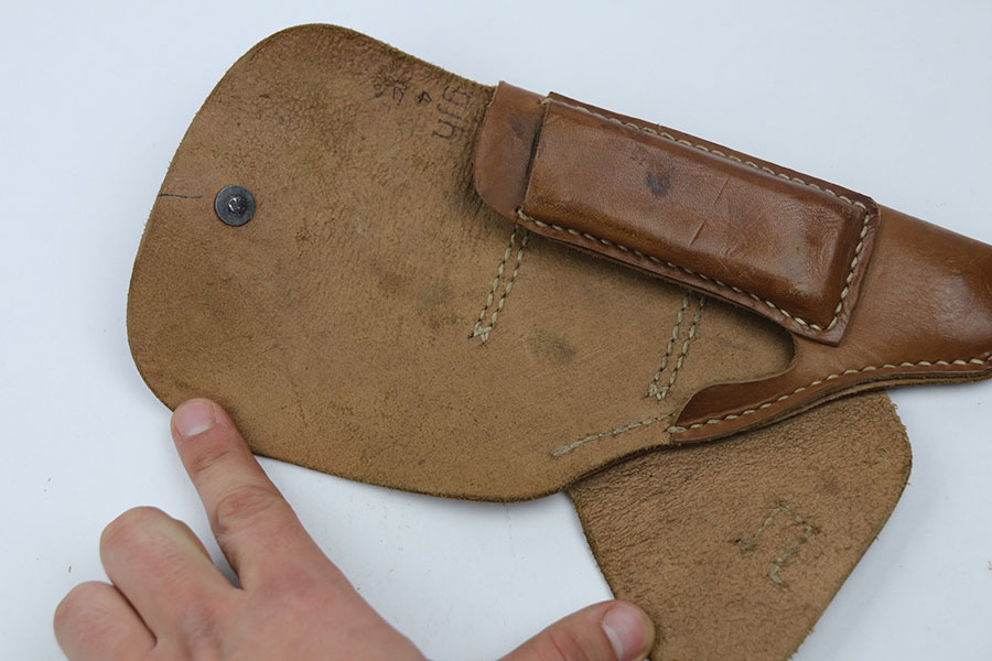 1/6/21 – This is a late WW2 production holster for a Mauser HSC, Sauer 38h or similar sized 7.65mm pistol. The holster has light brown leather in great overall condition and all stitching in tact. The interior leather is maker stamped “glh” and dated 1944 with a waffen military eagle proof stamp.