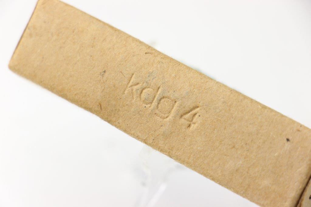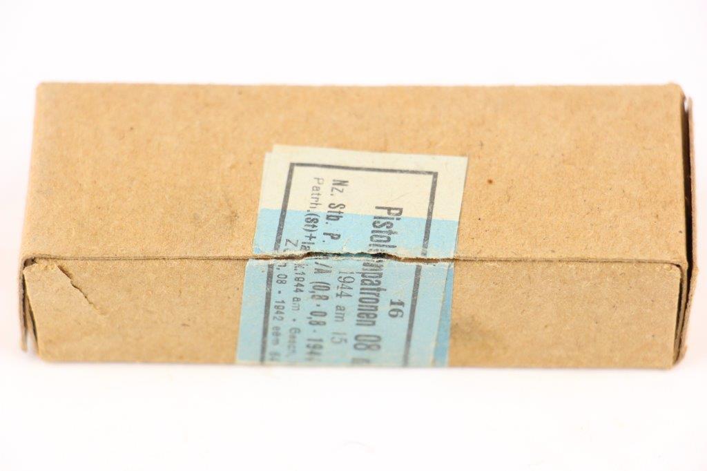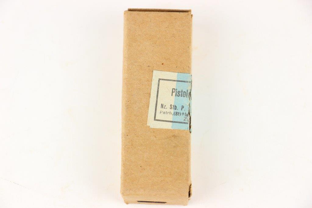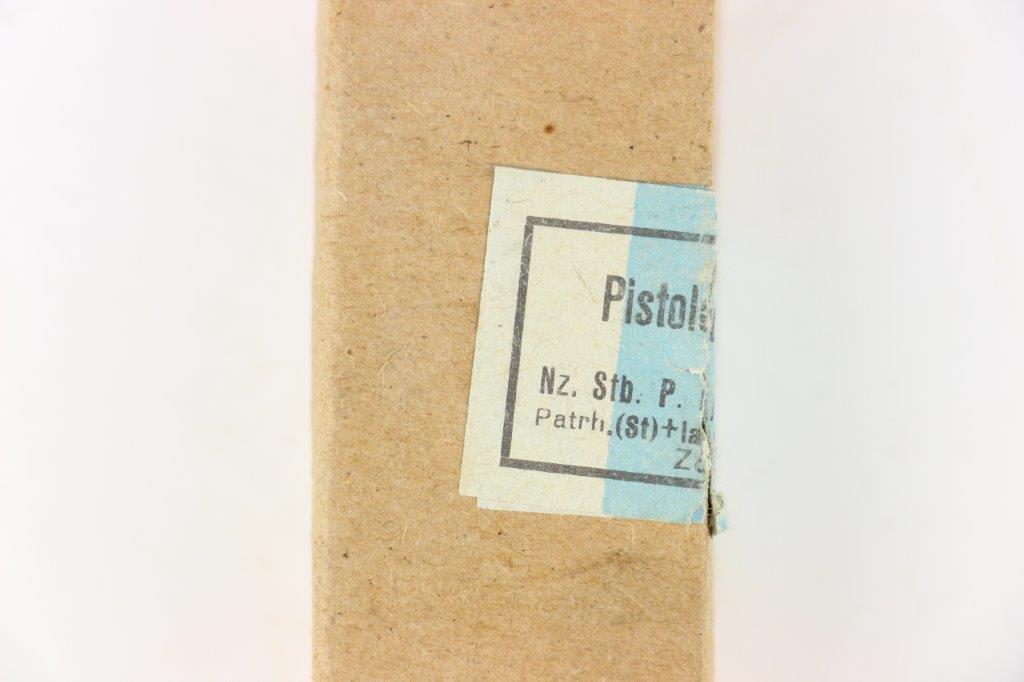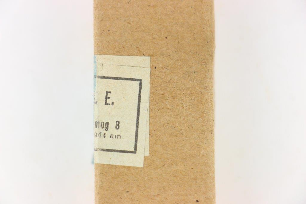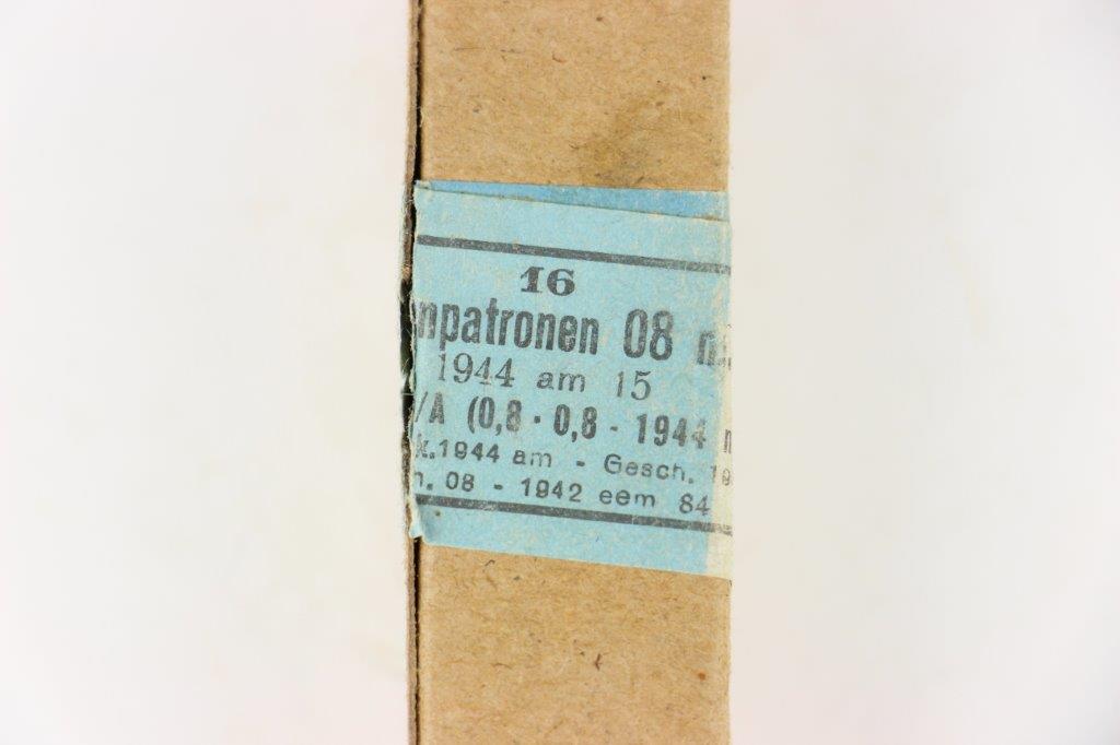 7/29/24 – This is an original box of 9mm German ammunition. Perfect for pairing with a P.38 or Luger (P.08) pistol. The box contains 16 rounds of original ammunition, with each round in excellent condition and “44” dated on the head stamp, as shown (some rounds are ’43’ dated). The box has the original label intact and 1 staple on each side keeping the box together. The staples show natural patina. The underside of the box is maker and date stamped, “kdg4”. Light surface wear on the box exterior and one small tear, but overall the box is in great shape.