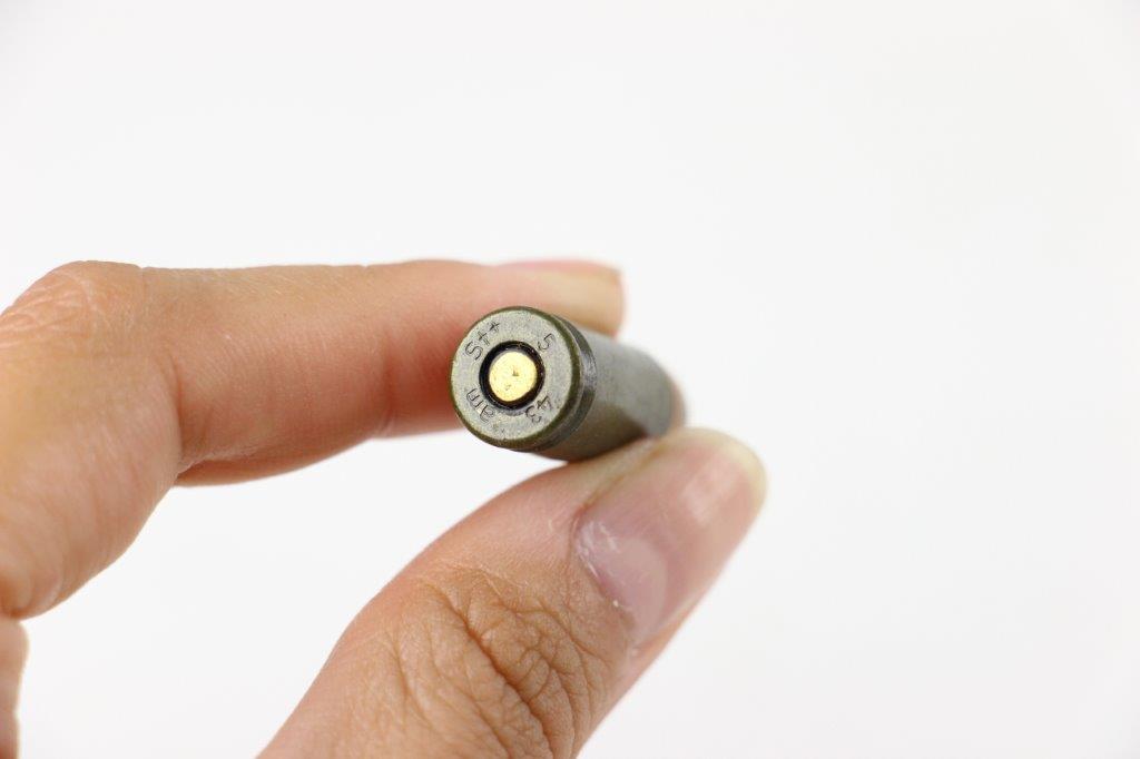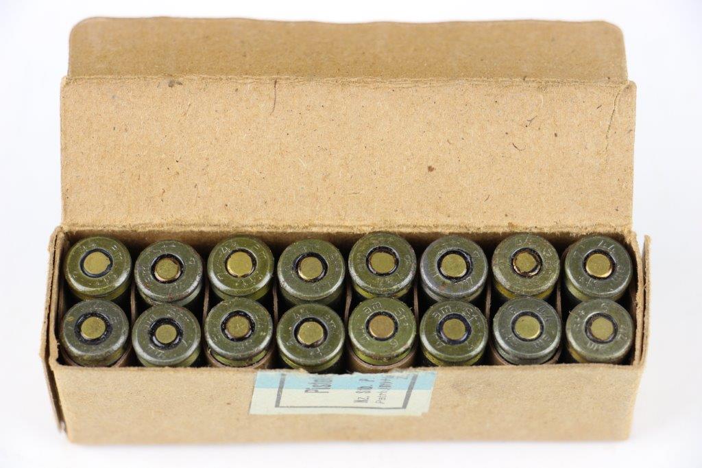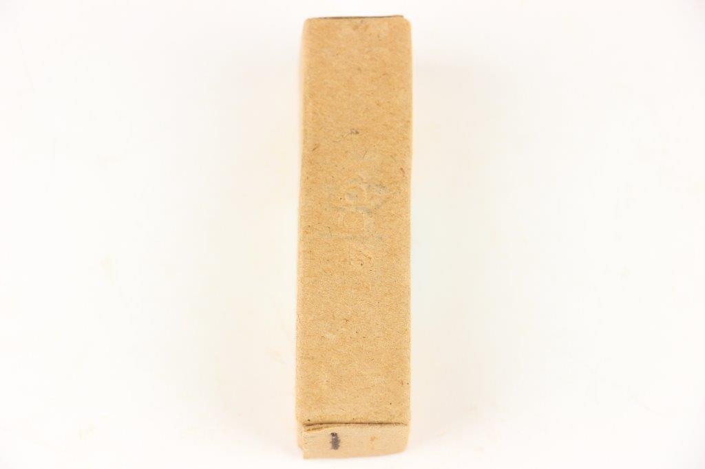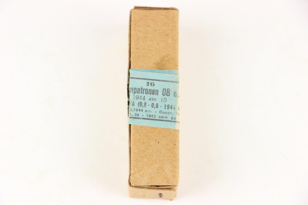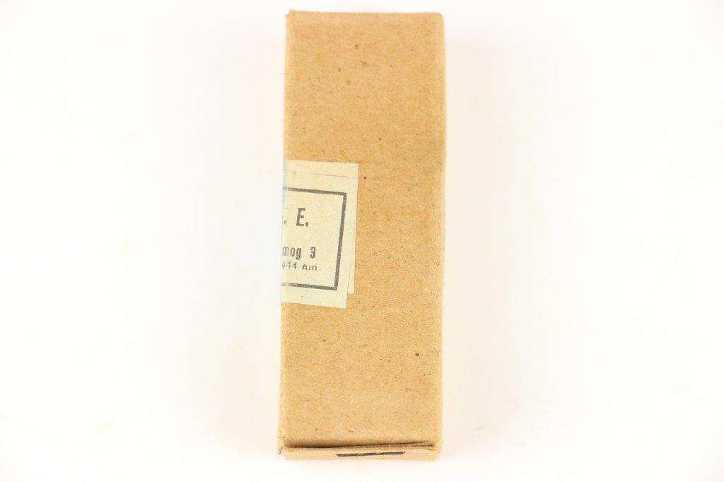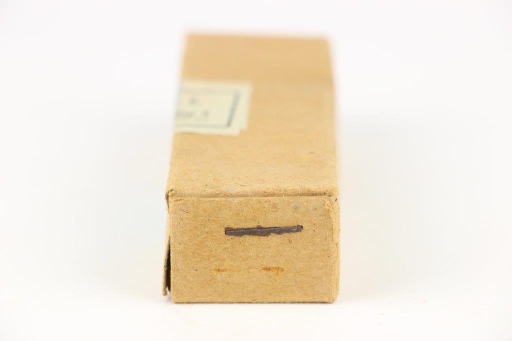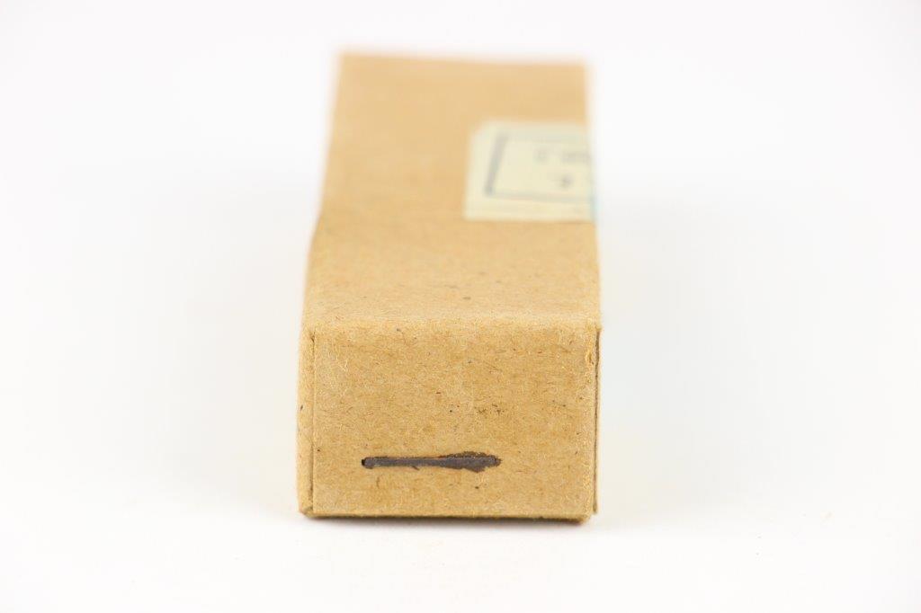 7/29/24 – This is an original box of 9mm German ammunition. Perfect for pairing with a P.38 or Luger (P.08) pistol. The box contains 16 rounds of original ammunition, with each round in excellent condition and “44” dated on the head stamp, as shown (some rounds are ’43’ dated). The box has the original label intact and 1 staple on each side keeping the box together. The staples show natural patina. The underside of the box is maker and date stamped, “kdg4”. Light surface wear on the box exterior and one small tear, but overall the box is in great shape.
